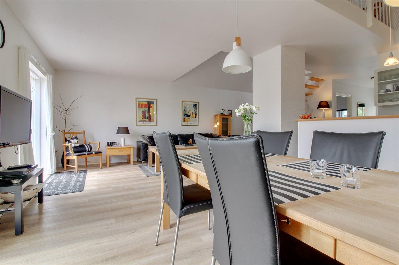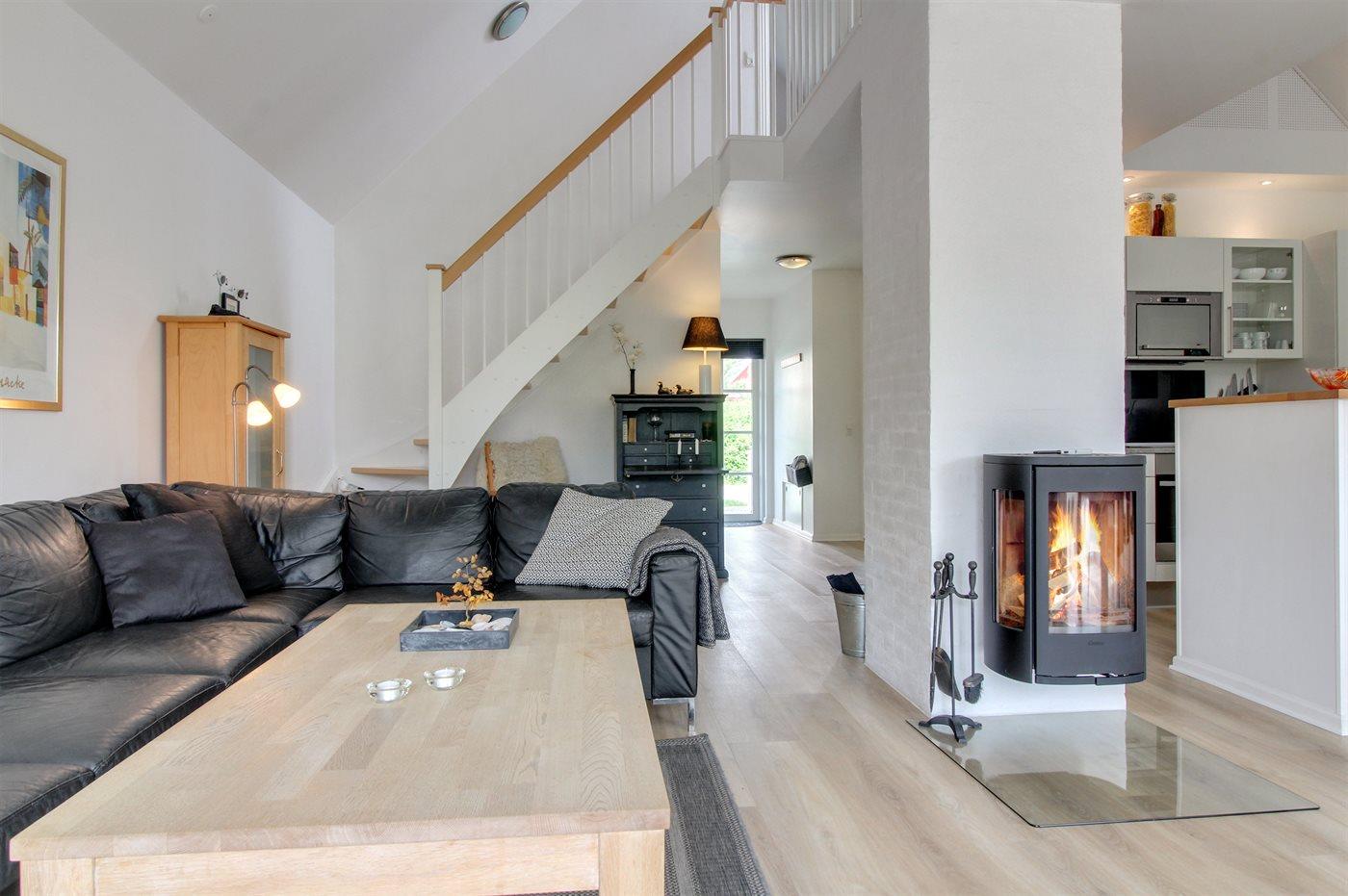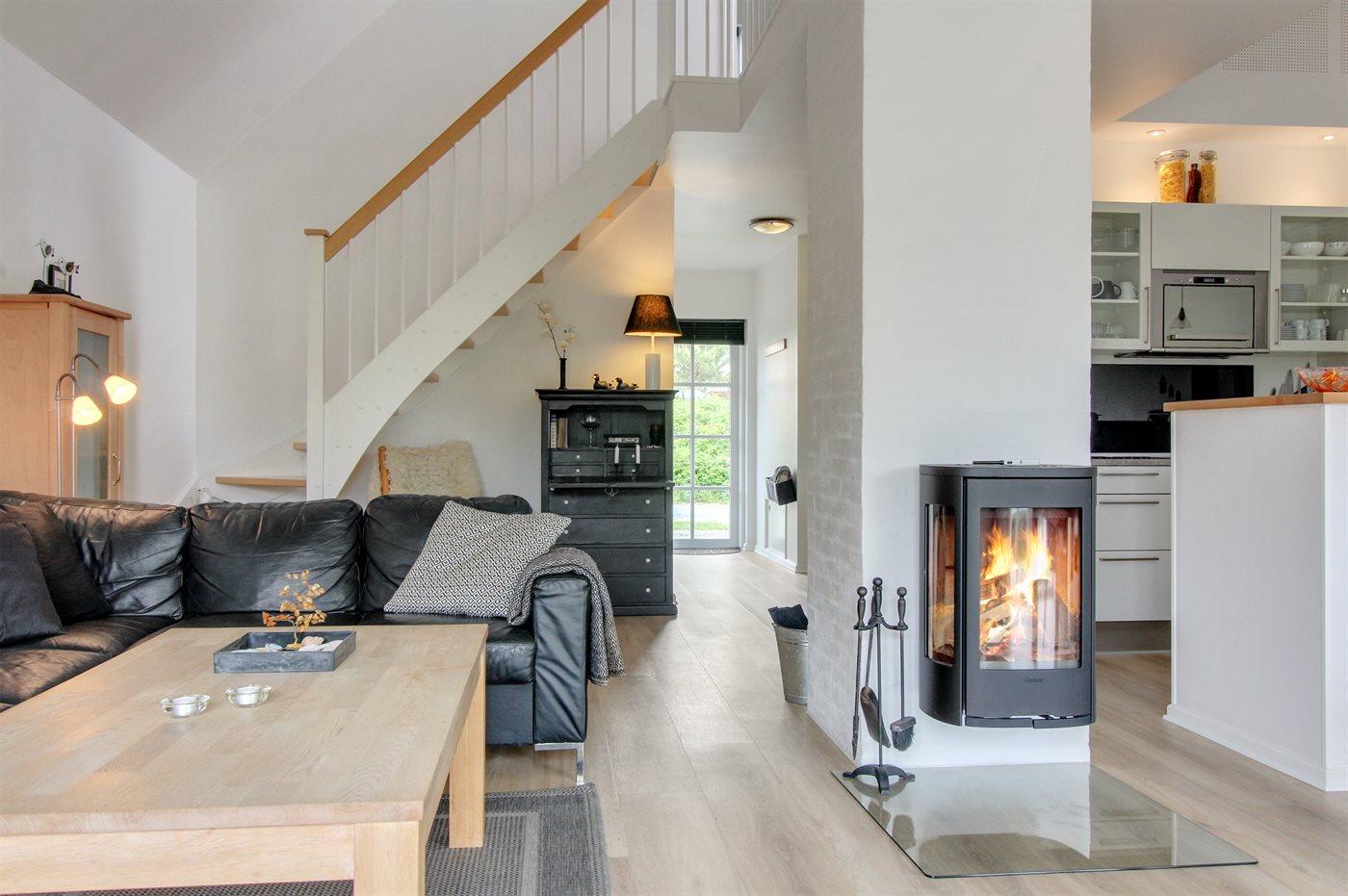 Huset er i 2 plan og opført i 2002. Indvendig er vægge og lofter malet i lyse farver og gulvene er dels belagt med klinker, dels med tæpper. Stuen er møbleret med klassiske møbler og har brændeovn, DVD-afspiller og Smart-TV. Desuden gratis, trådløs internetforbindelse og Chromecast til rådighed. Køkkenet er bl.a. udstyret med opvaskemaskine, mikrobølgeovn og varmluftovn. I det dejlige badeværelse, som er renoveret i 2017 findes der opvarmet klinkegulv, 2-pers. spa, bruseniche og direkte adgang til sauna. Nyt gæstetoilet (2018) på 1. sal. Stort, praktisk bryggers med vaskemaskine og tørretumbler. Husets 6 sovepladser fordeler sig på 3 dobbeltsenge, hvoraf 1 er placeret i stueetagen og 2 på 1. sal. Til de mindste feriegæster findes der barneseng og høj barnestol.
