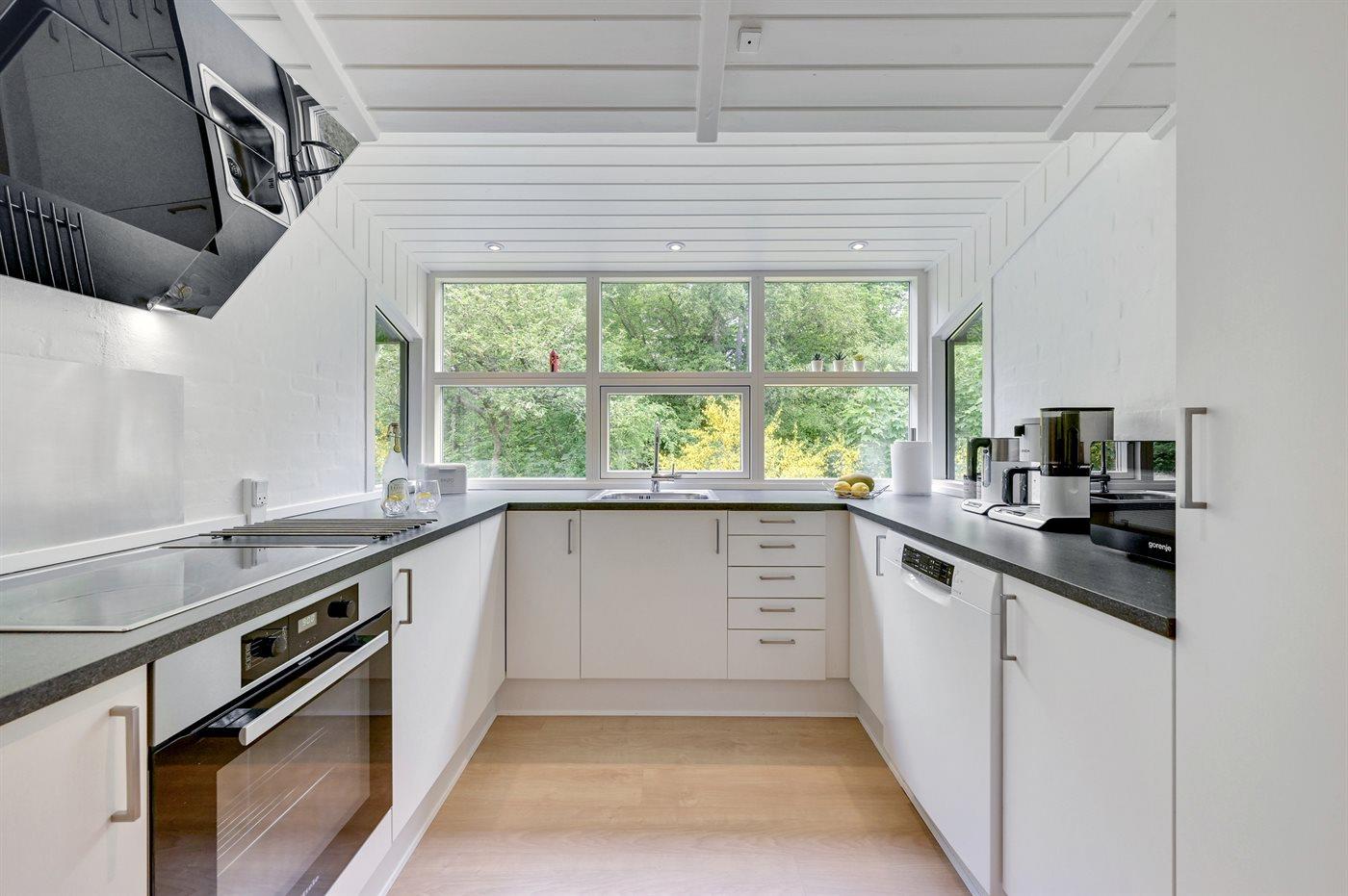 Køkkenet er udstyret med 1 køleskab. Der er 4 keramiske kogeplader, varmluftovn, mikrobølgeovn samt opvaskemaskine.