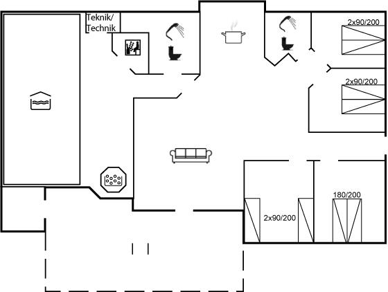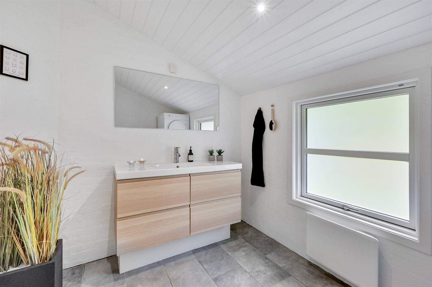 Der er 2 badeværelser med bruseniche og 2 toiletter. Der er gulvvarme på 2 badeværelser. I saunaen er der mulighed for afslapning.