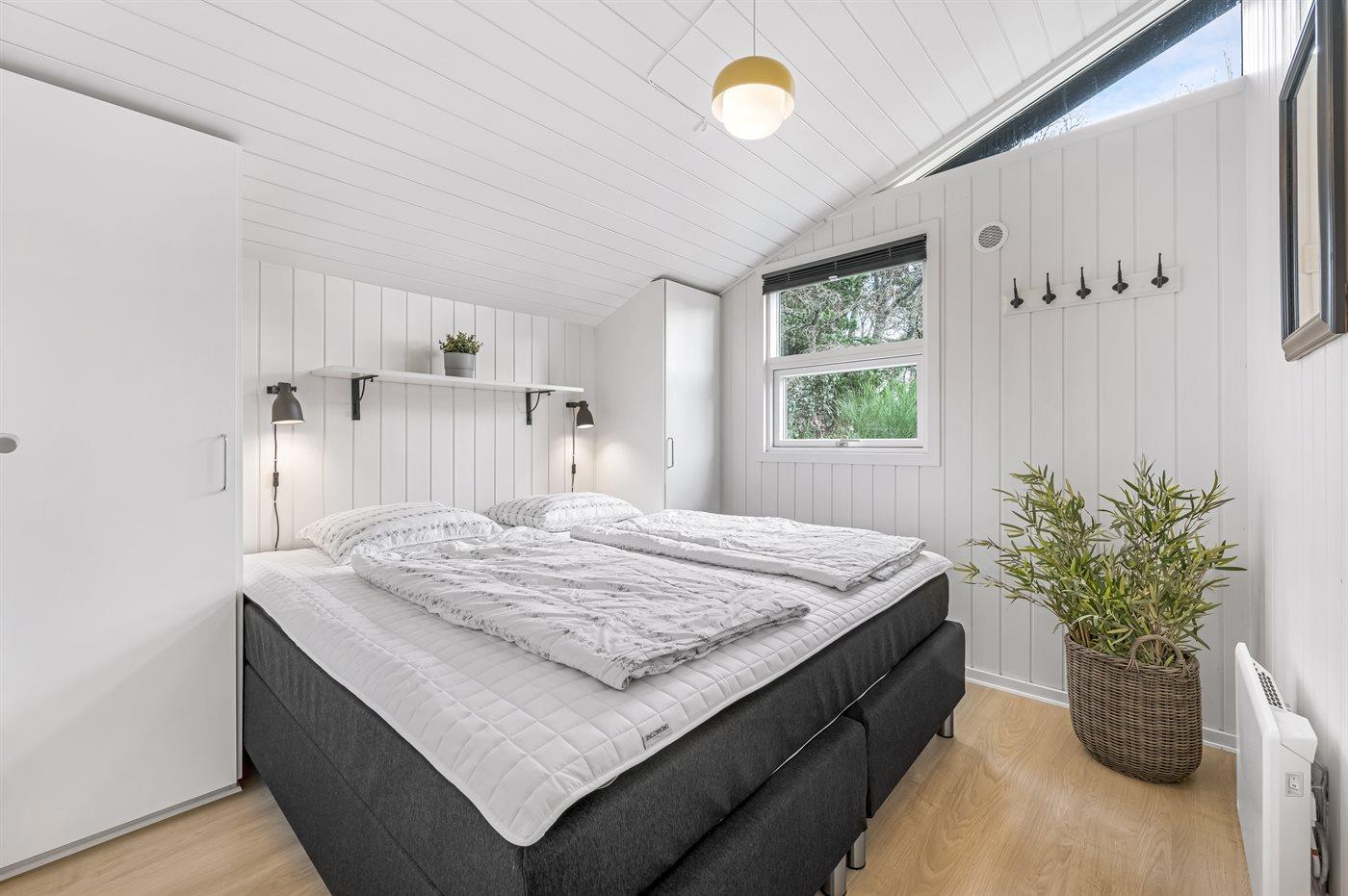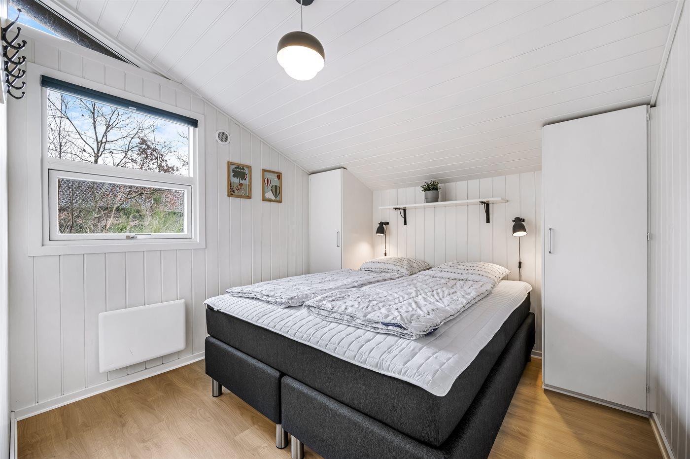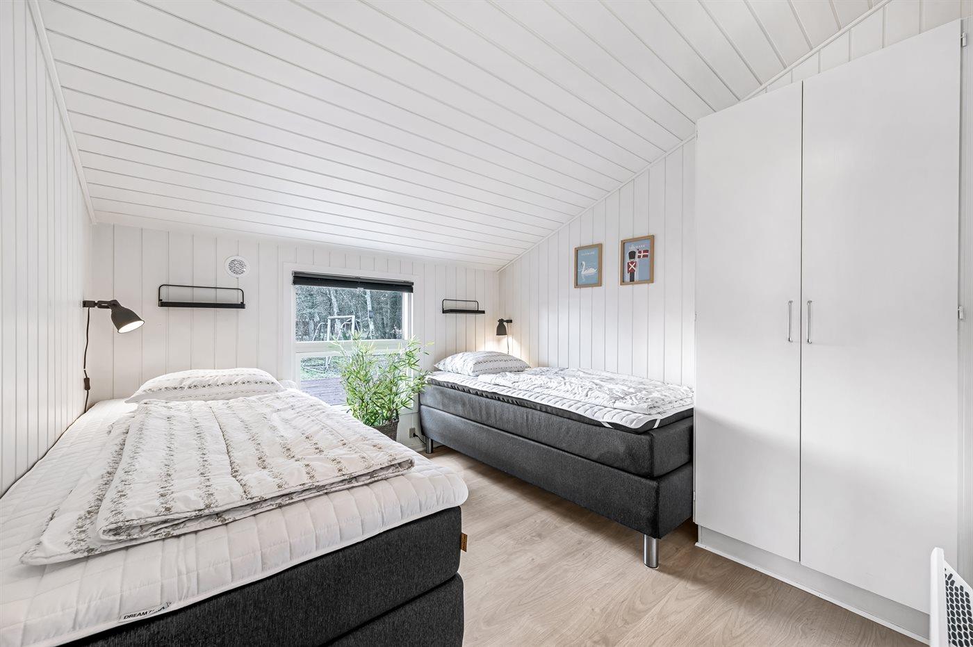 Der er i alt 4 soveværelser. Sovepladserne fordeler sig på: 6 sovepladser i dobbeltsenge. 2 sovepladser i enkeltsenge. 2 sovepladser på madrasser. 2 af disse sovepladser befinder sig på husets hems.