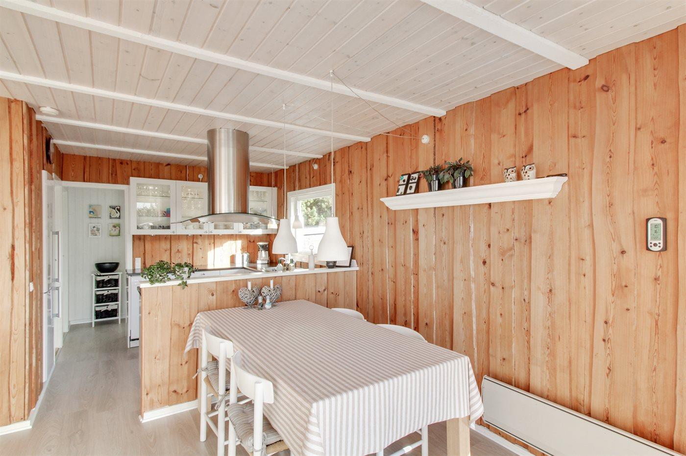 Køkkenet er udstyret med 1 køleskab. Der er 4 keramiske kogeplader, varmluftovn samt opvaskemaskine.