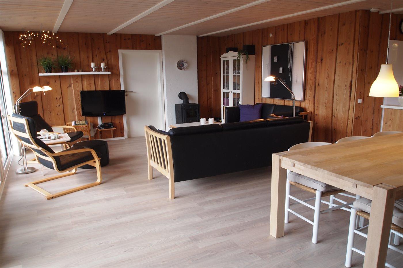 Hyggeligt sommerhus i Blåvand med stor grund, brændeovn og elbiloplader nær havet.