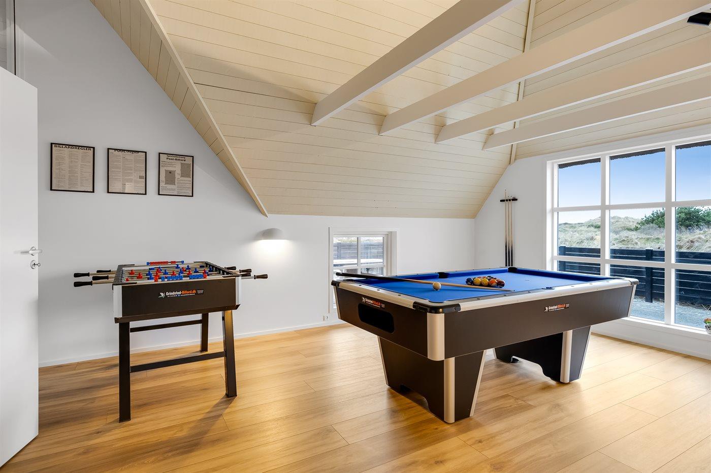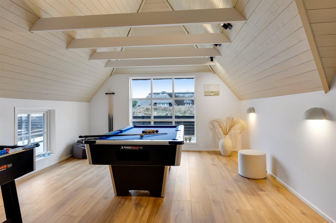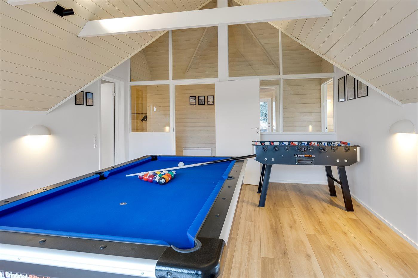 Sovepladserne fordeler sig på: 4 sovepladser i dobbeltsenge. 4 sovepladser i enkeltsenge. 2 sovemuligheder (madrasser) på hems. Der findes 2 skønne badeværelser, begge med gulvvarme, bruseniche og toilet. Fra det ene er der adgang til saunaen, hvor der er mulighed for afslapning. Husets aktivitetsrum indeholder billardbord og bordfodbold. Bryggers med indgang, vaskemaskine og tørretumbler. I et nærliggende rum er der fryser med en kapacitet på 80 liter.