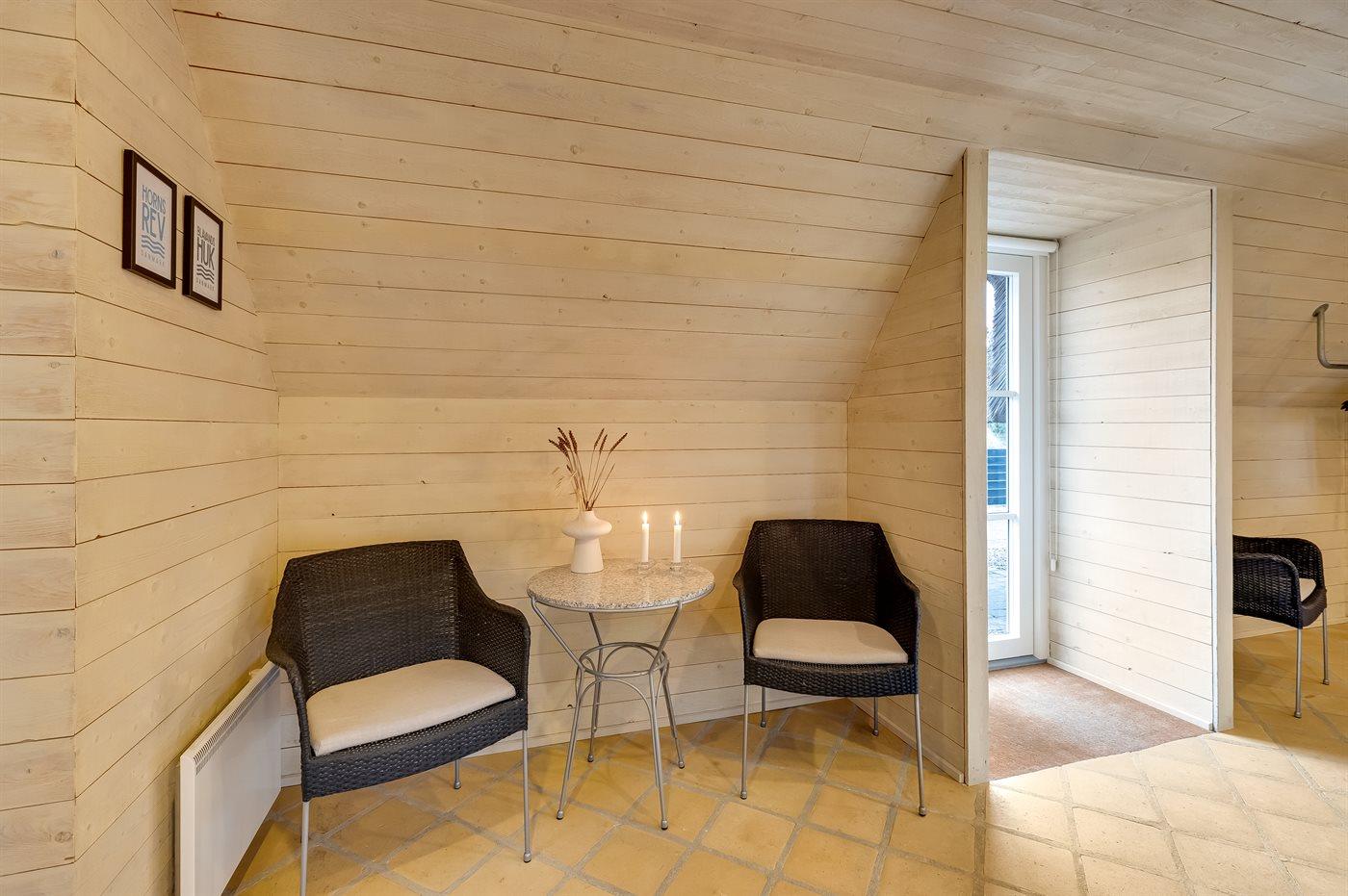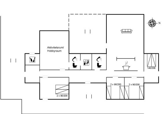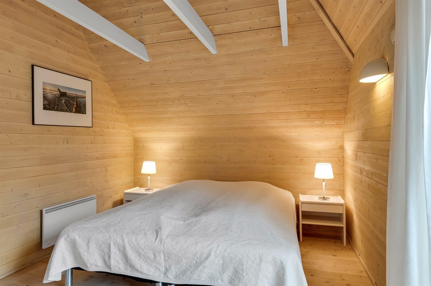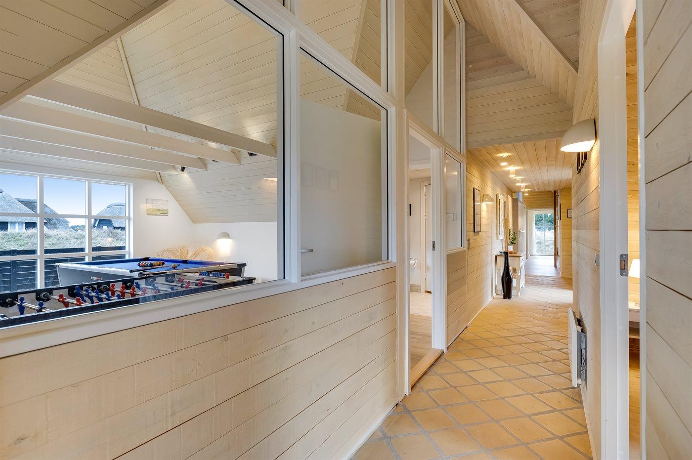 Sovepladserne fordeler sig på: 4 sovepladser i dobbeltsenge. 4 sovepladser i enkeltsenge. 2 sovemuligheder (madrasser) på hems. Der findes 2 skønne badeværelser, begge med gulvvarme, bruseniche og toilet. Fra det ene er der adgang til saunaen, hvor der er mulighed for afslapning. Husets aktivitetsrum indeholder billardbord og bordfodbold. Bryggers med indgang, vaskemaskine og tørretumbler. I et nærliggende rum er der fryser med en kapacitet på 80 liter.