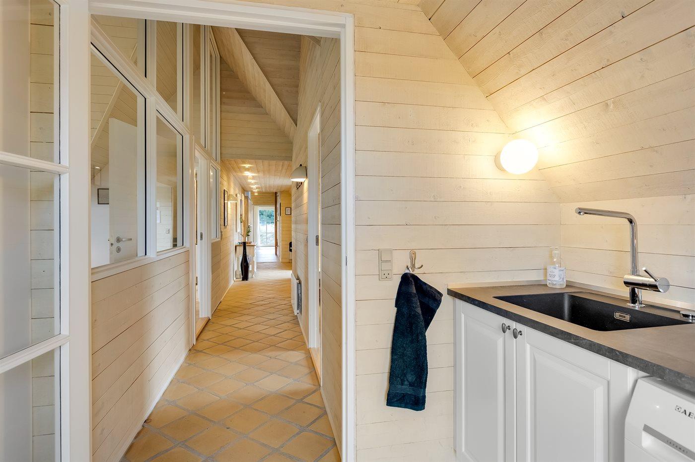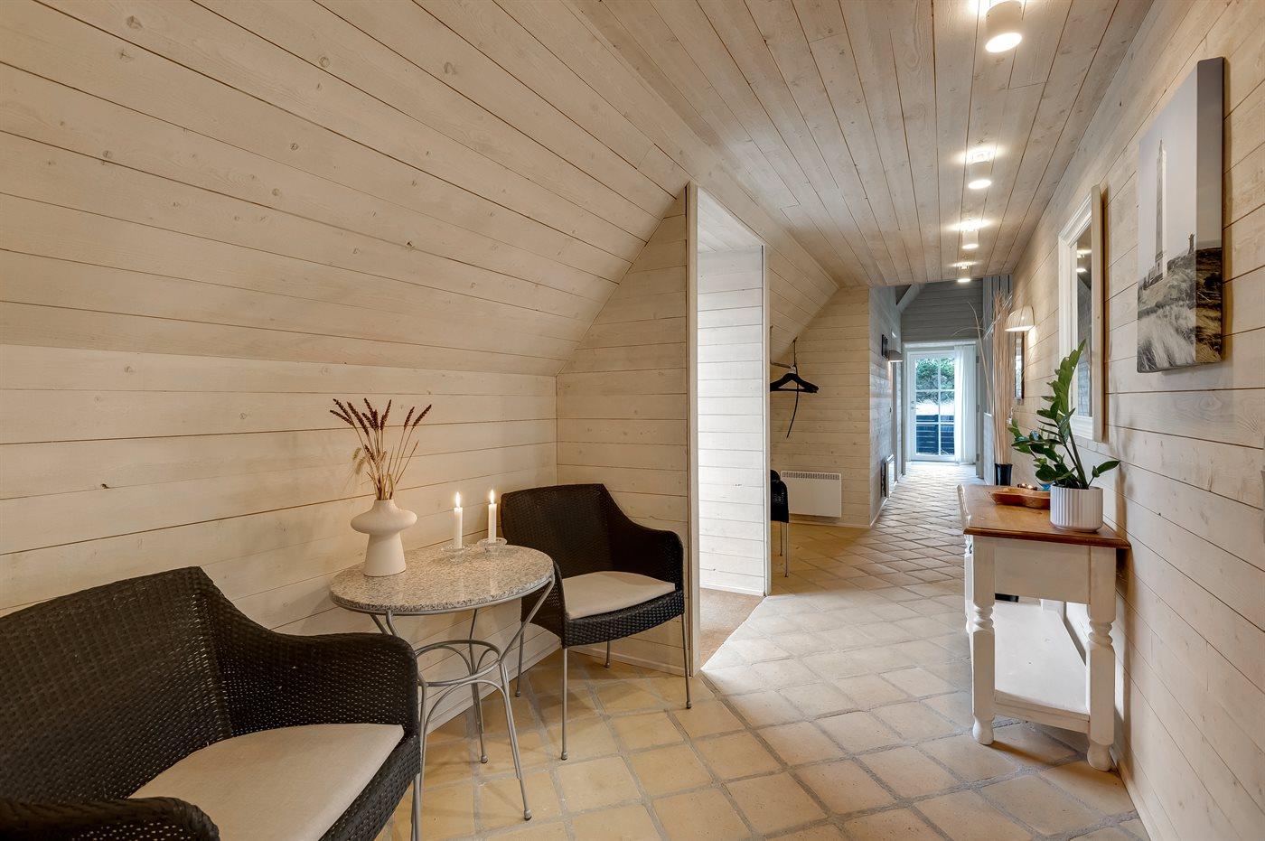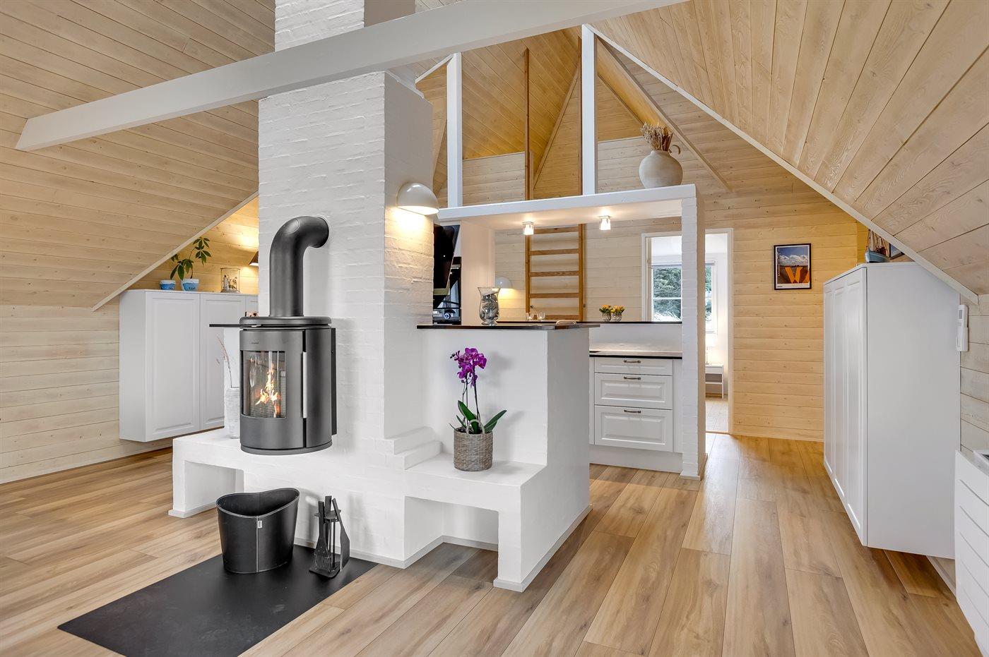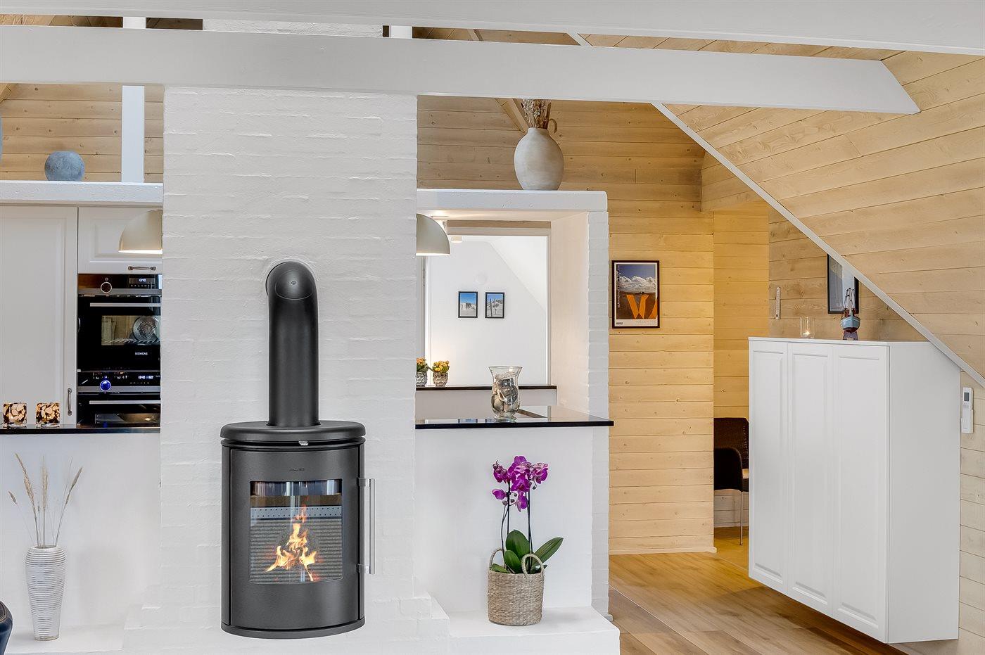 Entreen er lys og rummelig. Det flotte og moderne køkken er kombineret med spise-/opholdsstuen og bl.a. udstyret med integreret opvaskemaskine og køleskab. Sorte polerede granitbordplader, 4 induktionskogeplader, varmluftsovn og combiovn med mikrobølgeovn. I den lyse, moderne og smagfuldt møblerede spise-/opholdsstue finder I TV, DAB-radio og brændeovn. Der er mindst 4 danske kanaler. 1-3 svenske kanaler. 1-3 norske kanaler. Mindst 4 tyske kanaler. Der er trådløst internetforbindelse til rådighed.