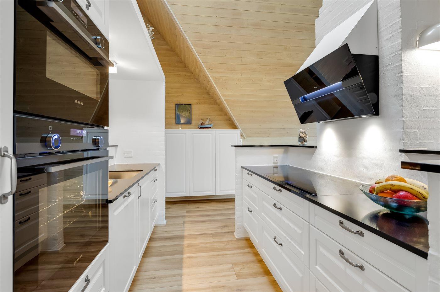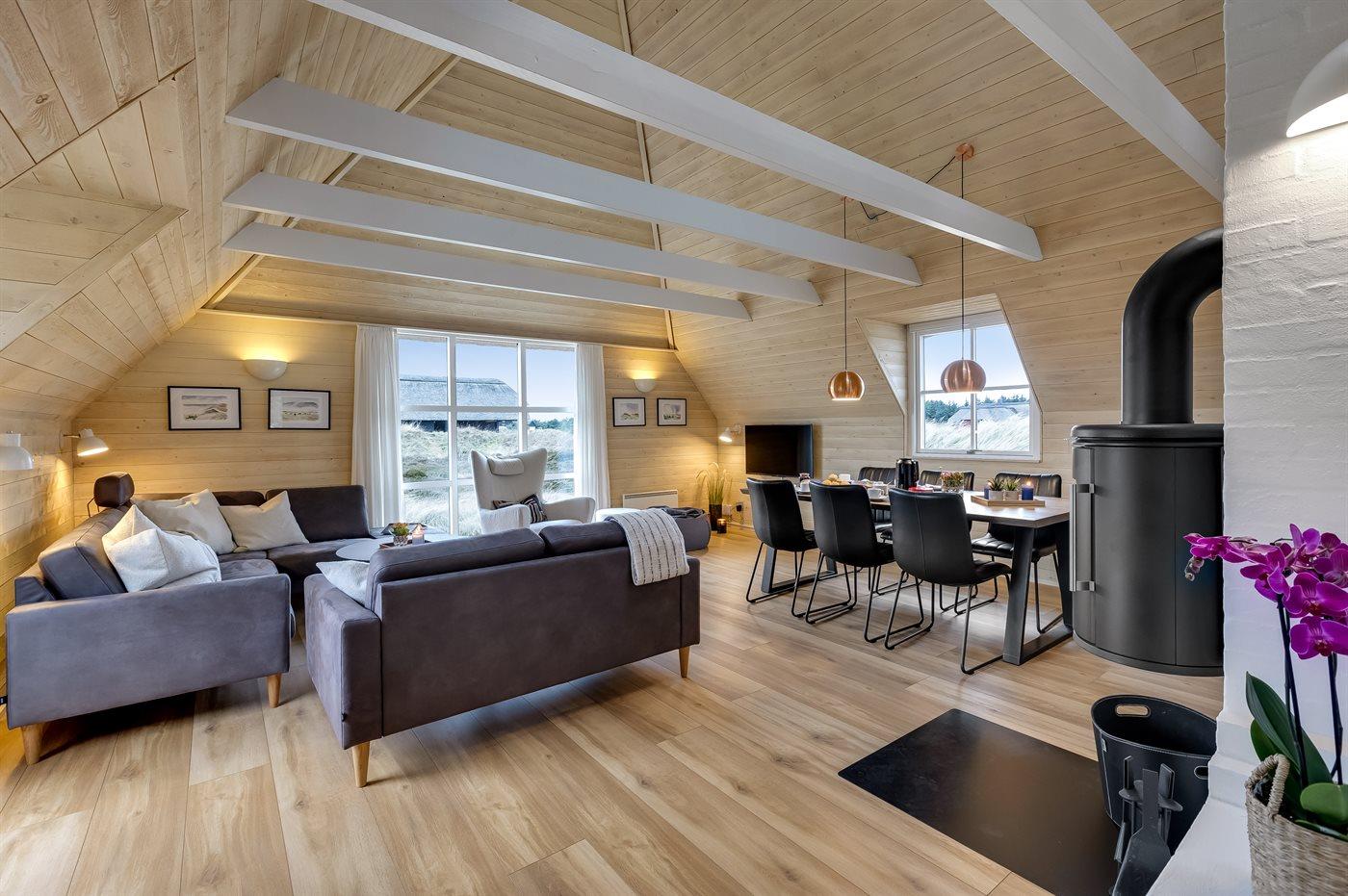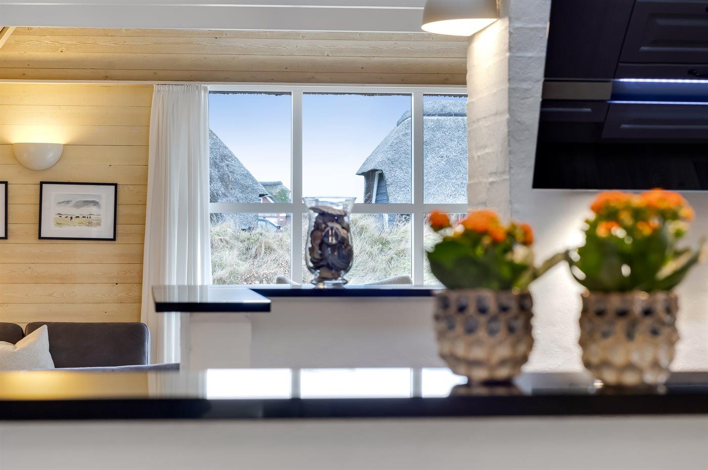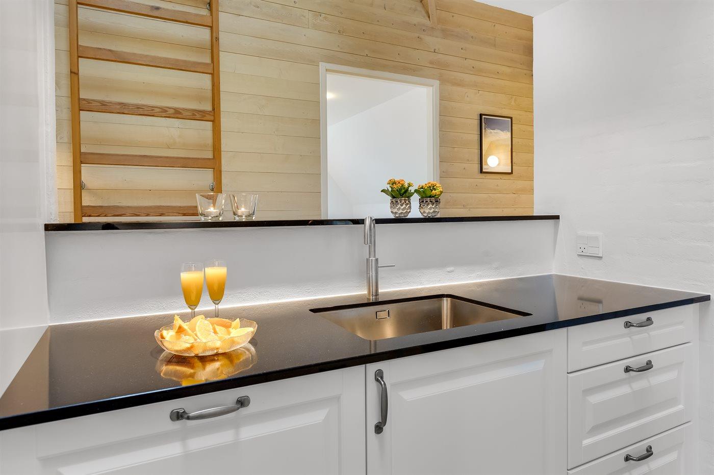 Entreen er lys og rummelig. Det flotte og moderne køkken er kombineret med spise-/opholdsstuen og bl.a. udstyret med integreret opvaskemaskine og køleskab. Sorte polerede granitbordplader, 4 induktionskogeplader, varmluftsovn og combiovn med mikrobølgeovn. I den lyse, moderne og smagfuldt møblerede spise-/opholdsstue finder I TV, DAB-radio og brændeovn. Der er mindst 4 danske kanaler. 1-3 svenske kanaler. 1-3 norske kanaler. Mindst 4 tyske kanaler. Der er trådløst internetforbindelse til rådighed.