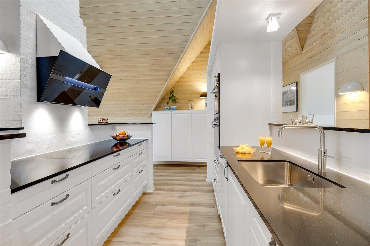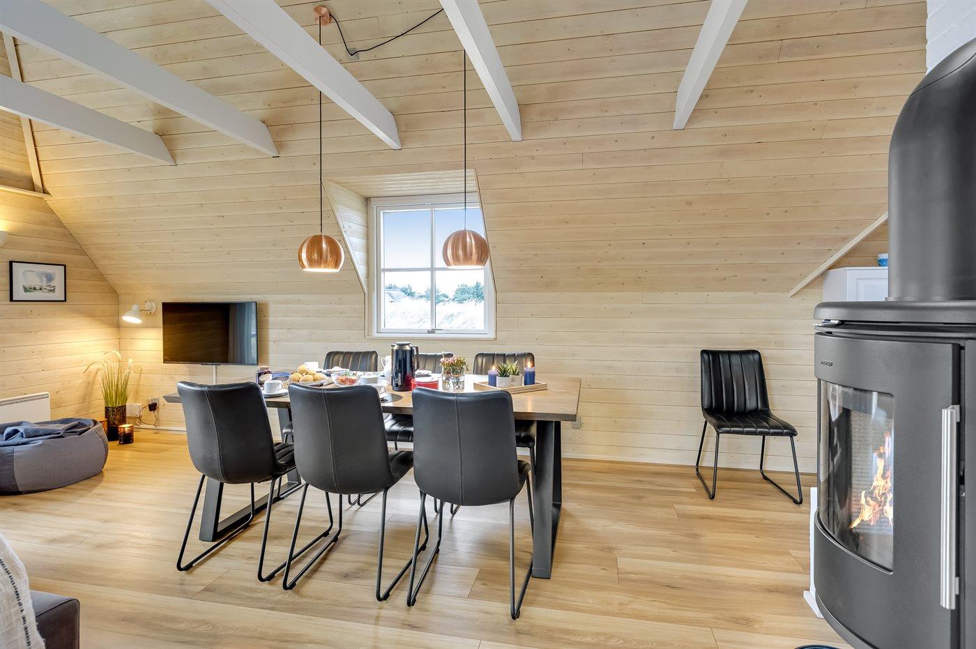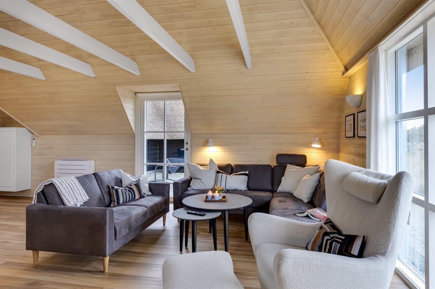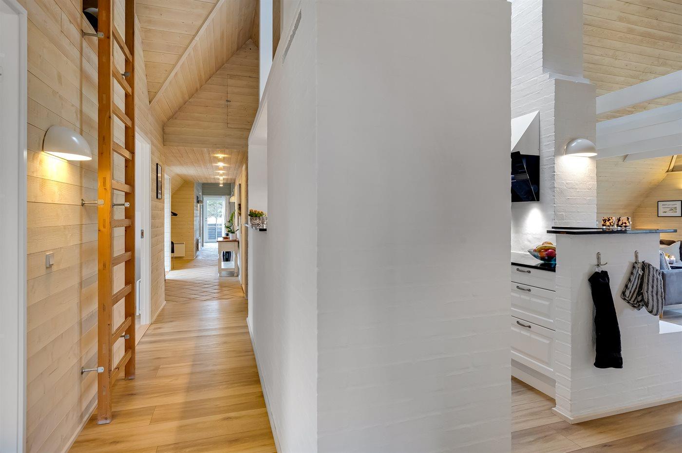 Entreen er lys og rummelig. Det flotte og moderne køkken er kombineret med spise-/opholdsstuen og bl.a. udstyret med integreret opvaskemaskine og køleskab. Sorte polerede granitbordplader, 4 induktionskogeplader, varmluftsovn og combiovn med mikrobølgeovn. I den lyse, moderne og smagfuldt møblerede spise-/opholdsstue finder I TV, DAB-radio og brændeovn. Der er mindst 4 danske kanaler. 1-3 svenske kanaler. 1-3 norske kanaler. Mindst 4 tyske kanaler. Der er trådløst internetforbindelse til rådighed.