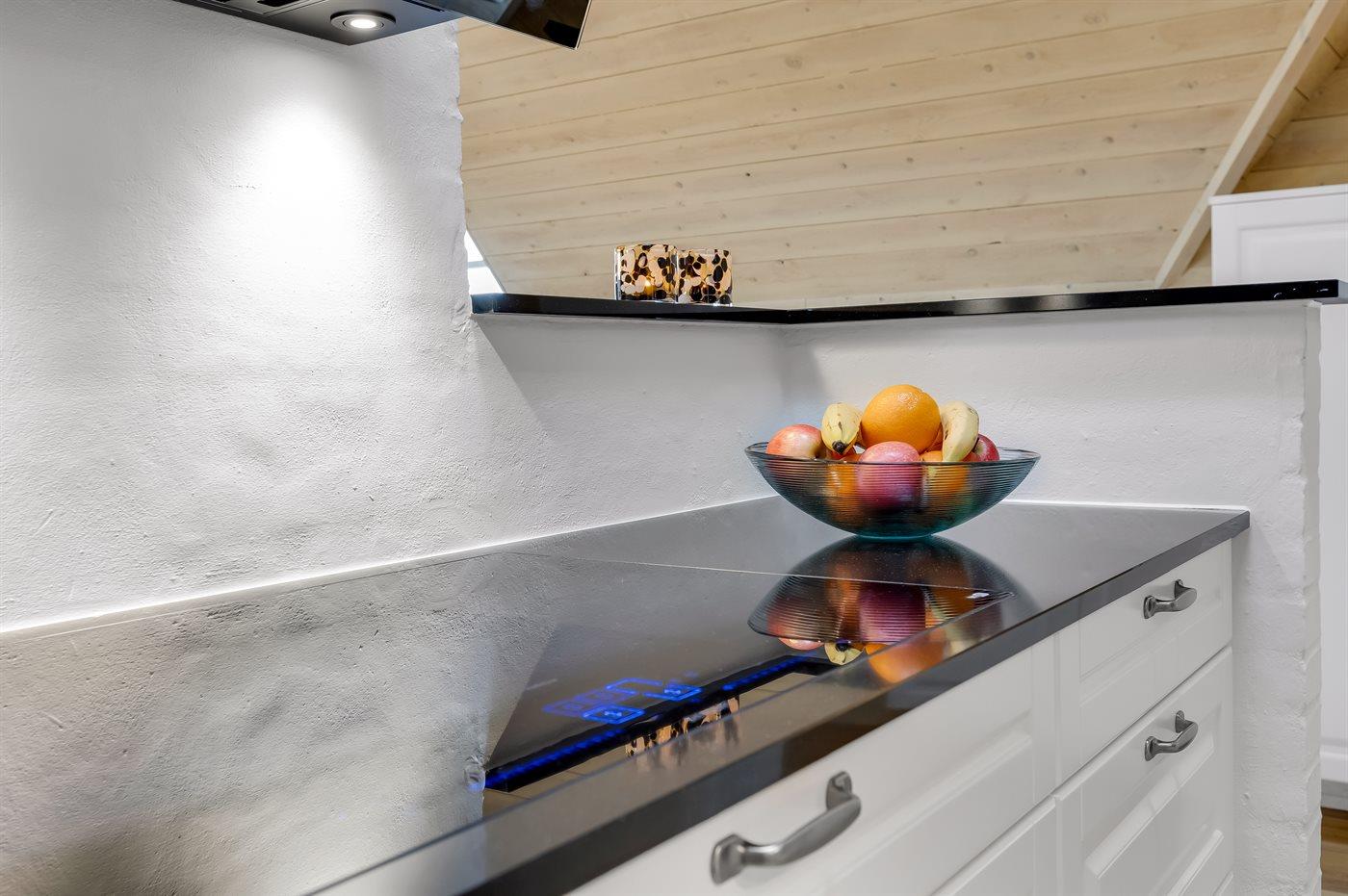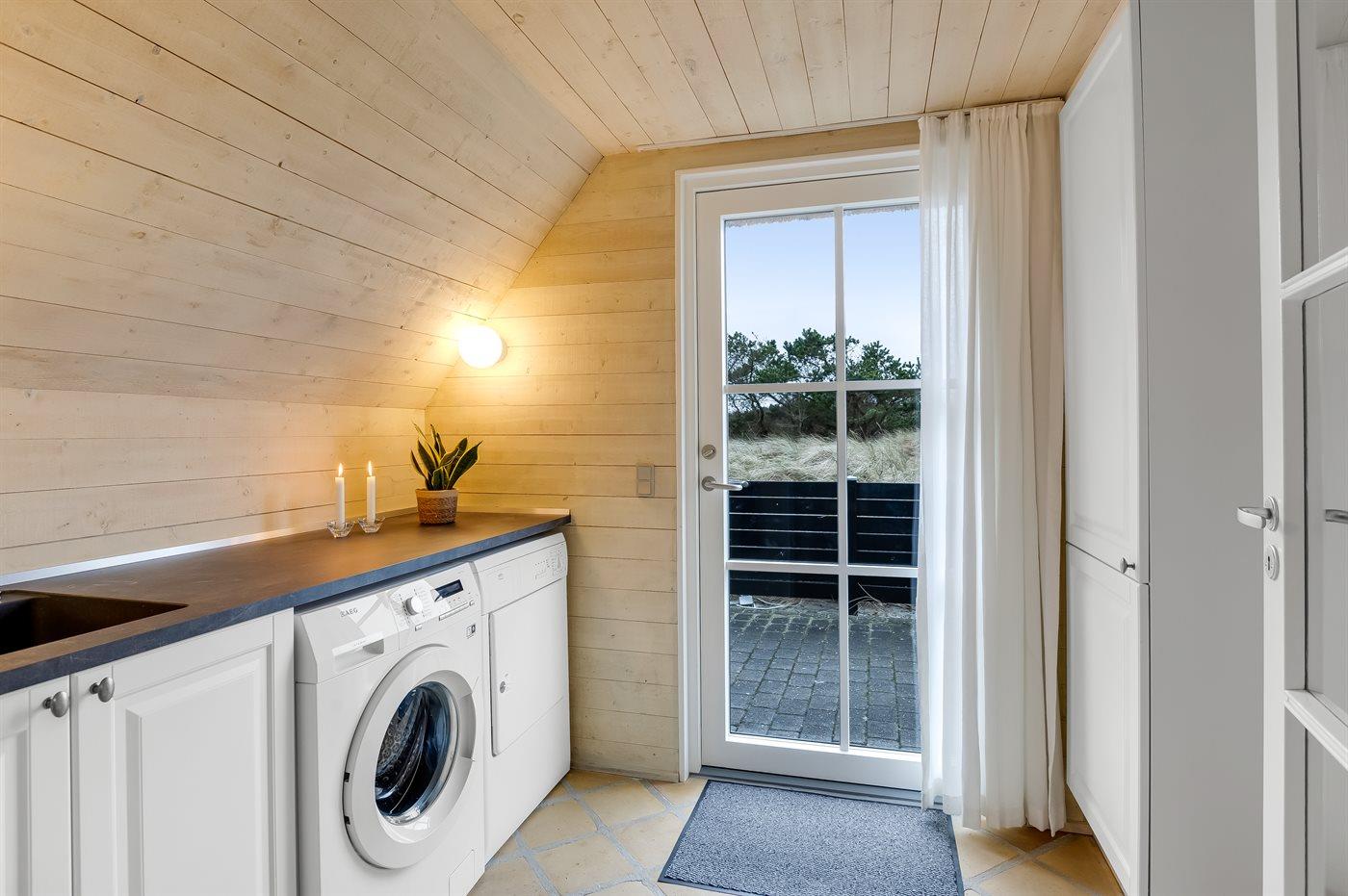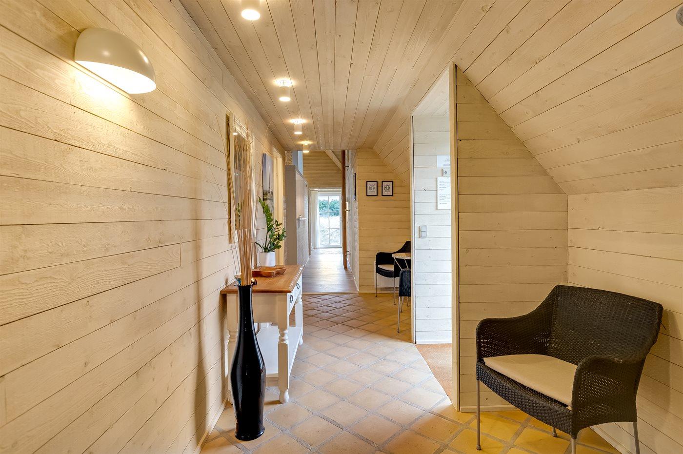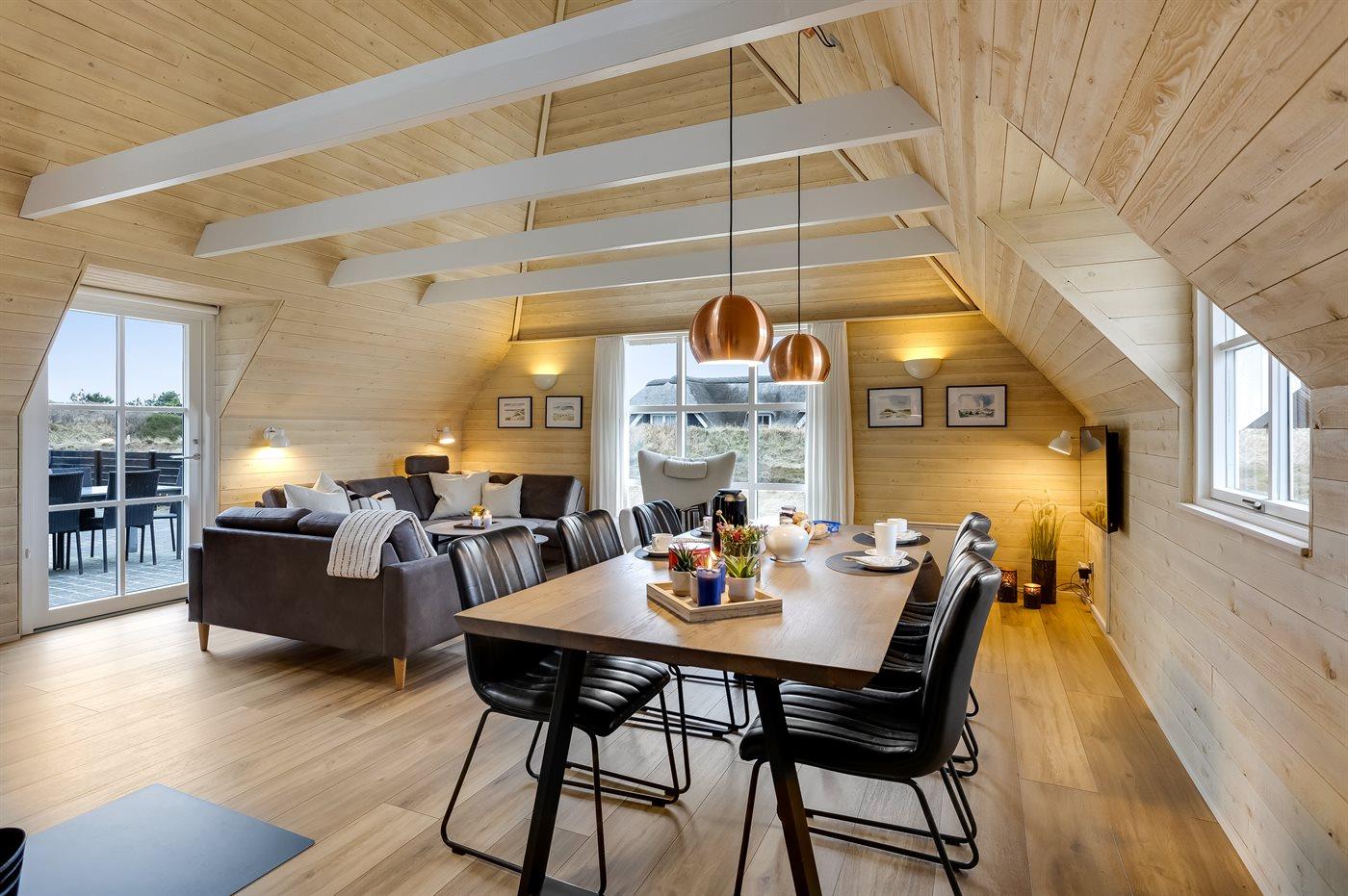 Entreen er lys og rummelig. Det flotte og moderne køkken er kombineret med spise-/opholdsstuen og bl.a. udstyret med integreret opvaskemaskine og køleskab. Sorte polerede granitbordplader, 4 induktionskogeplader, varmluftsovn og combiovn med mikrobølgeovn. I den lyse, moderne og smagfuldt møblerede spise-/opholdsstue finder I TV, DAB-radio og brændeovn. Der er mindst 4 danske kanaler. 1-3 svenske kanaler. 1-3 norske kanaler. Mindst 4 tyske kanaler. Der er trådløst internetforbindelse til rådighed.