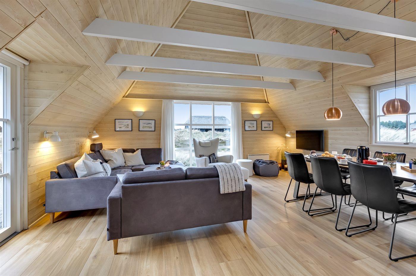 Flot arkitekttegnet sommerhus kun 100 m fra børnevenlig strand i Blåvand med sauna og aktivitetsrum.