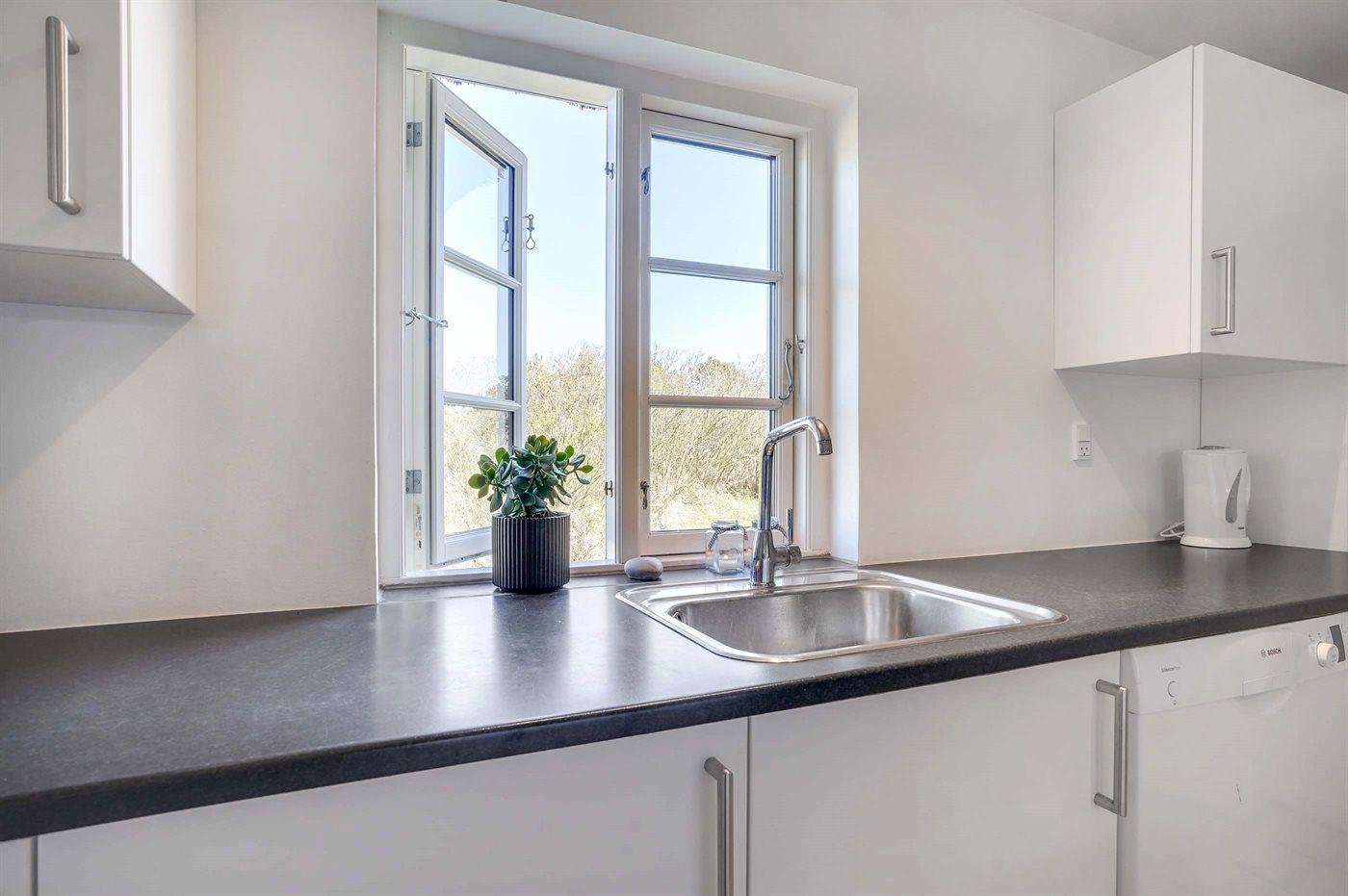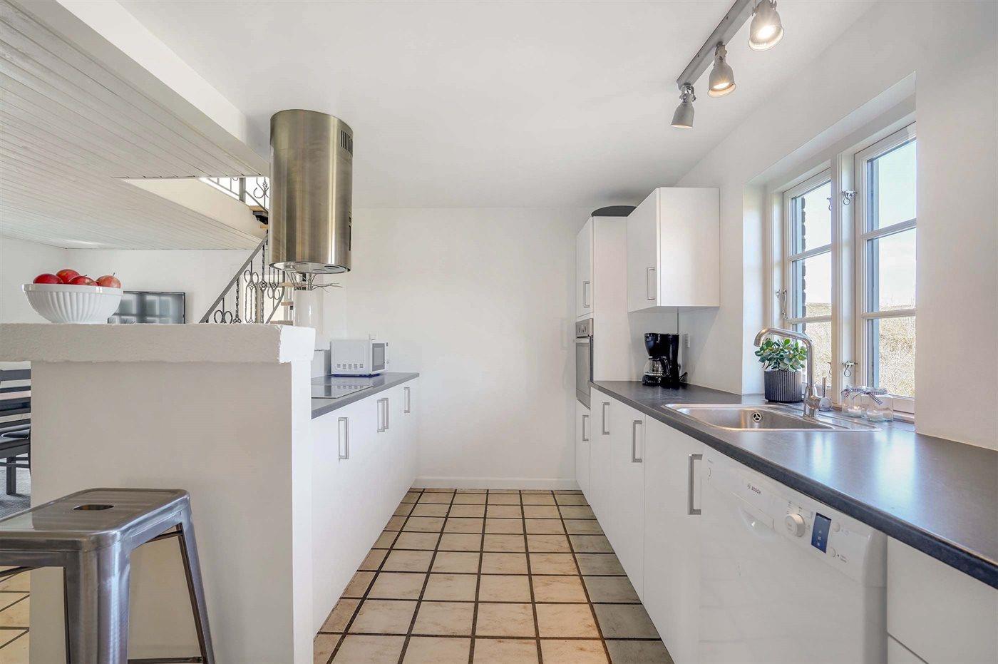 Køkkenet er udstyret med 1 køleskab. Der er 4 keramiske kogeplader, varmluftovn, mikrobølgeovn samt opvaskemaskine Der er gulvvarme i køkkenet.