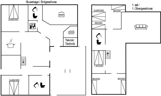 Der er i alt 5 soveværelser. Sovepladserne fordeler sig på: 8 sovepladser i dobbeltsenge. 4 sovepladser i enkeltsenge. Derudover er der 1 stk. barneseng.