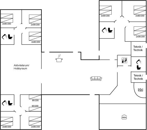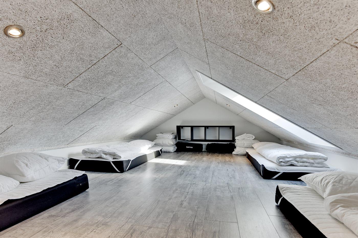 Der er i alt 9 soveværelser. Sovepladserne fordeler sig på: 18 sovepladser i dobbeltsenge. 4 sovepladser på madrasser. 4 af disse sovepladser fordeler sig på 2 hemse. Derudover er der 2 stk. barnesenge.