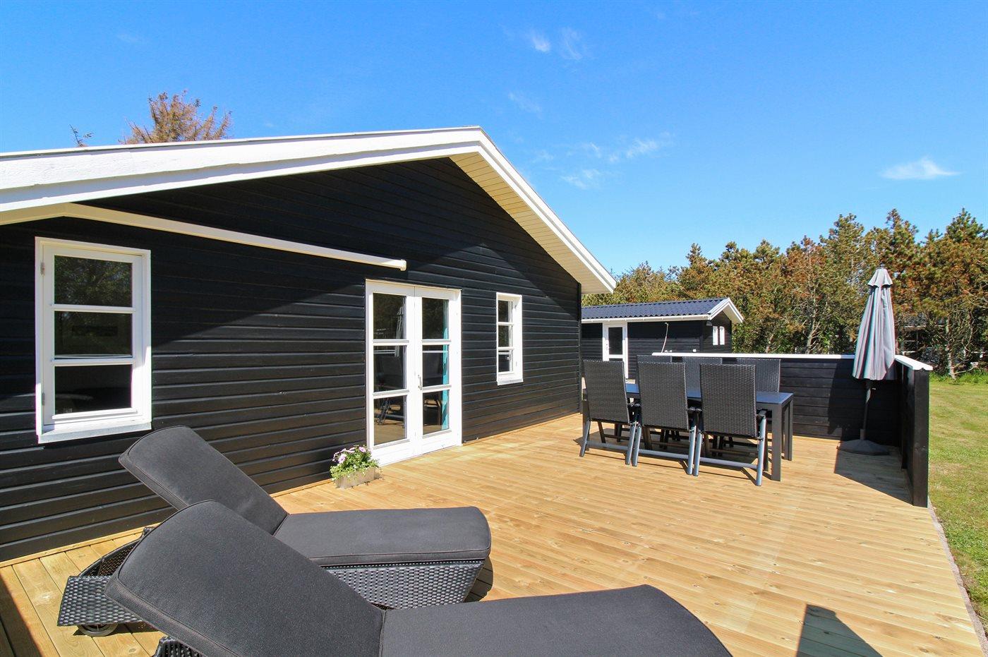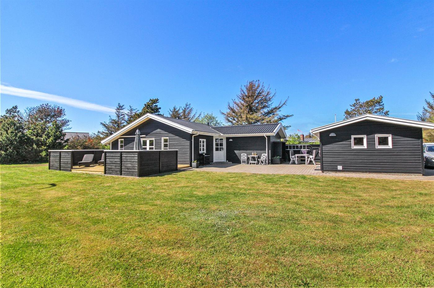 Hyggeligt sommerhus i Blåvand tæt på børnevenlig strand og naturgrund på 2100 m² med stor terrasse og bålplads.