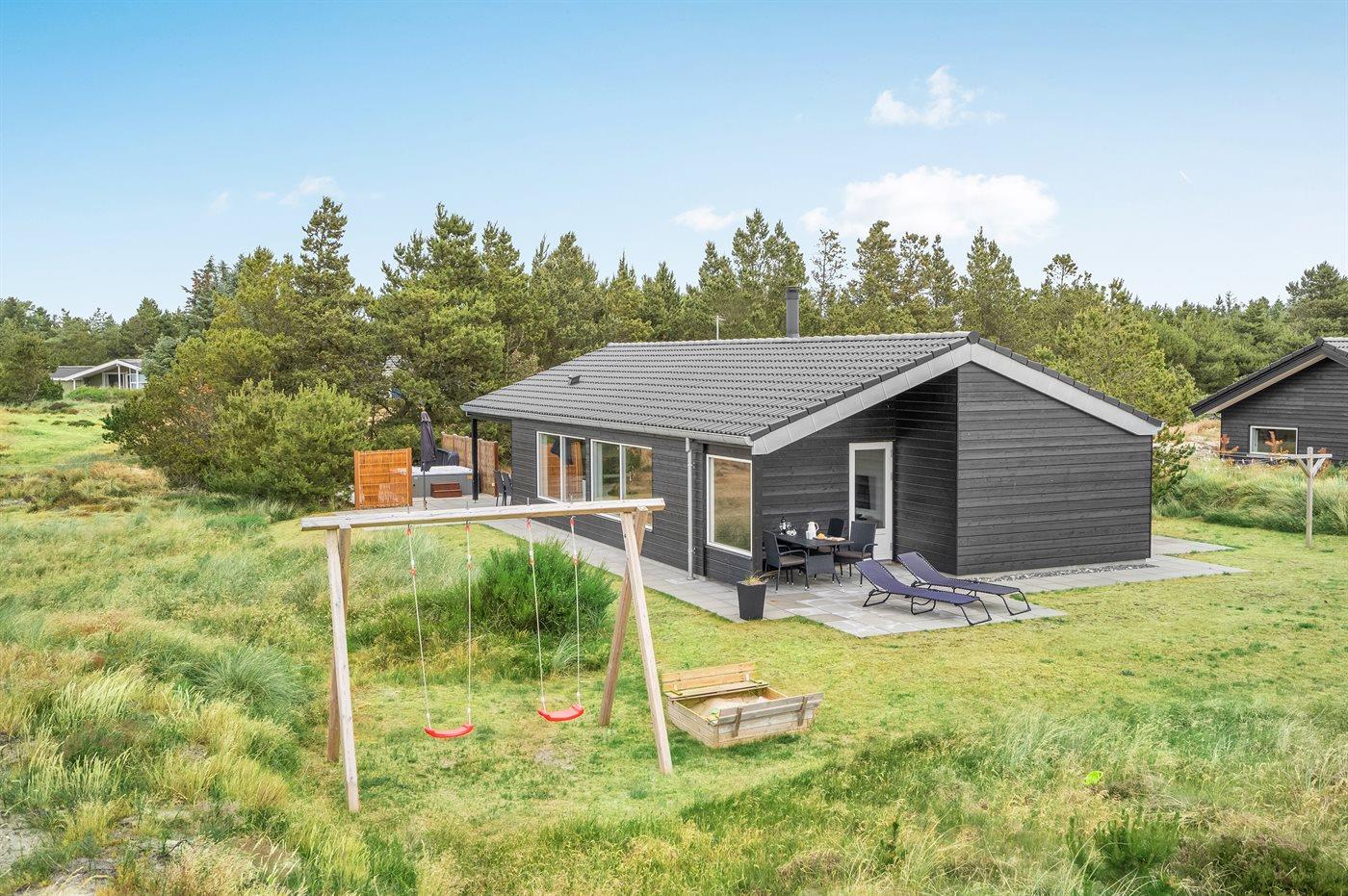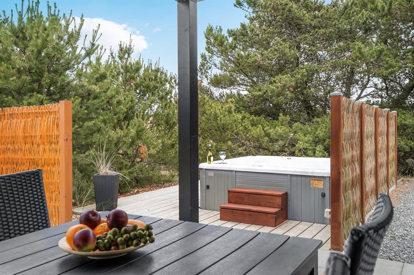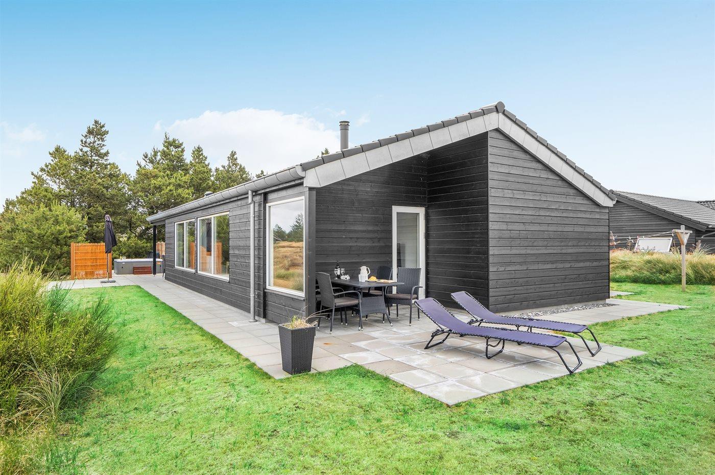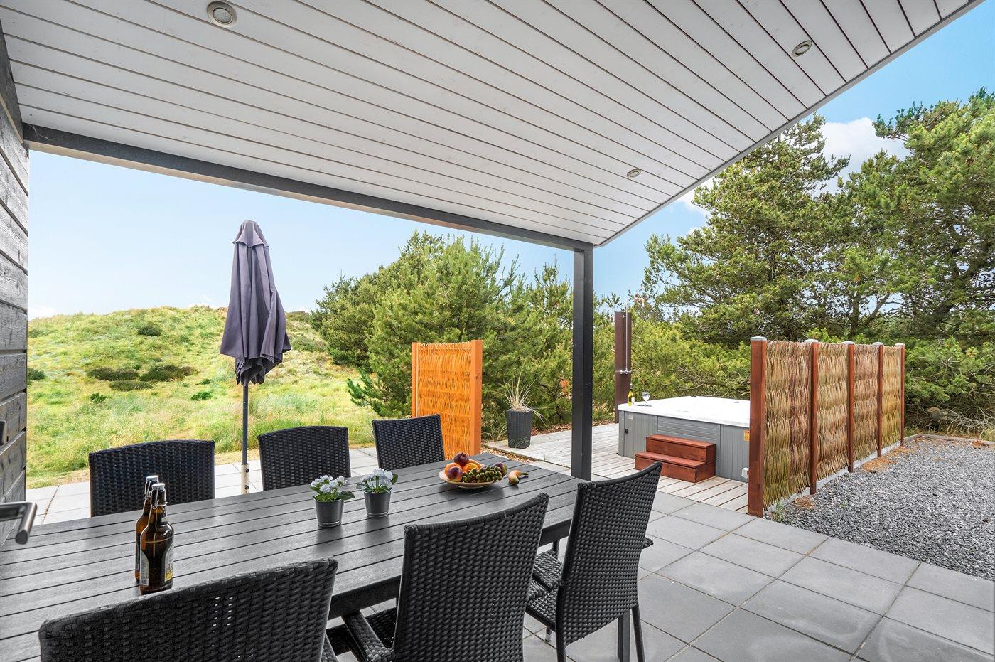 Moderne sommerhus i Blåvand med spa, sauna og stor terrasse nær havet.