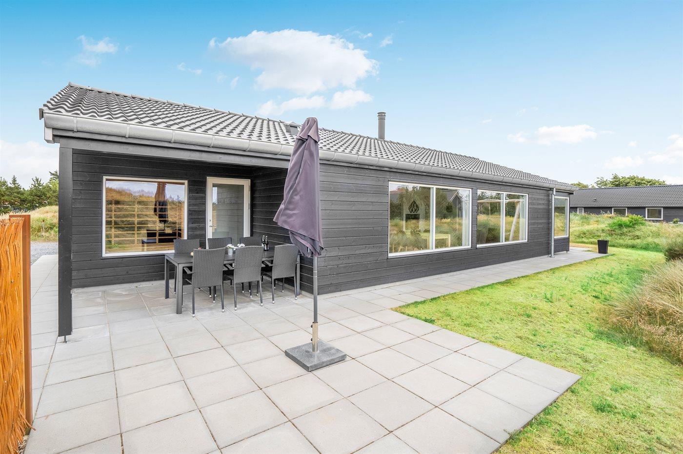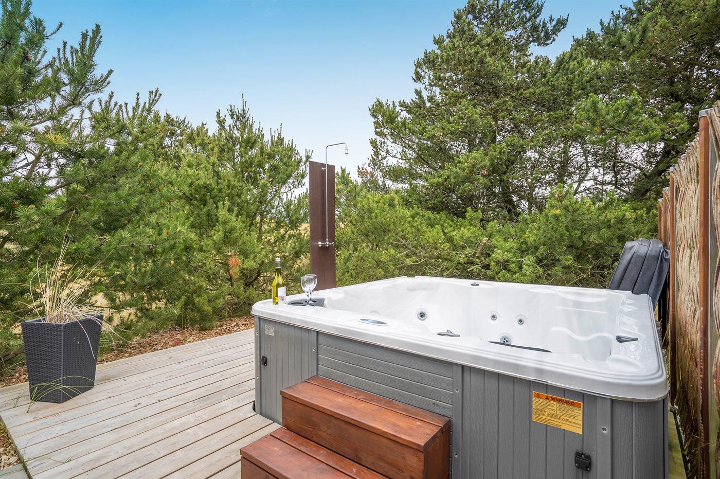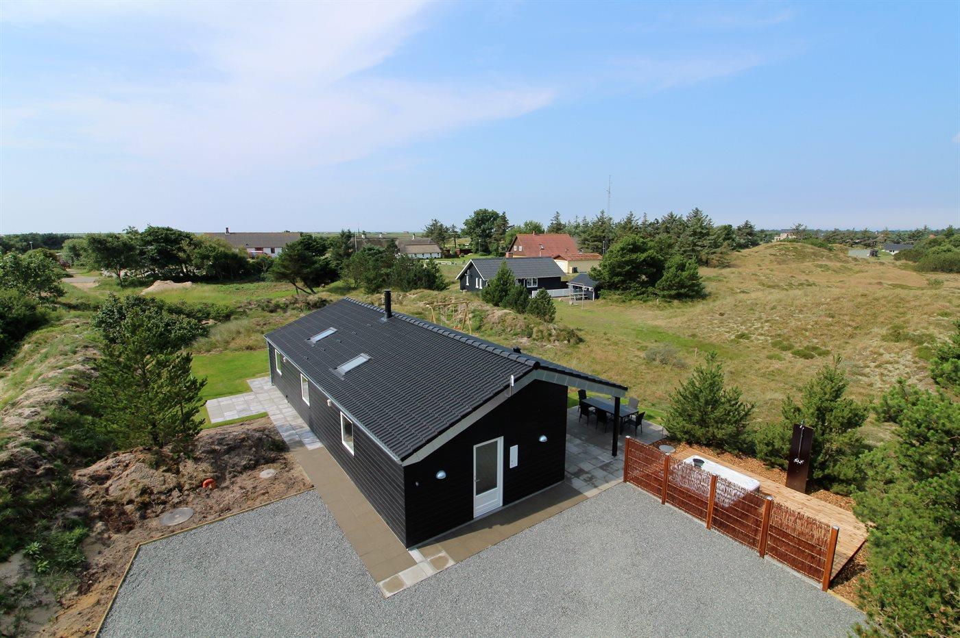 Moderne sommerhus i Blåvand med spa, sauna og stor terrasse nær havet.