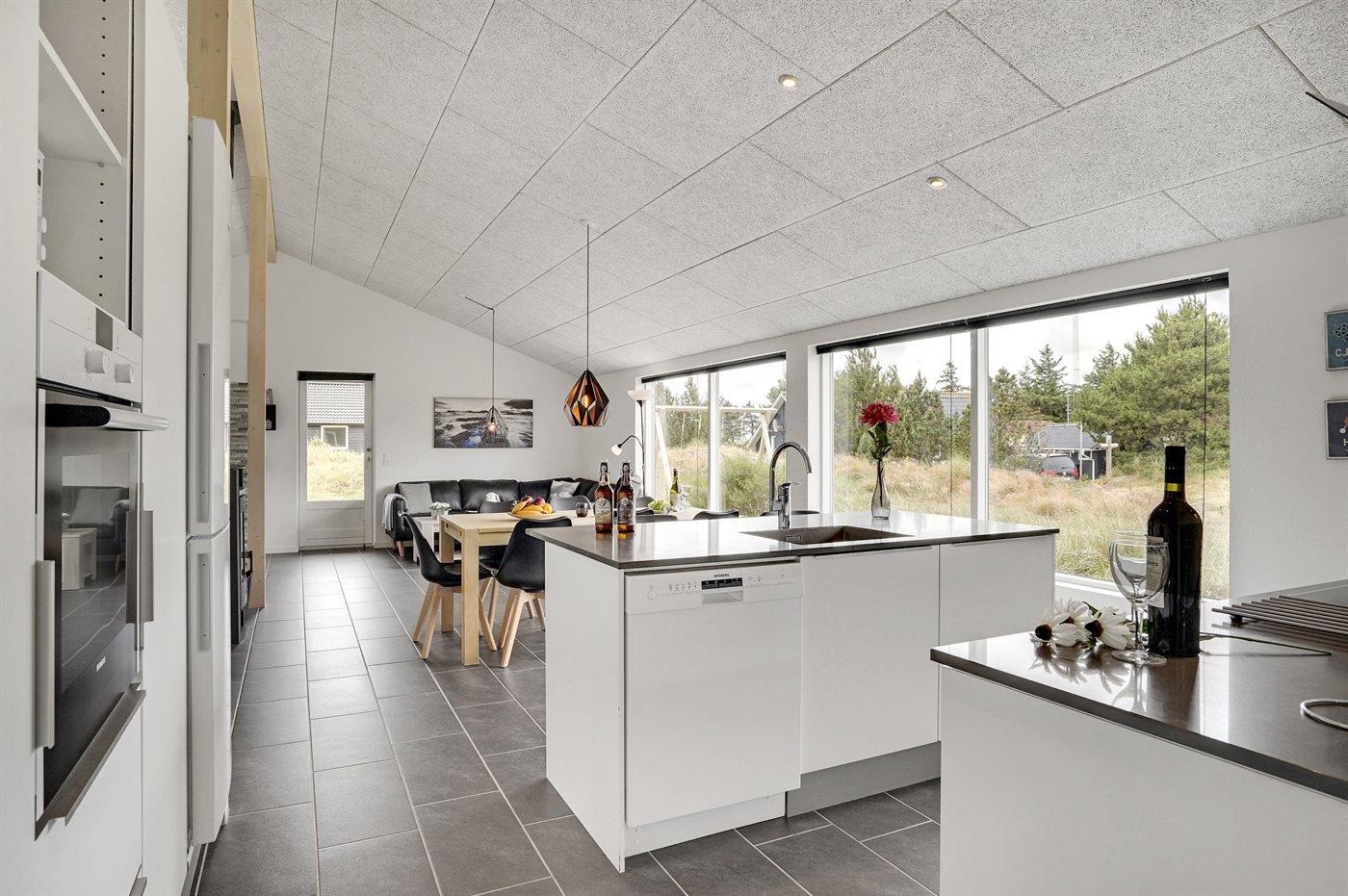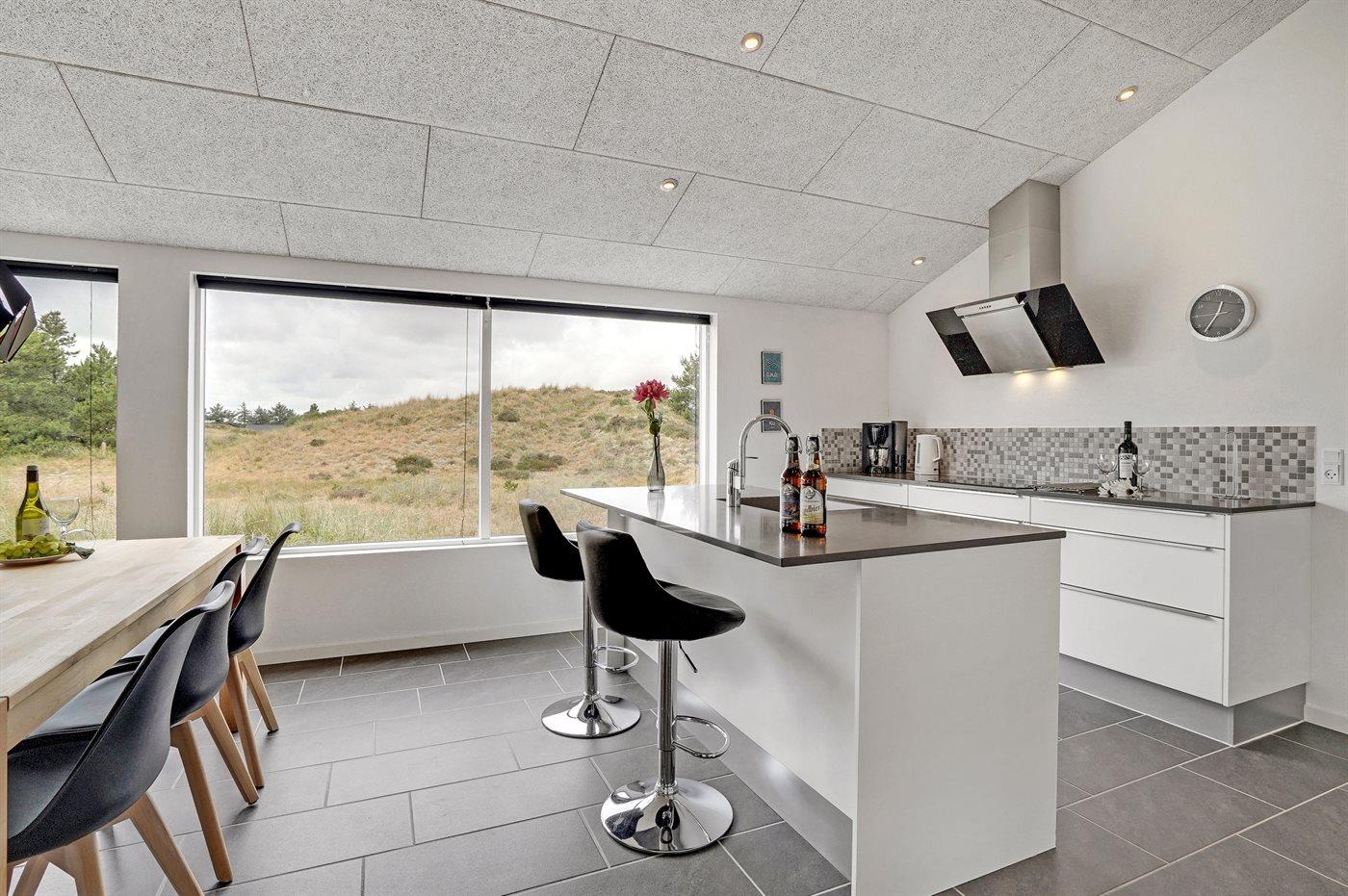 Køkkenet er udstyret med 1 køleskab. Der er 4 induktionskogeplader, varmluftovn, mikrobølgeovn samt opvaskemaskine Der er gulvvarme i køkkenet.