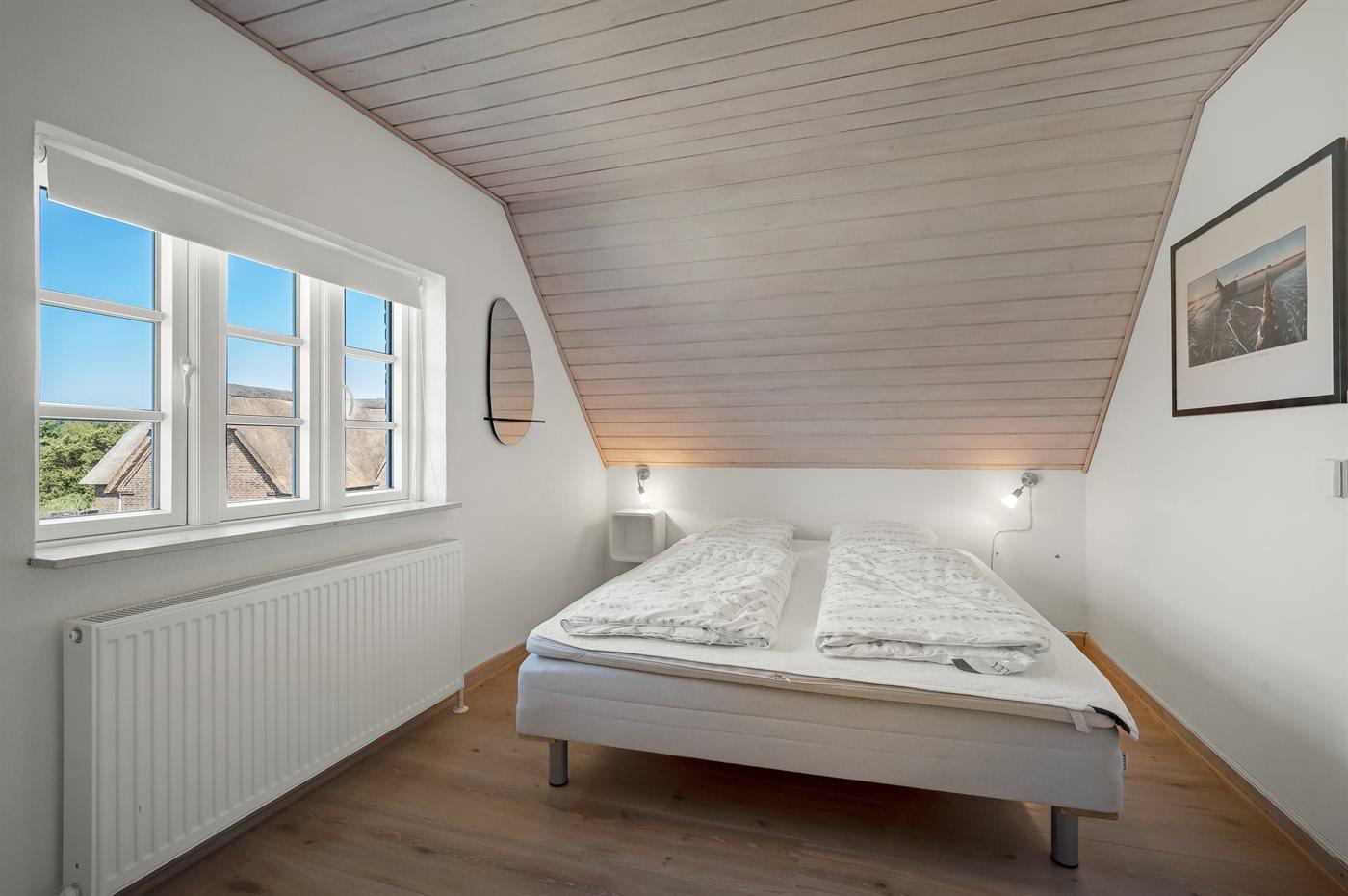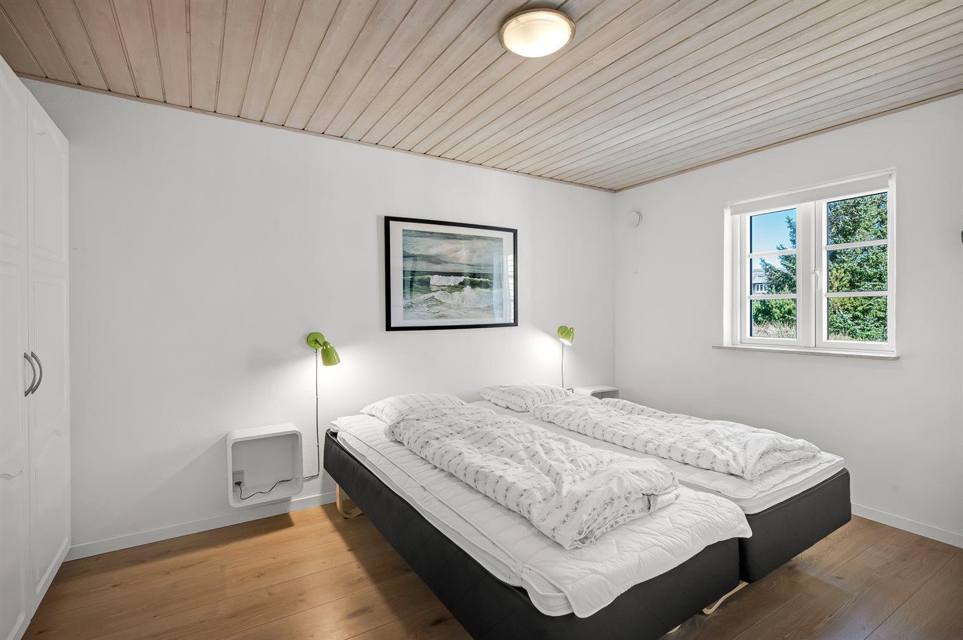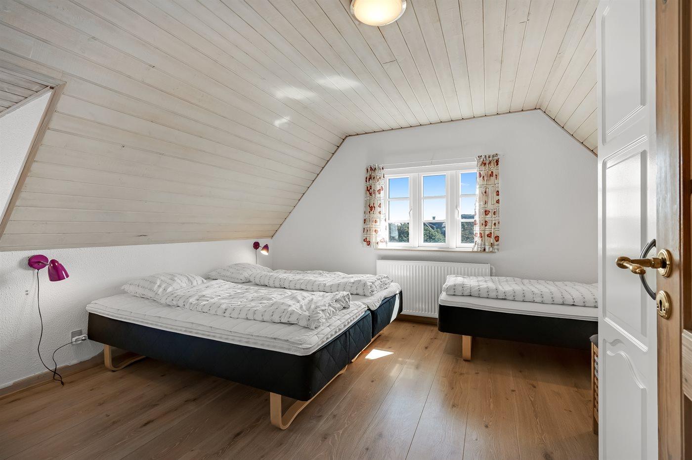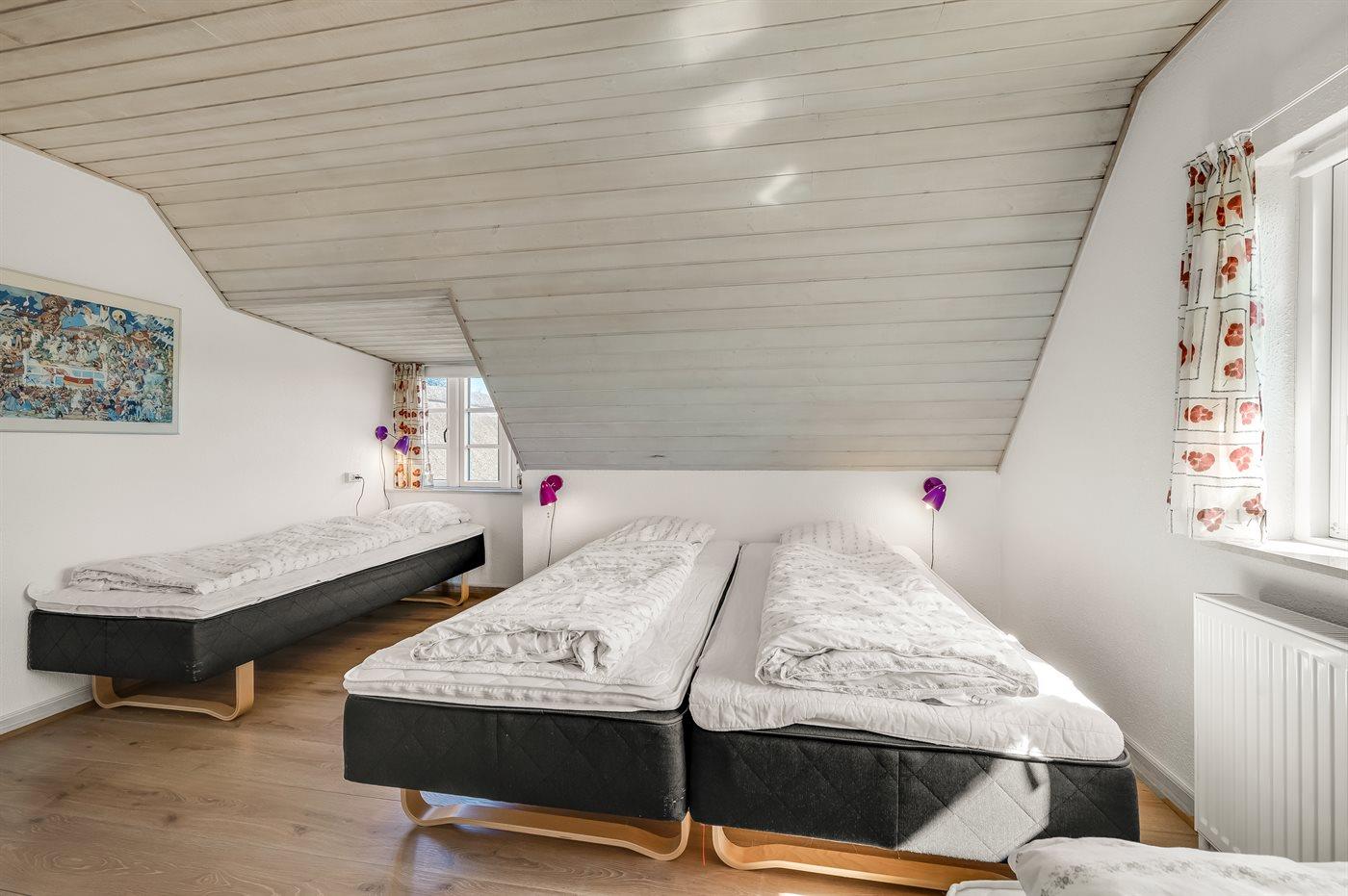 Der er i alt 5 soveværelser. Sovepladserne fordeler sig på: 10 sovepladser i dobbeltsenge. 2 sovepladser i enkeltsenge. 2 sovepladser på madrasser. 2 af disse sovepladser befinder sig på hems i annekset. Derudover er der 1 stk. barneseng. Der er gulvvarme i 2 af soveværelserne.