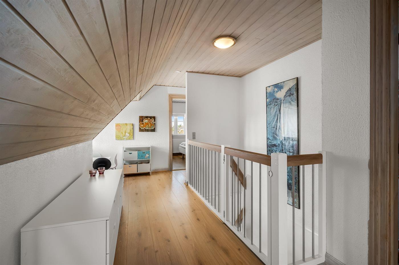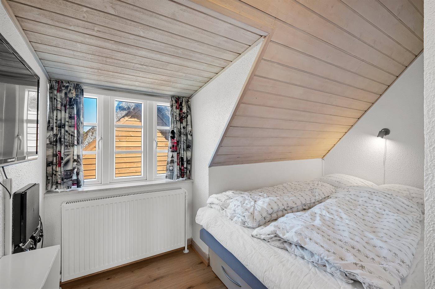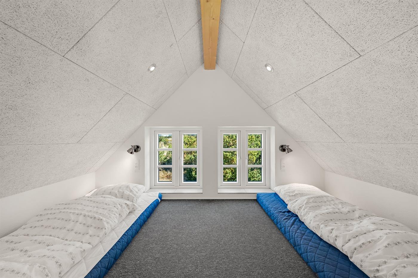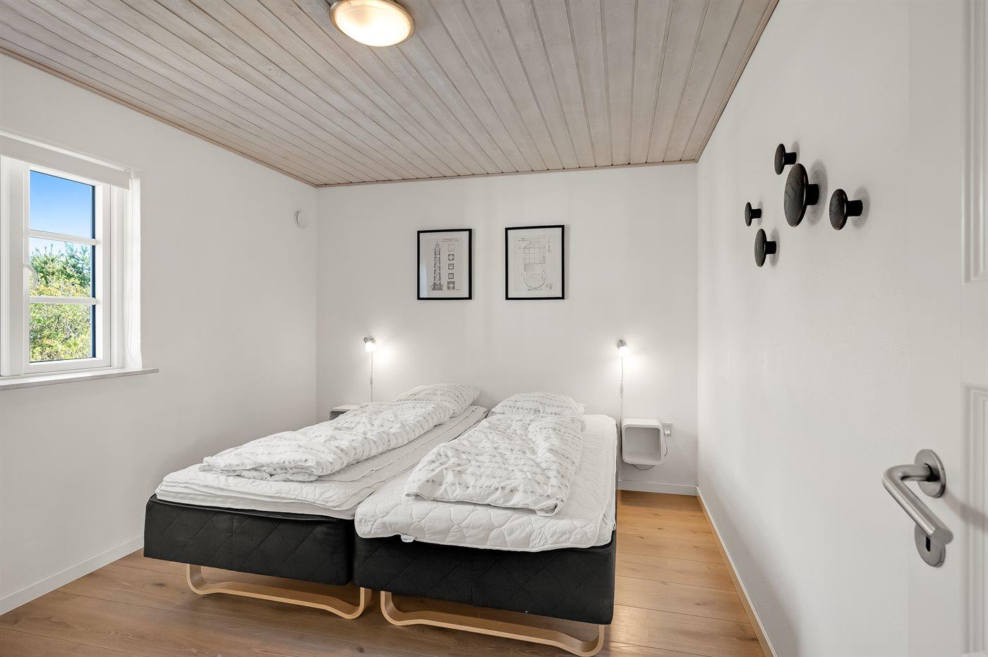 Der er i alt 5 soveværelser. Sovepladserne fordeler sig på: 10 sovepladser i dobbeltsenge. 2 sovepladser i enkeltsenge. 2 sovepladser på madrasser. 2 af disse sovepladser befinder sig på hems i annekset. Derudover er der 1 stk. barneseng. Der er gulvvarme i 2 af soveværelserne.