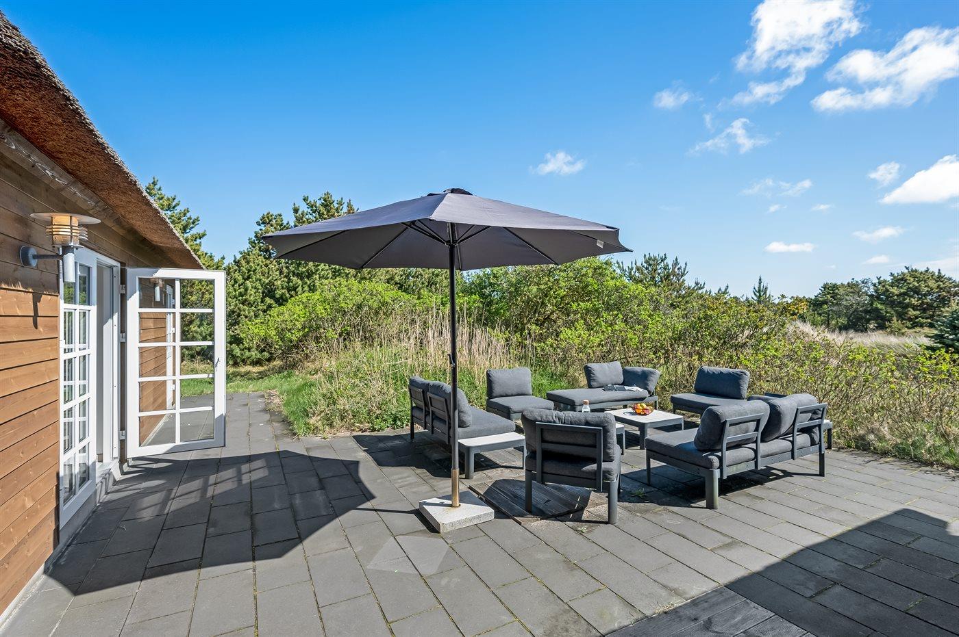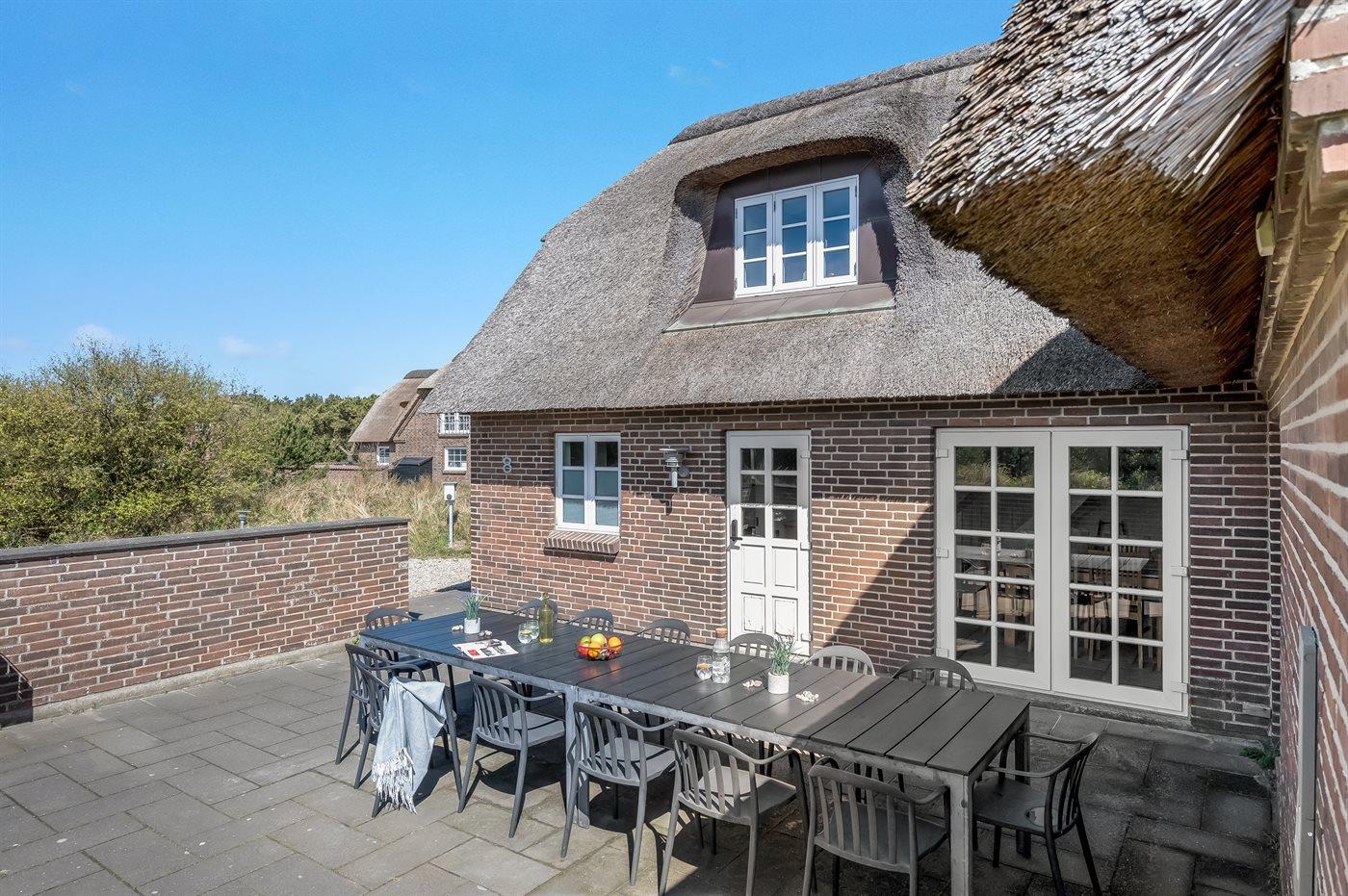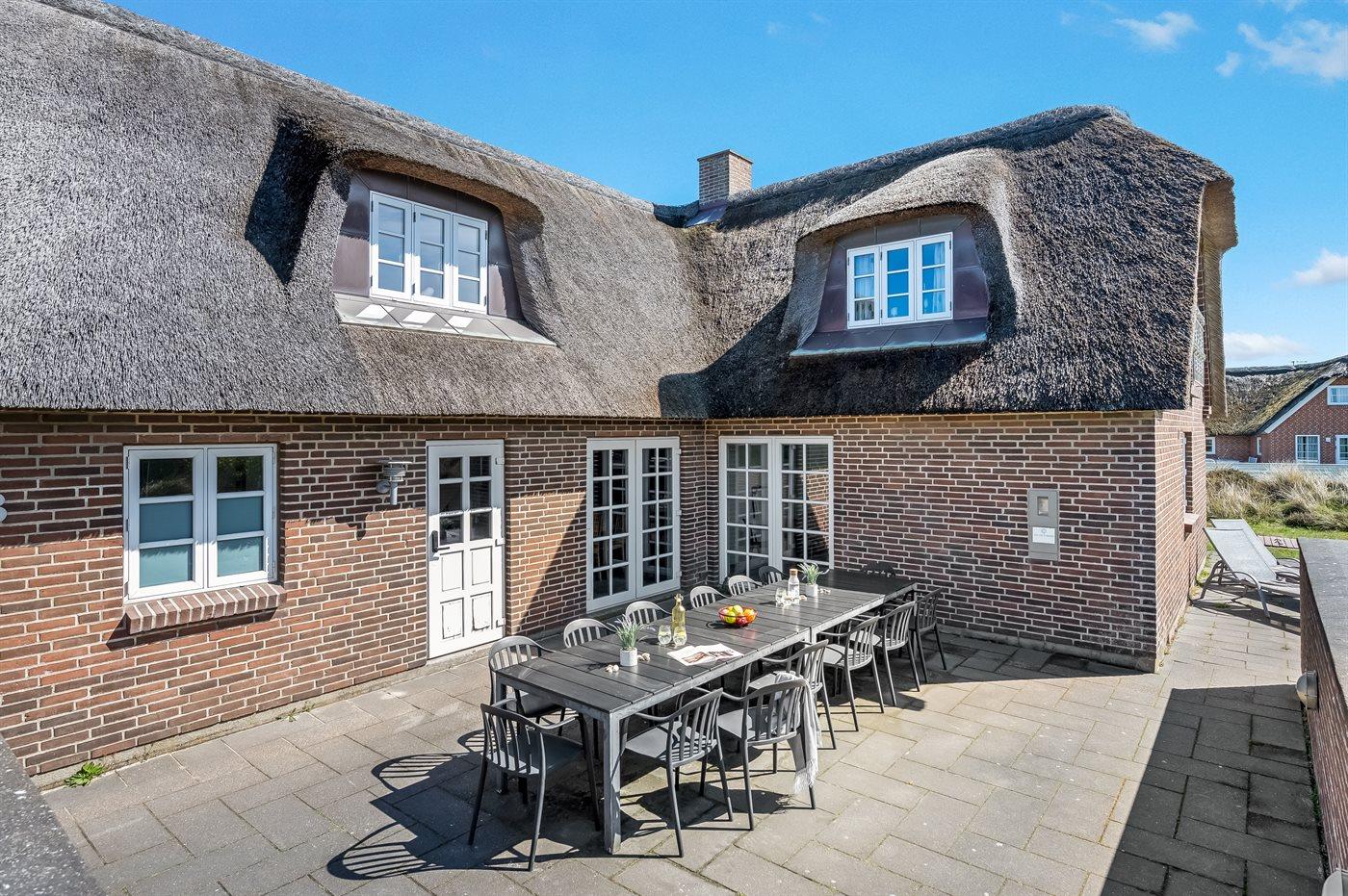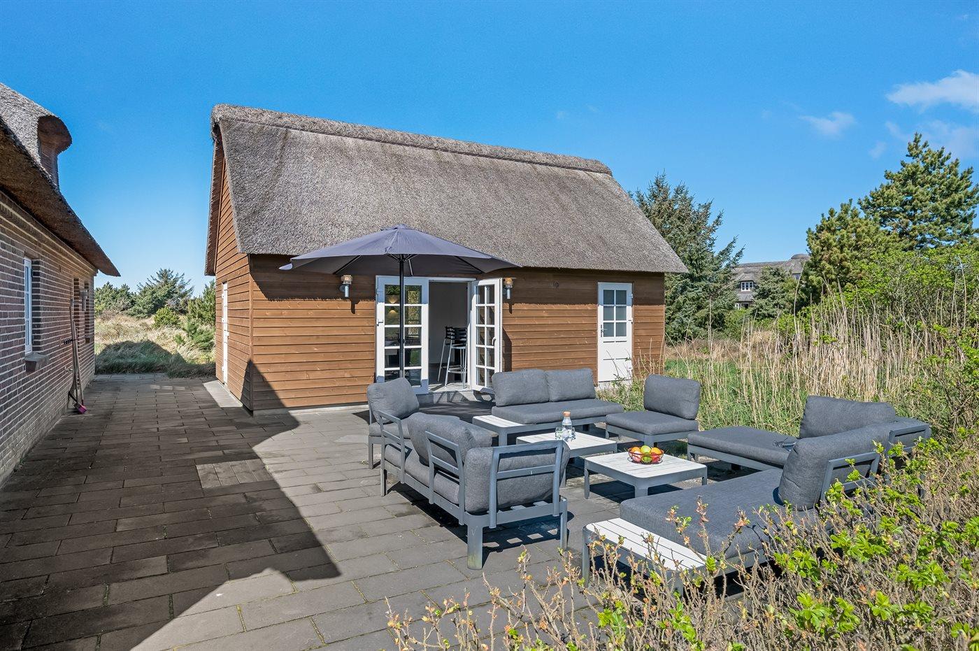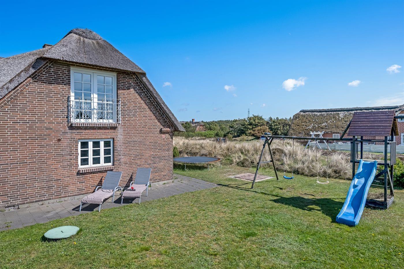 På en af de mest attraktive grunde i Blåvand ligger dette skønne sommerhus med stråtag. Huset er beliggende på en meget stor grund nær havet og en af Danmarks bedste badestrande. Fra husets 1. sal er der en flot udsigt over havet og den smukke natur i området samt til Blåvand Fyr.