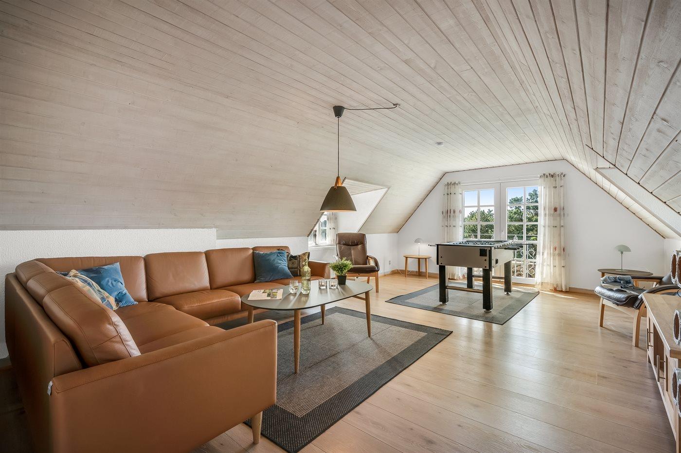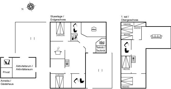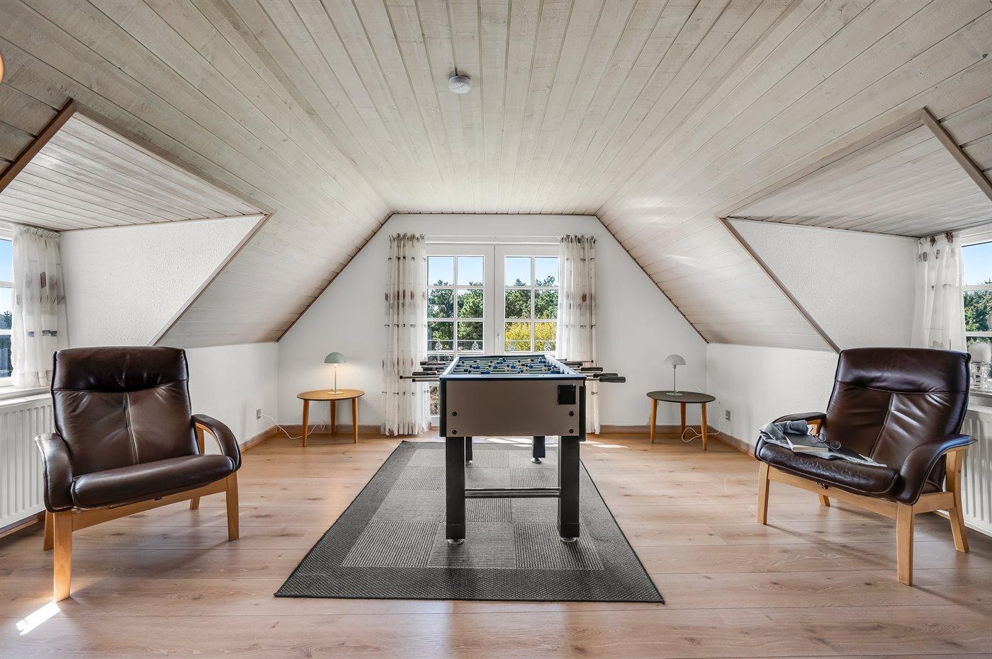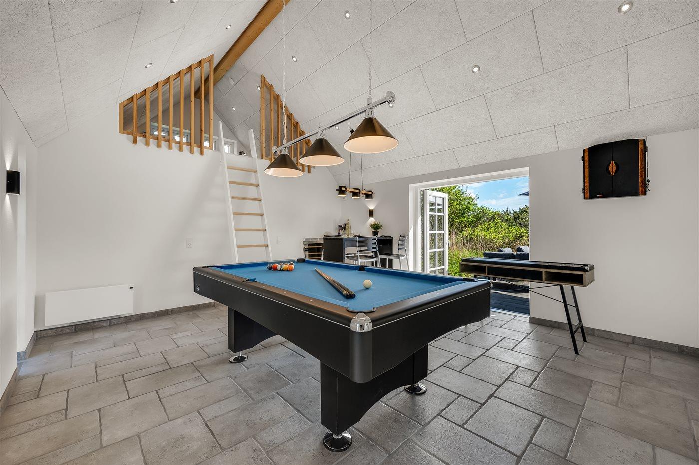 I aktivitetsrummet er der følgende udstyr: Poolbord. Dart. Storskærm med soundbar. Vinkøleskab. Bordfodbold er dog placeret i stuen på husets 1. sal.
