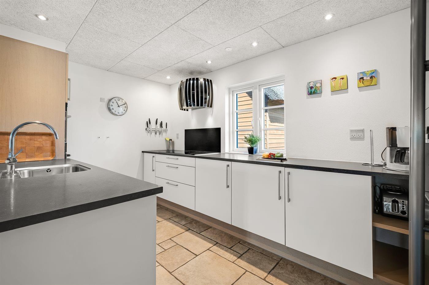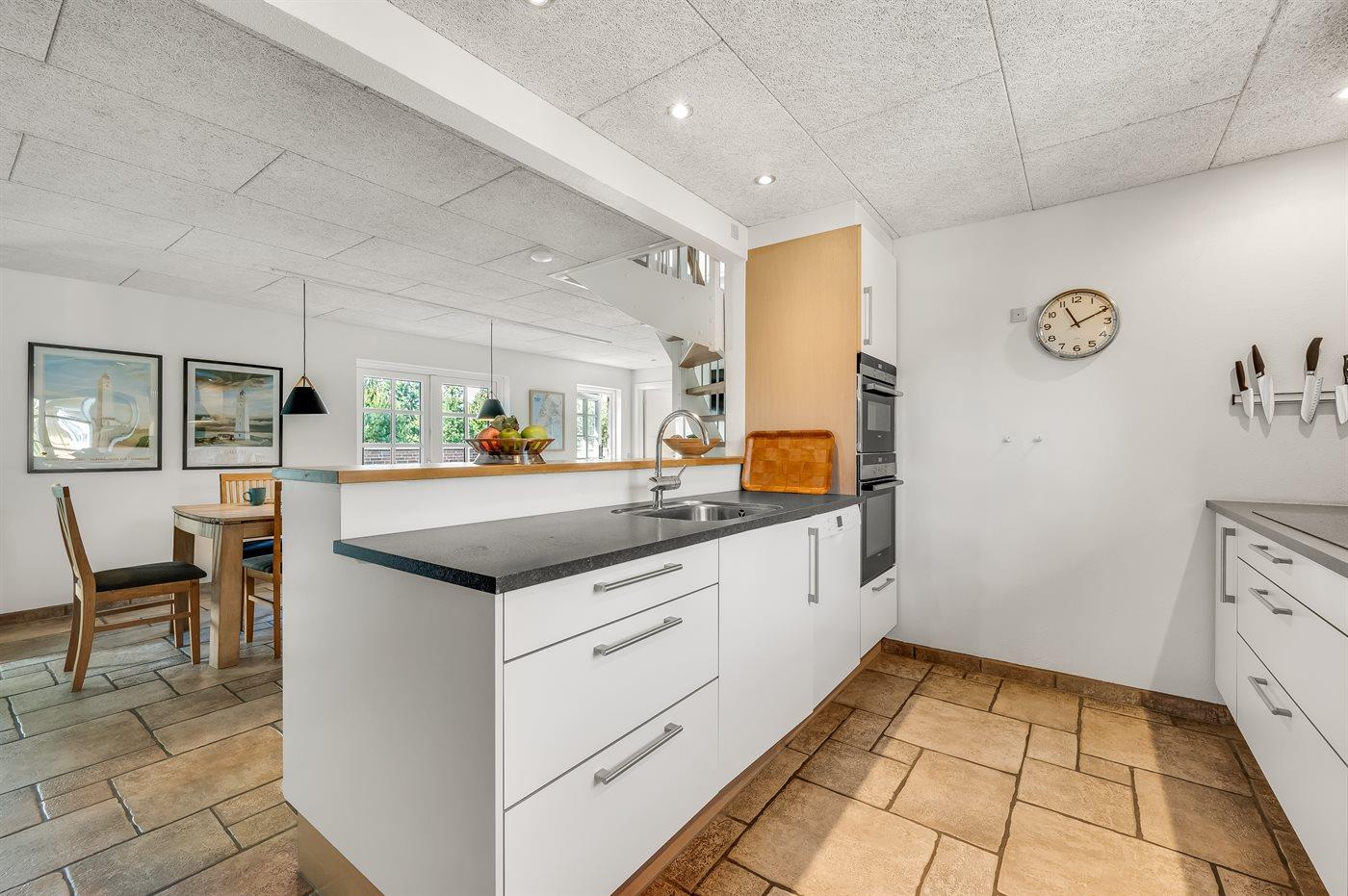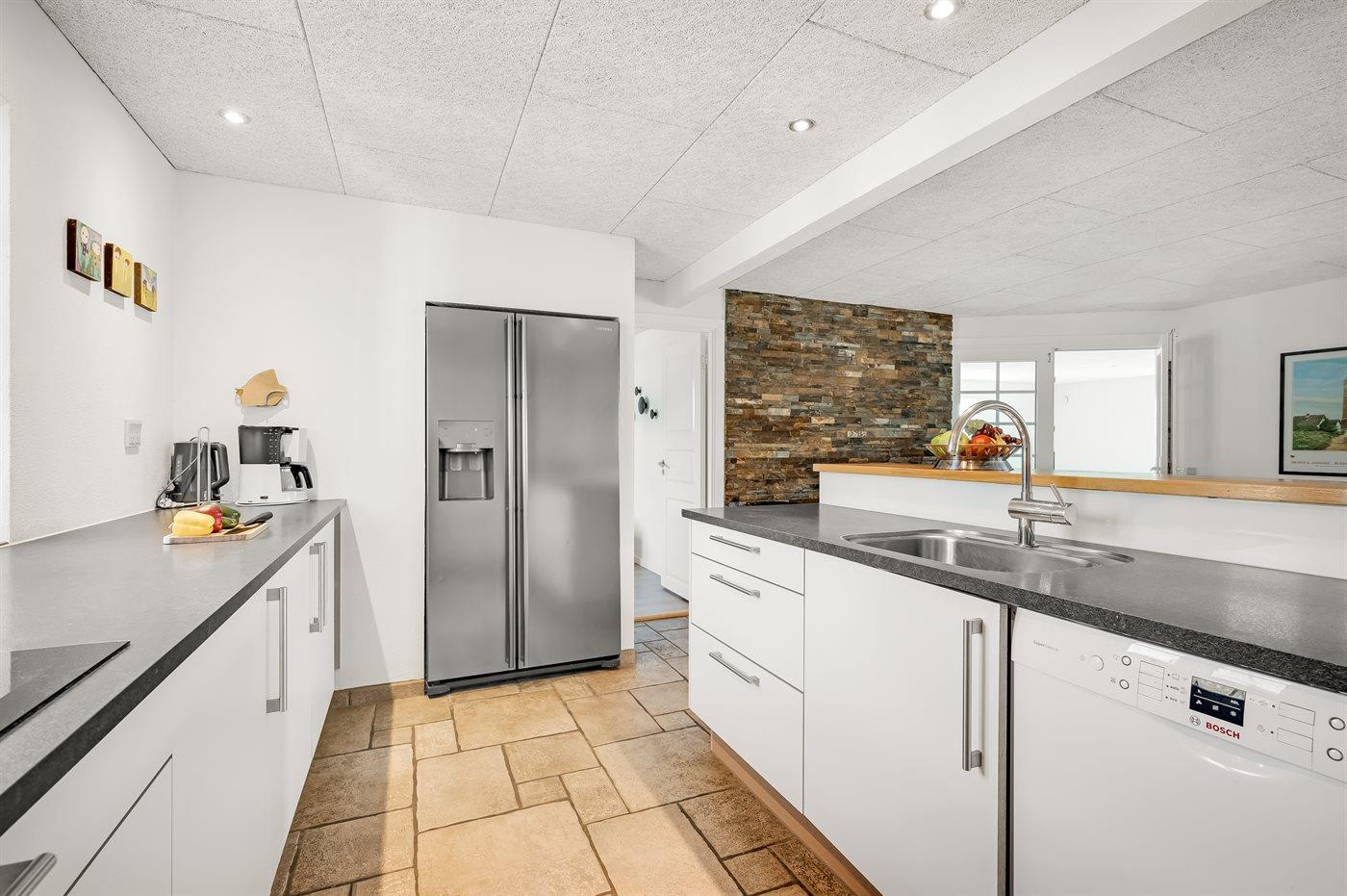 Køkkenet er udstyret med 1 amerikansk køleskab. Der er 5 induktionskogeplader, varmluftovn, mikrobølgeovn samt opvaskemaskine.