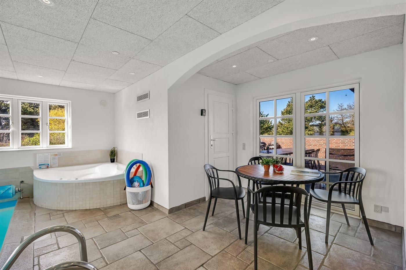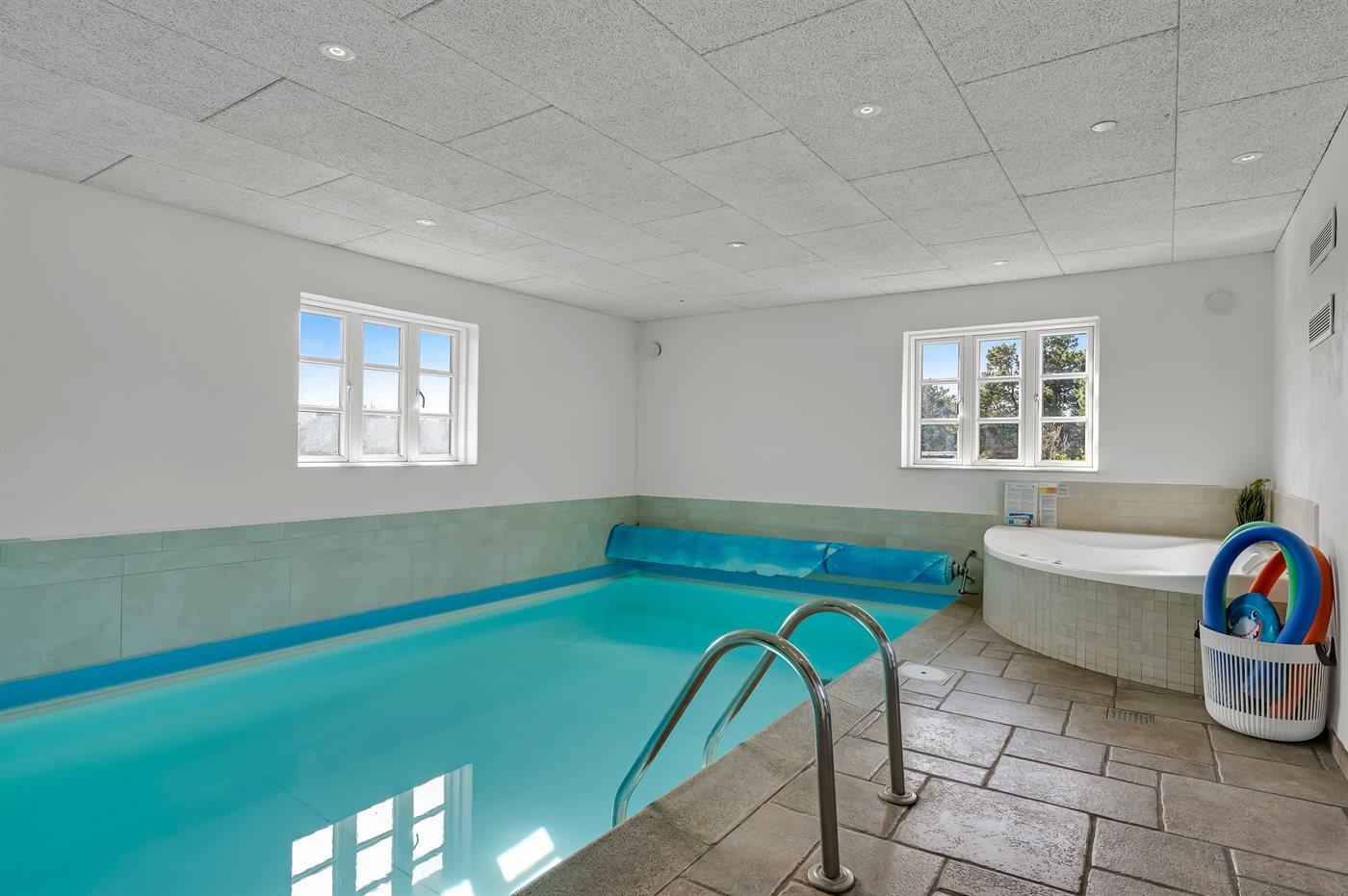 I den indendørs swimmingpool er der mulighed for leg og hyggeligt samvær. Swimmingpoolen måler op til 3 m i bredden, 6 m i længden og den er op til 1,3 m dyb. Vandet er mellem 24 og 28° C varmt. Der er gulvvarme i swimmingpoolområdet.