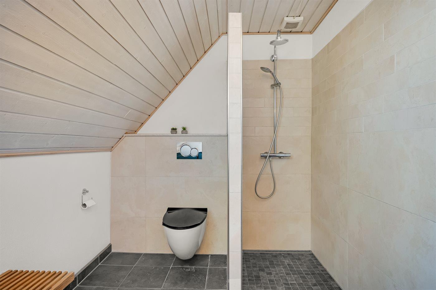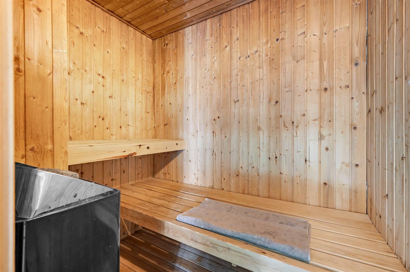 Der er 3 badeværelser med bruseniche og 3 toiletter. Der er gulvvarme på 3 badeværelser. I saunaen er der mulighed for afslapning.