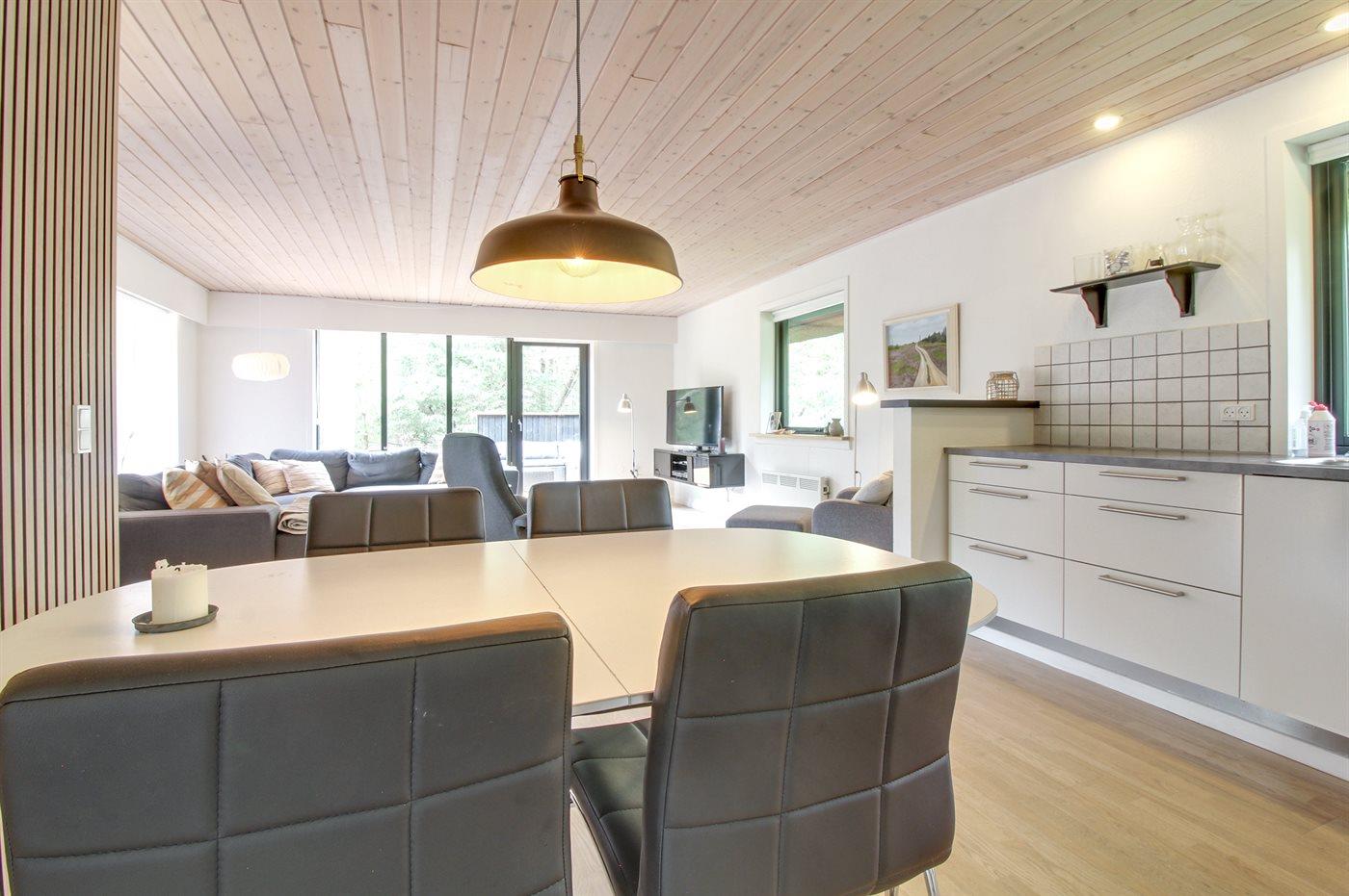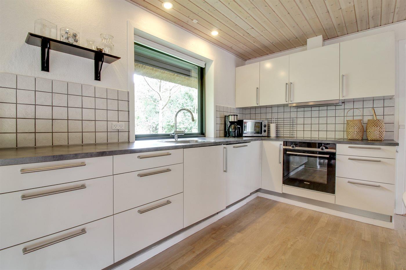 Køkkenet er udstyret med 1 køleskab. Der er 4 keramiske kogeplader, varmluftovn, mikrobølgeovn samt opvaskemaskine.