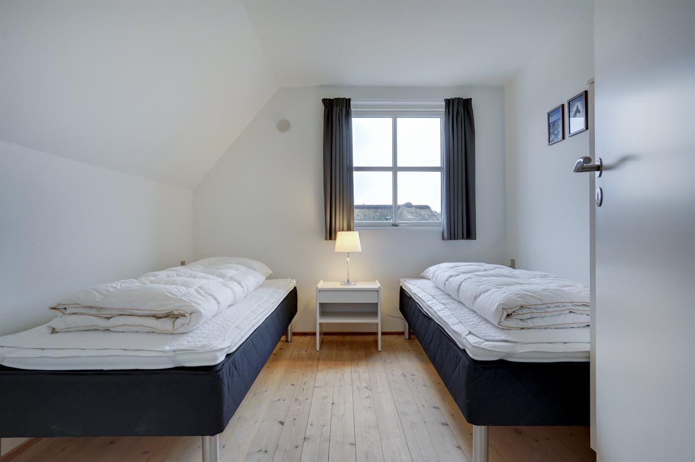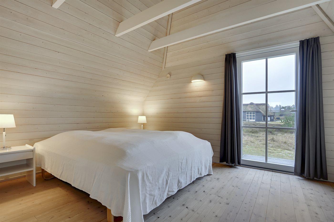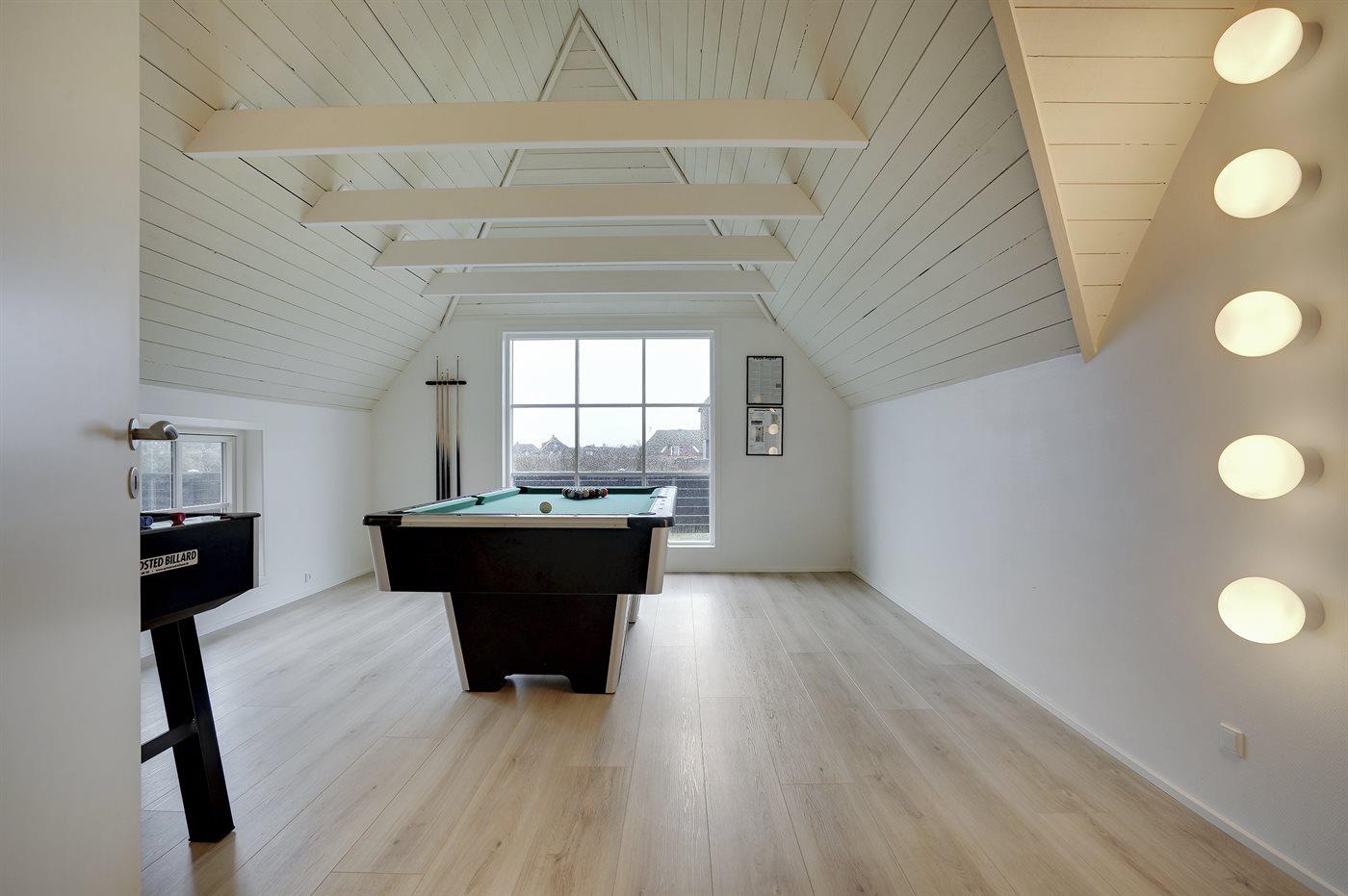 Der er i alt 4 soveværelser. Sovepladserne fordeler sig på: 4 sovepladser i dobbeltsenge. 4 sovepladser i enkeltsenge. 2 sovemuligheder (madrasser) på hems. Der findes 2 skønne badeværelser, begge med gulvvarme, bruseniche og toilet. Fra det ene er der adgang til saunaen, hvor der er mulighed for afslapning. Husets aktivitetsrum, der indeholder pool bord og bordfodbold, har udsigt til Blåvand Fyr. Bryggers med indgang, vaskemaskine og tørretumbler. I et nærliggende rum er der fryser med en kapacitet på 80 liter.