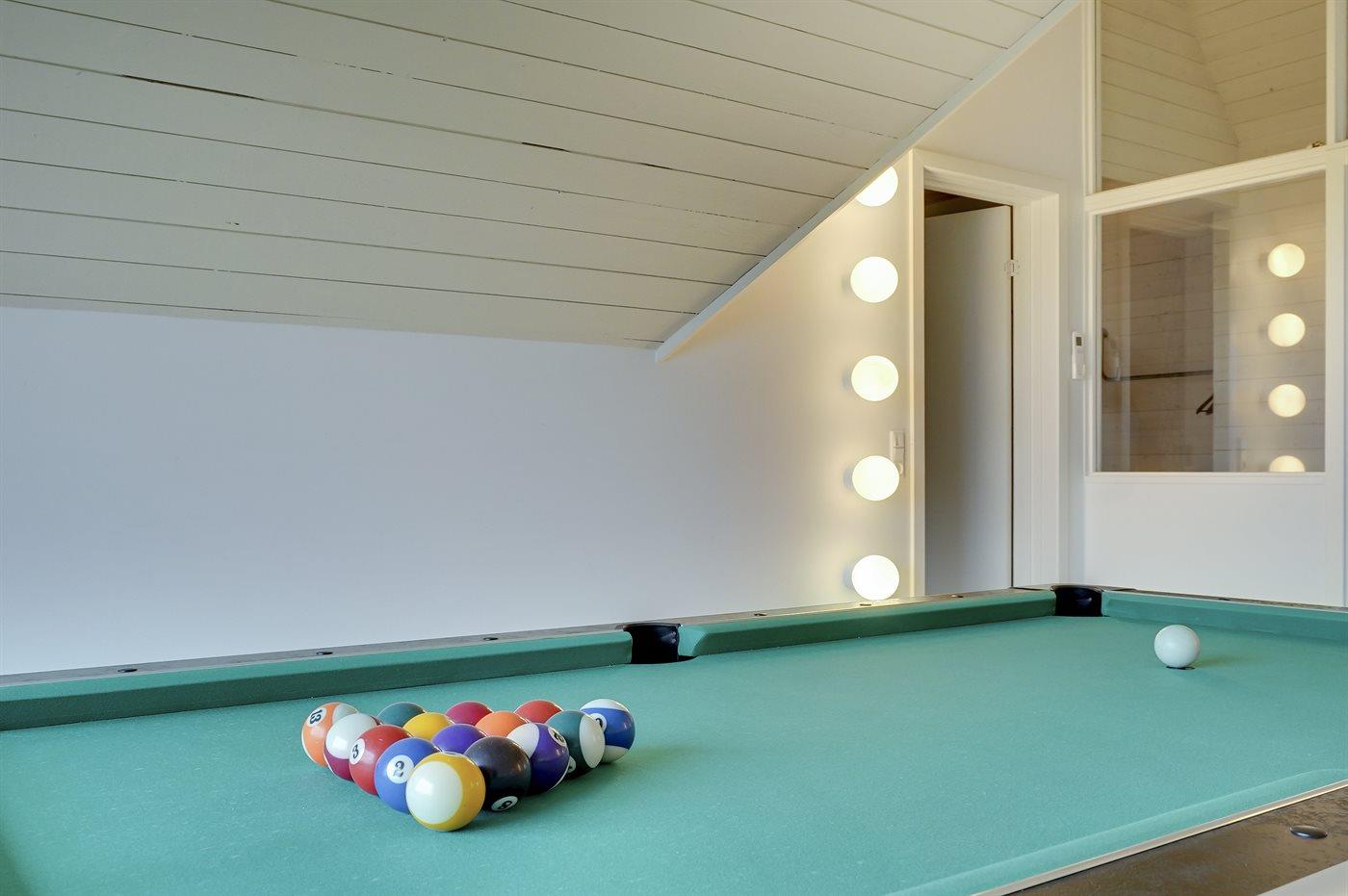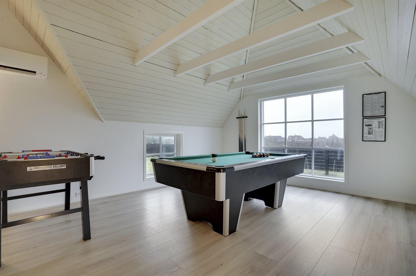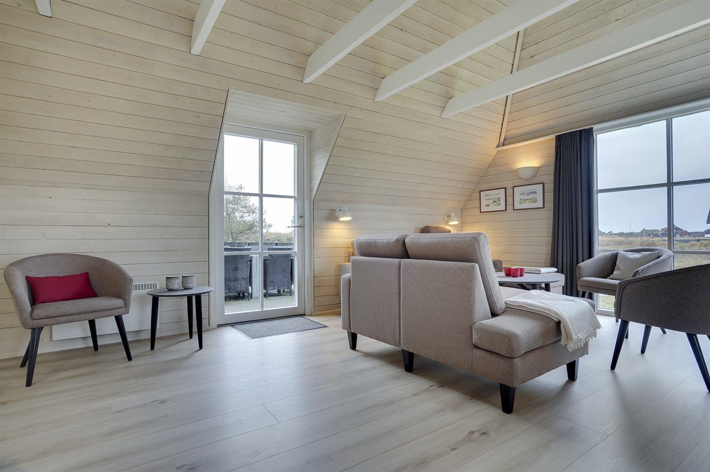 Der er i alt 4 soveværelser. Sovepladserne fordeler sig på: 4 sovepladser i dobbeltsenge. 4 sovepladser i enkeltsenge. 2 sovemuligheder (madrasser) på hems. Der findes 2 skønne badeværelser, begge med gulvvarme, bruseniche og toilet. Fra det ene er der adgang til saunaen, hvor der er mulighed for afslapning. Husets aktivitetsrum, der indeholder pool bord og bordfodbold, har udsigt til Blåvand Fyr. Bryggers med indgang, vaskemaskine og tørretumbler. I et nærliggende rum er der fryser med en kapacitet på 80 liter.