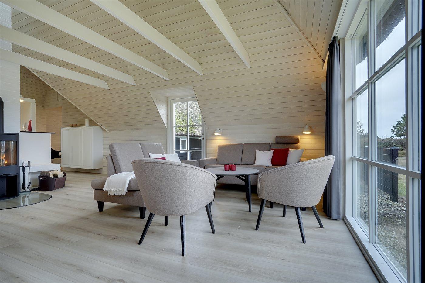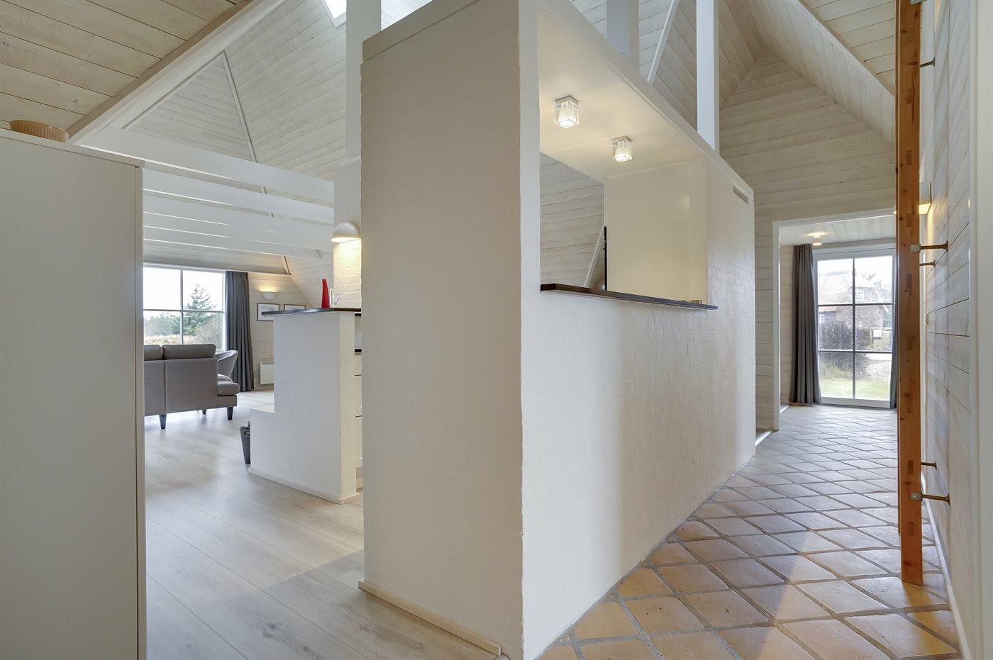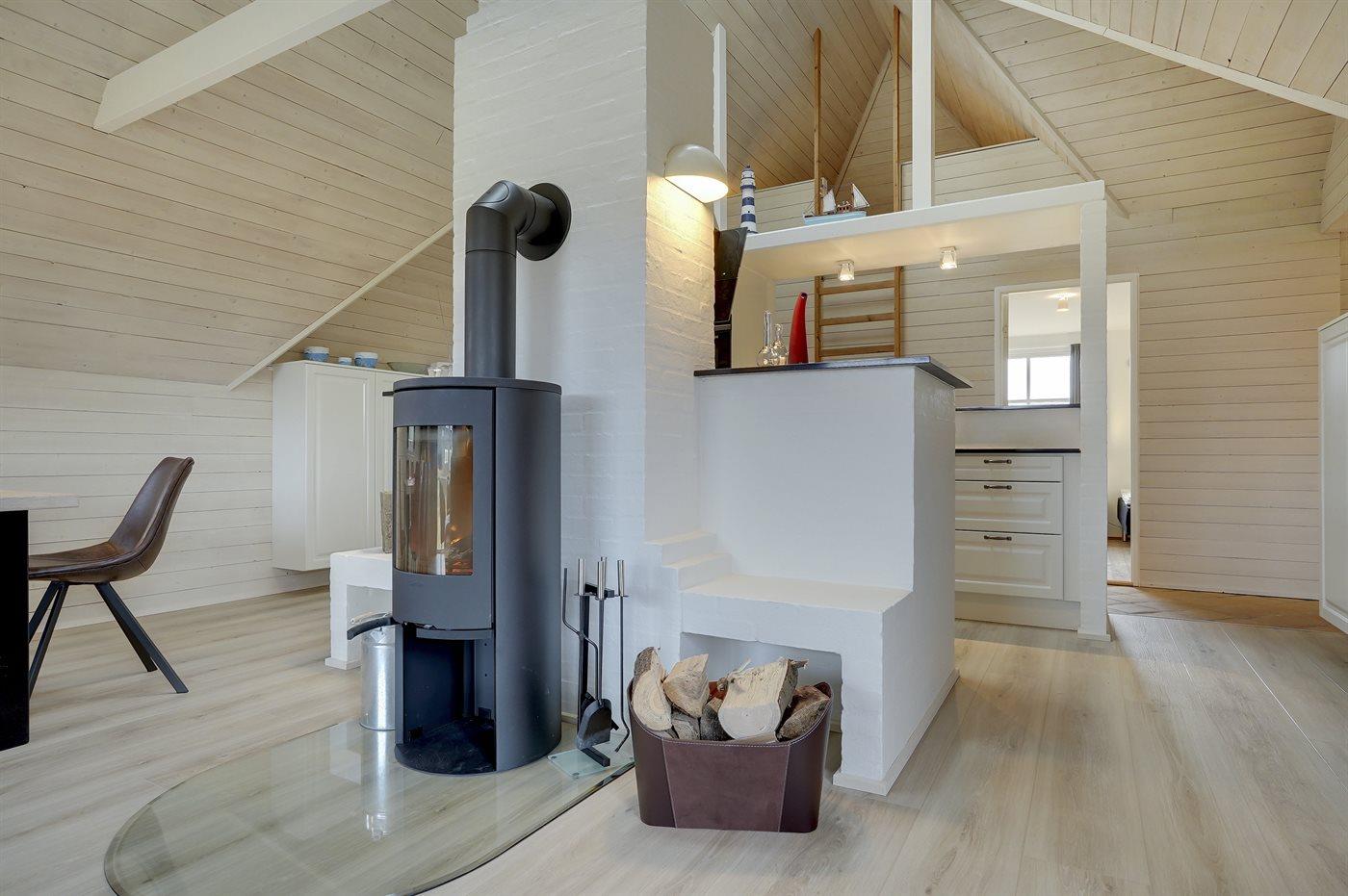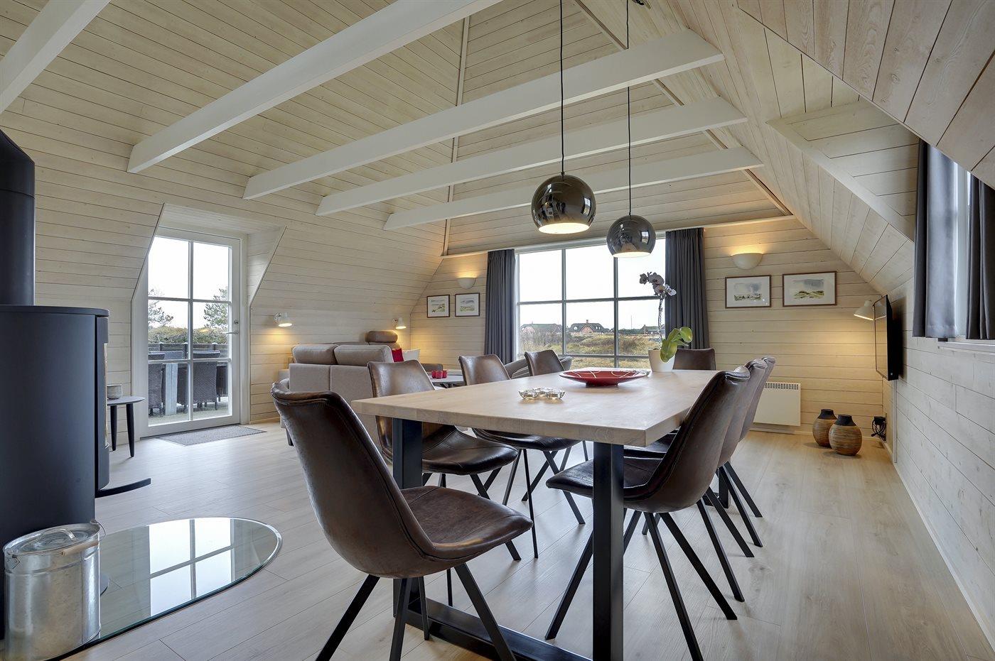 Entreen er lys og rummelig. Det flotte og moderne køkken er kombineret med spise-/opholdsstuen og bl.a. udstyret med integreret opvaskemaskine og køleskab. Sorte polerede granitbordplader, 4 induktionskogeplader, varmluftsovn og combi ovn med mikrobølgeovn. I den lyse, moderne og smagfuldt møblerede spise-/opholdsstue med direkte udgang til en 30 m2 stor terrasse med havemøbler, finder I TV, DAB-radio og brændeovn. Der er mindst 4 danske kanaler. 1-3 svenske kanaler. 1-3 norske kanaler. Mindst 4 tyske kanaler. Der er trådløst internetforbindelse til rådighed.