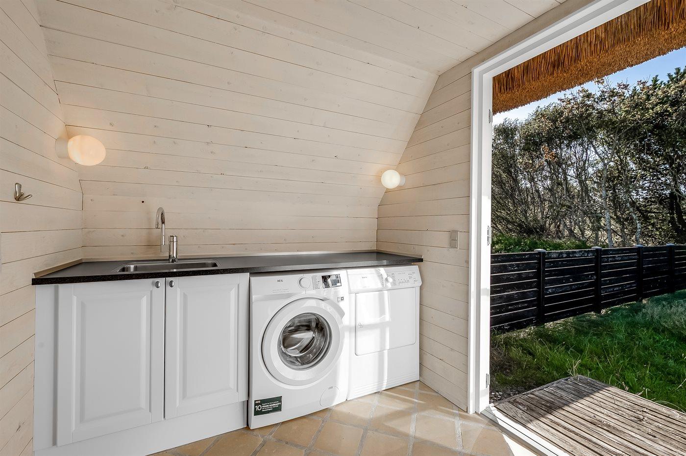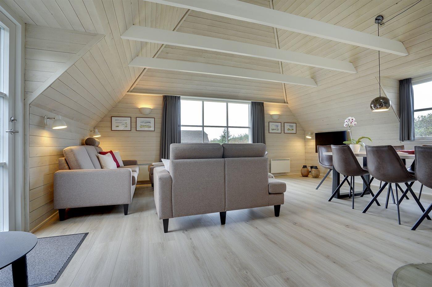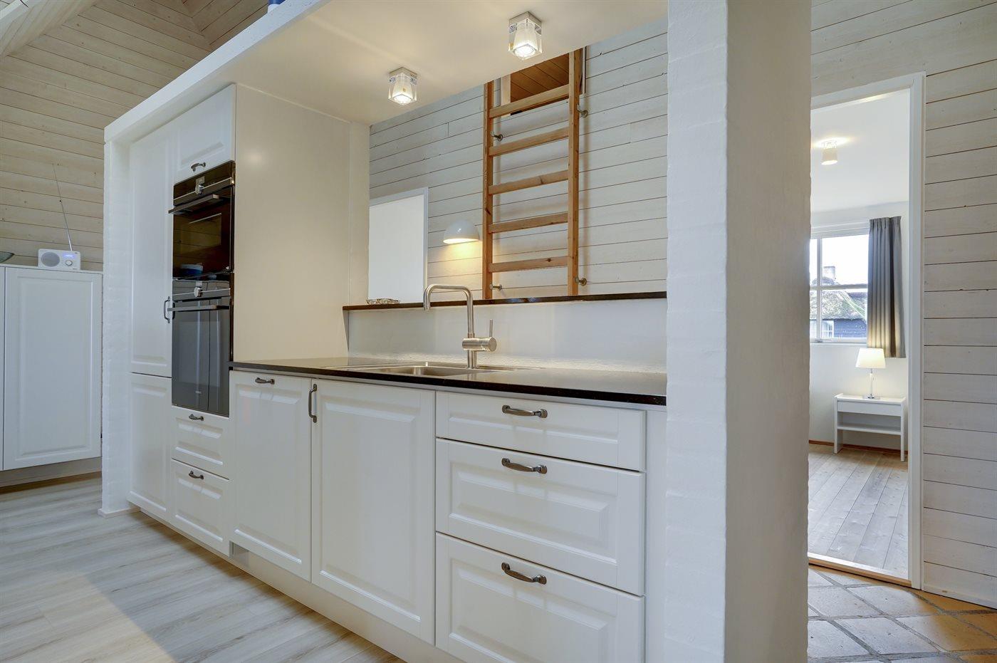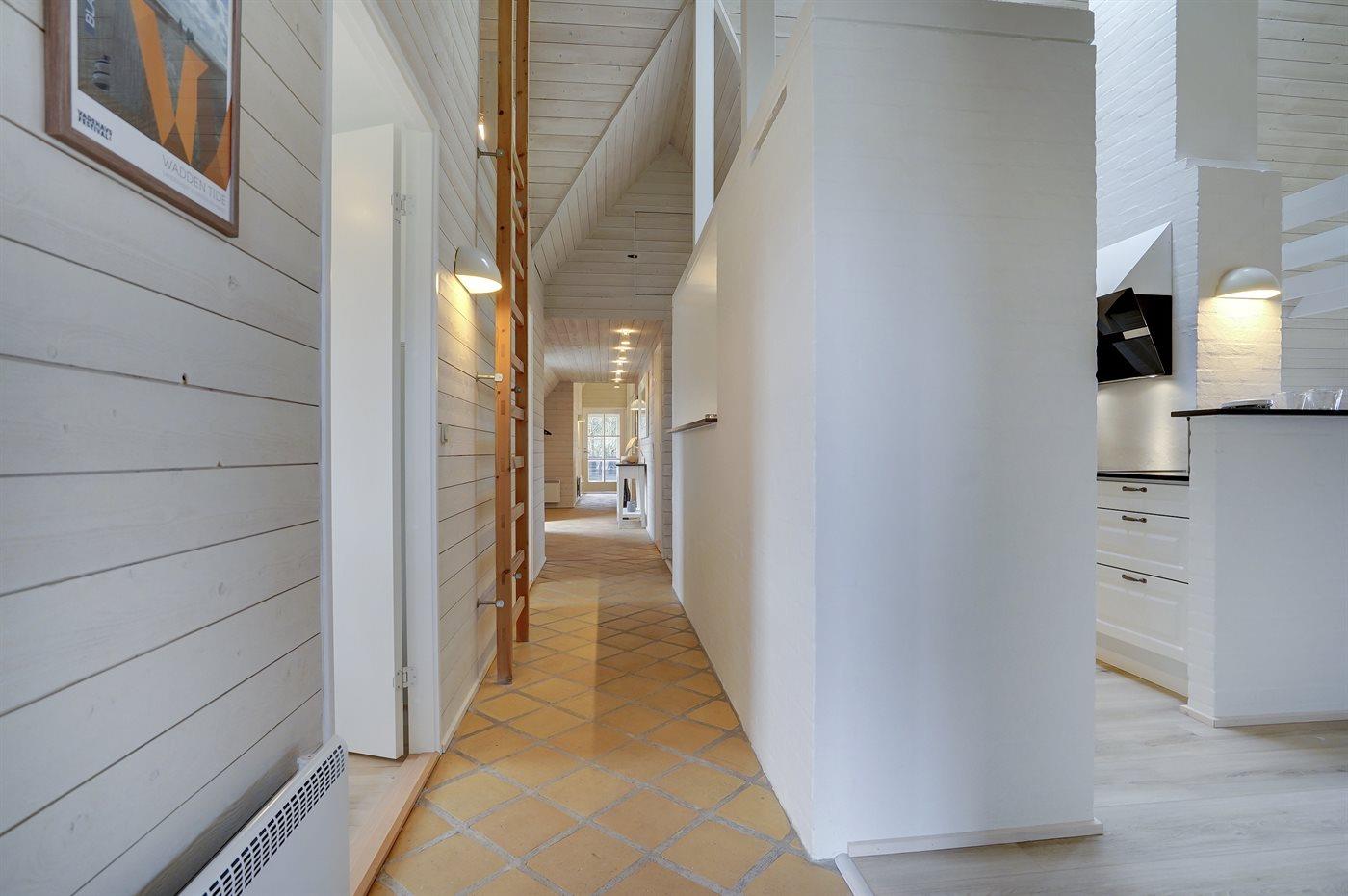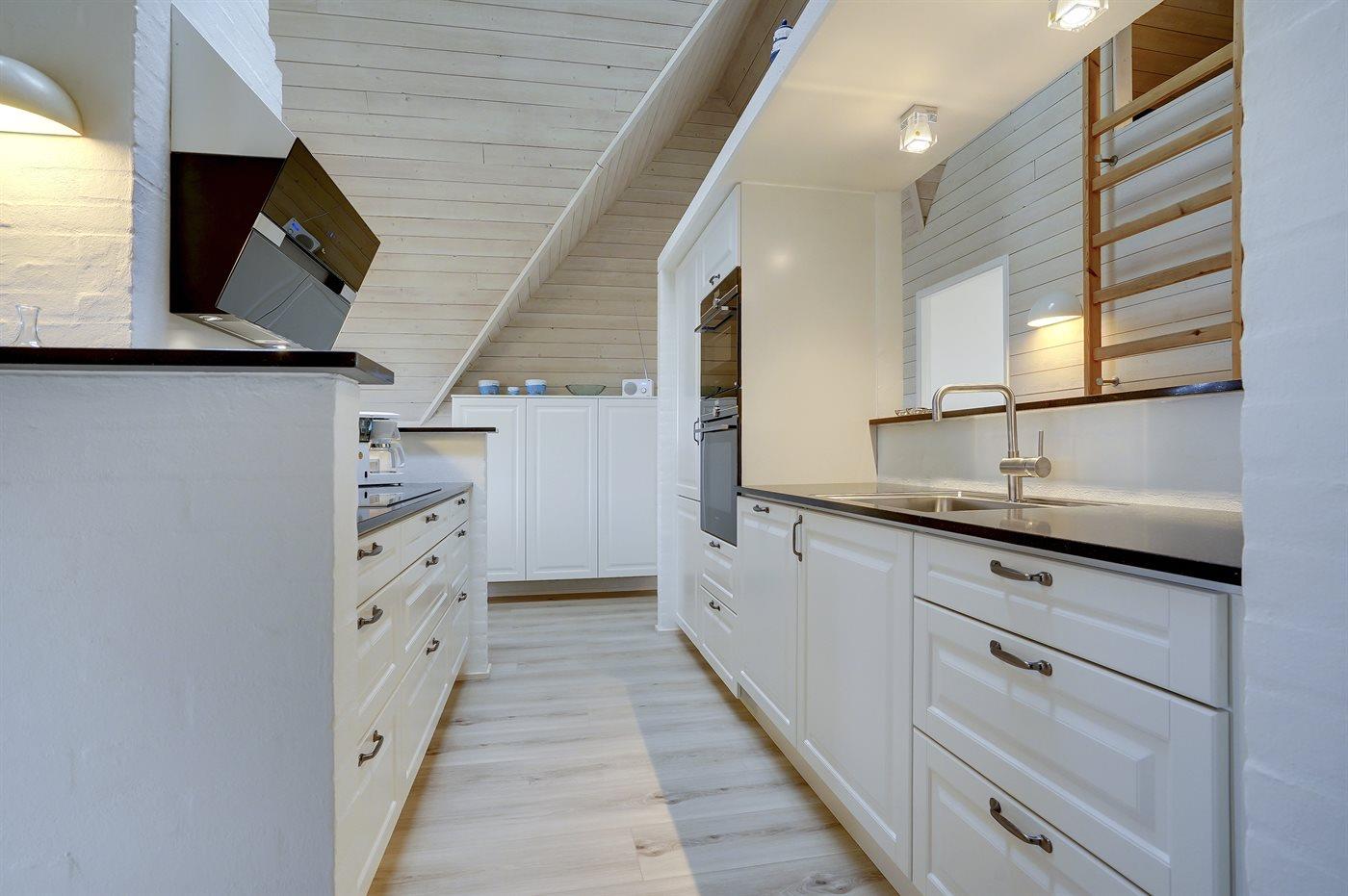 Entreen er lys og rummelig. Det flotte og moderne køkken er kombineret med spise-/opholdsstuen og bl.a. udstyret med integreret opvaskemaskine og køleskab. Sorte polerede granitbordplader, 4 induktionskogeplader, varmluftsovn og combi ovn med mikrobølgeovn. I den lyse, moderne og smagfuldt møblerede spise-/opholdsstue med direkte udgang til en 30 m2 stor terrasse med havemøbler, finder I TV, DAB-radio og brændeovn. Der er mindst 4 danske kanaler. 1-3 svenske kanaler. 1-3 norske kanaler. Mindst 4 tyske kanaler. Der er trådløst internetforbindelse til rådighed.
