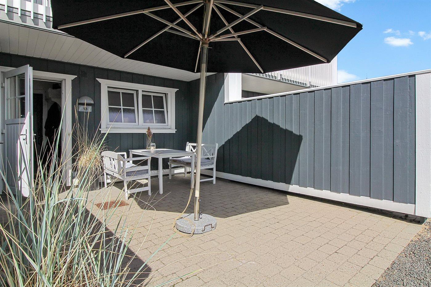 Ferieboligen er beliggende på en 130 m² stor havegrund. Der er 1200 m til havet. Nærmeste forretning er beliggende i en afstand af 200 m. Til ferieboligen hører 30 m² terrasseareal. Desuden er der 10 m² overdækket terrasse. Udgang til altan. Grill til rådighed. Parkering ved ferieboligen.
