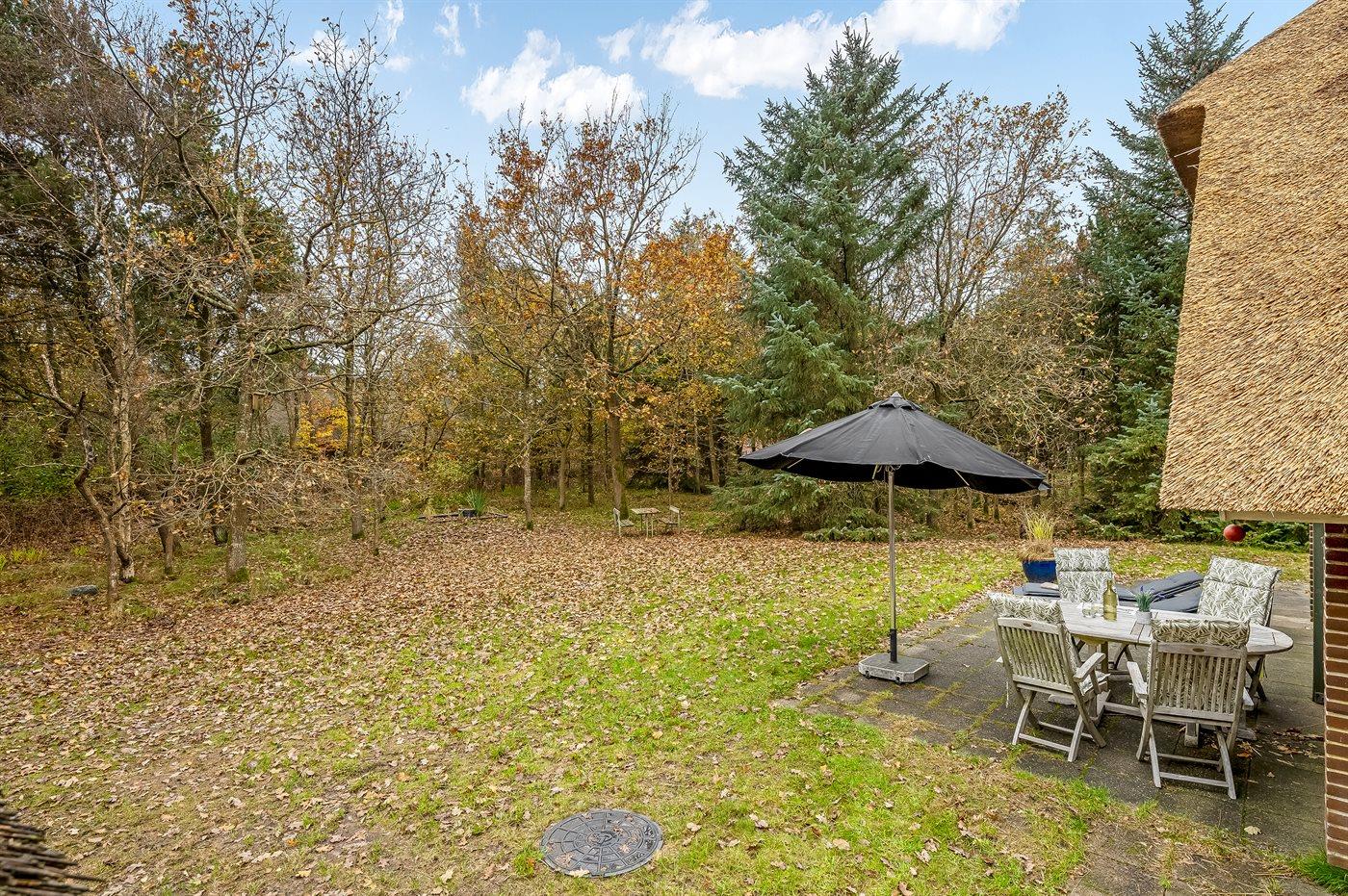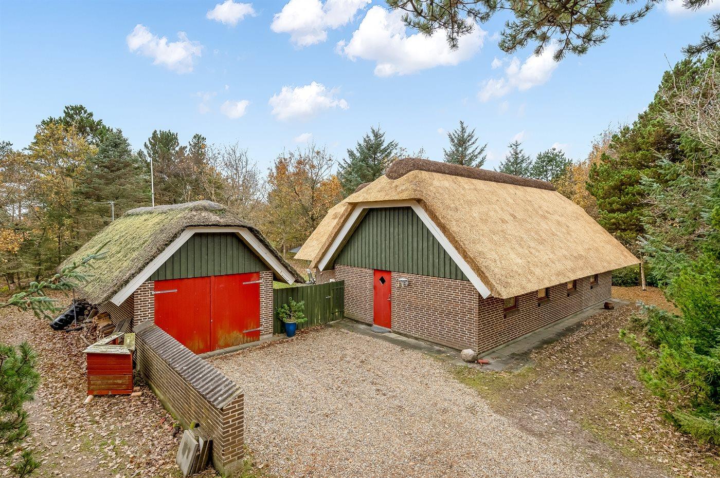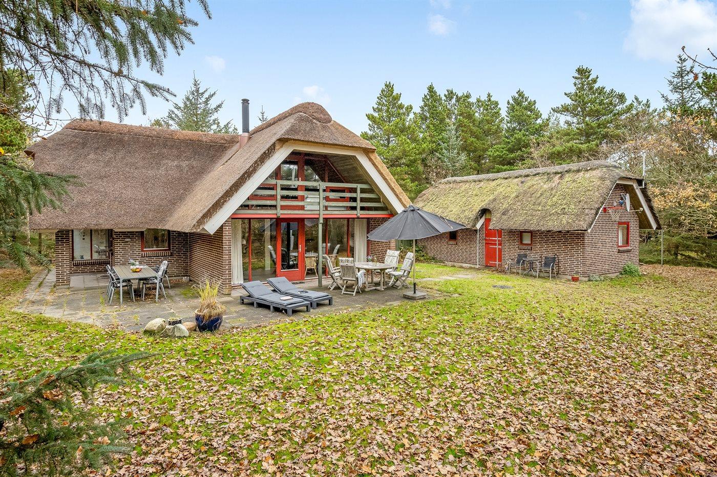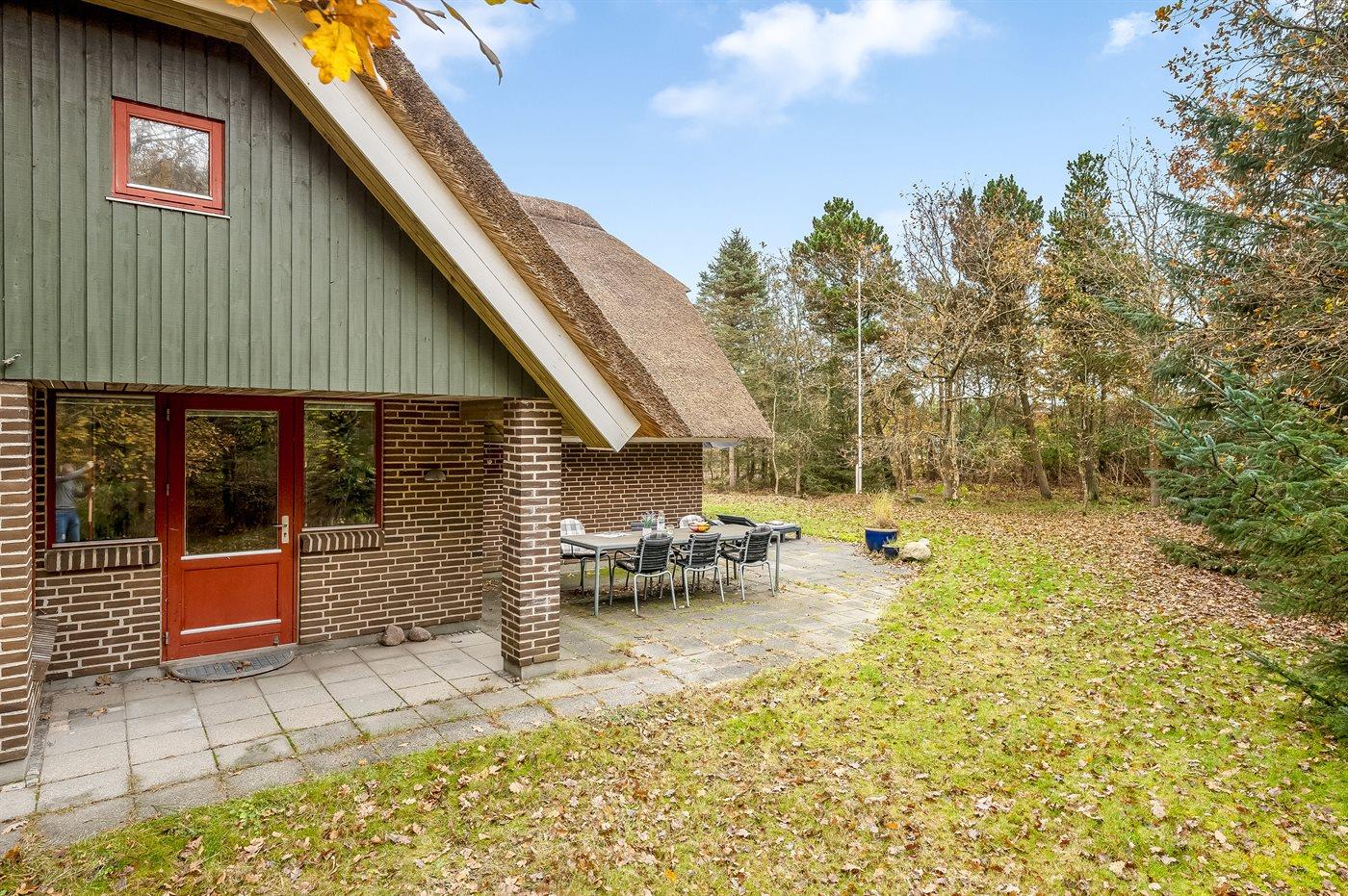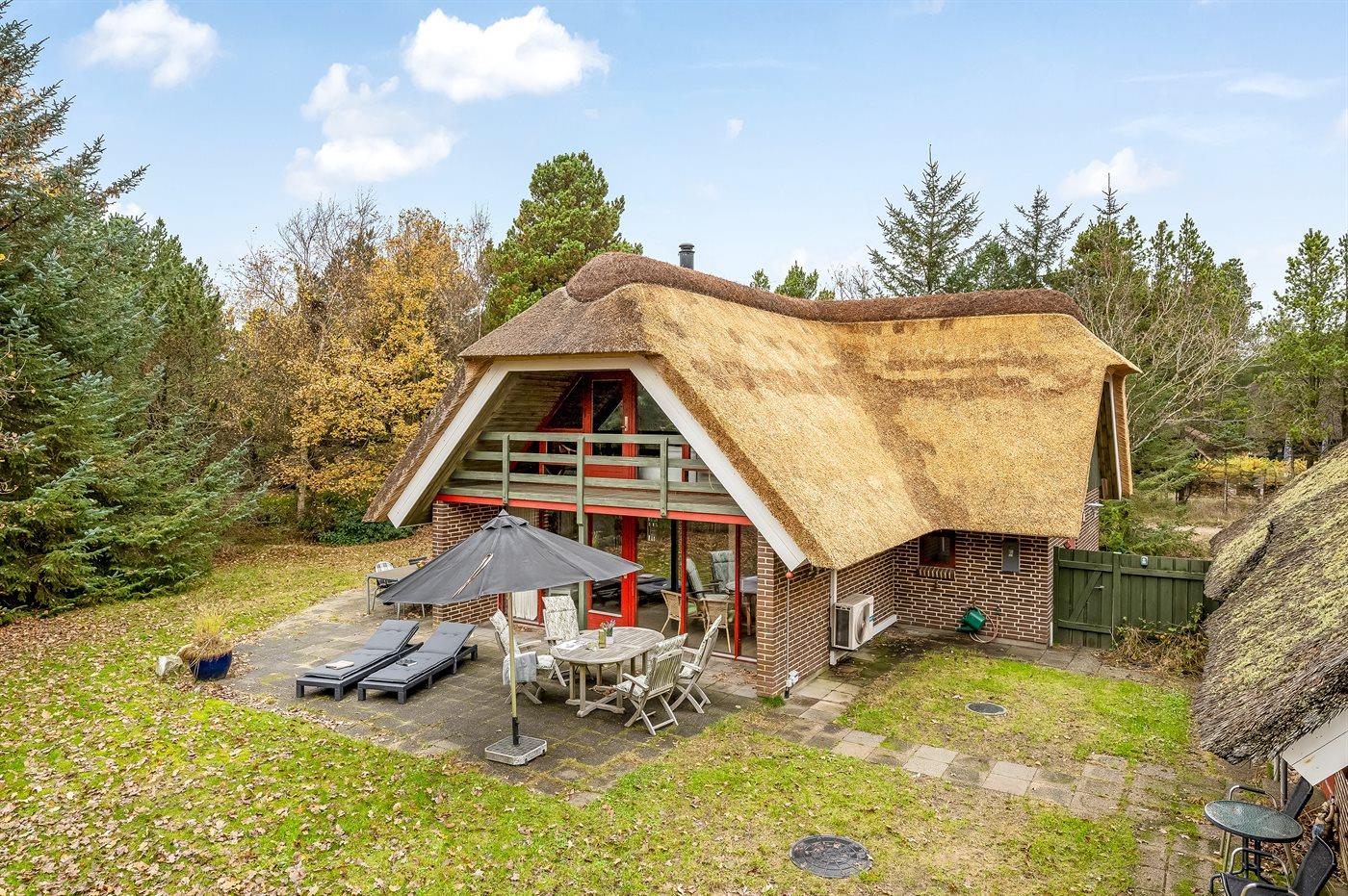 Hyggeligt sommerhus med stråtag nær Blåvands børnevenlige strand på stor grund med terrasse og garage.