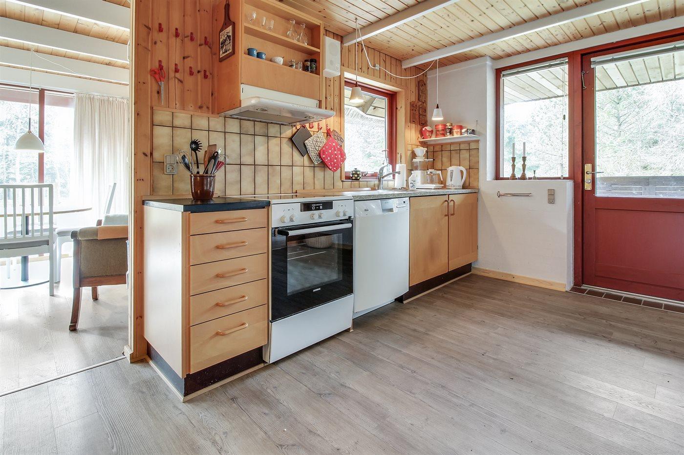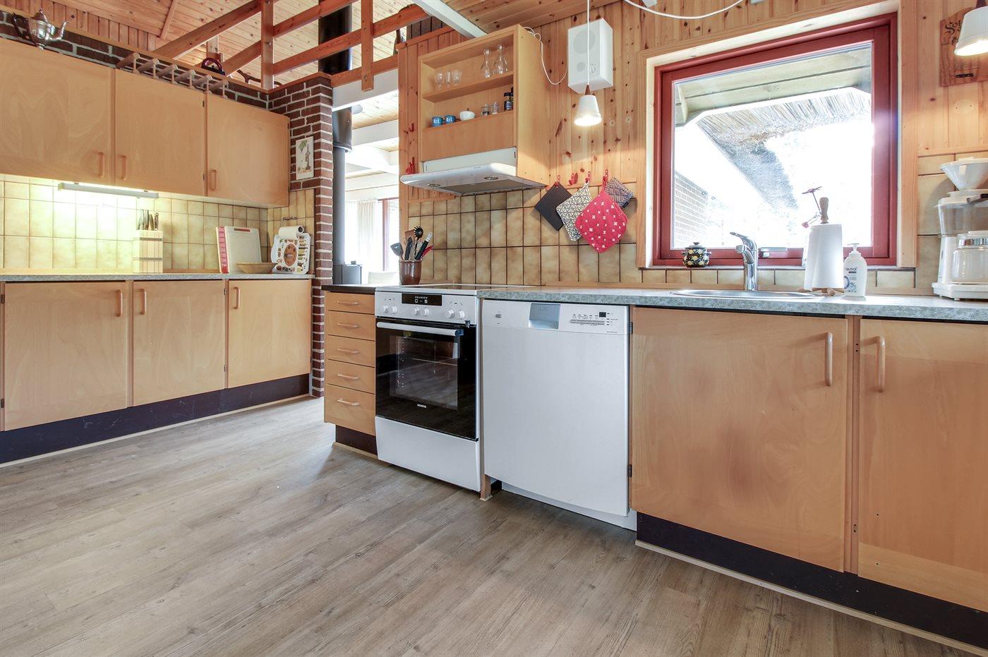 Køkkenet er udstyret med 1 køleskab. Der er 4 elkogeplader, bageovn, mikrobølgeovn samt opvaskemaskine.