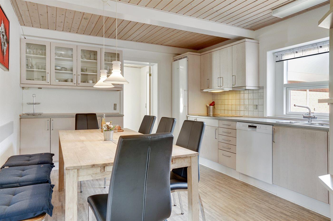 Køkkenet er udstyret med 1 amerikansk køleskab. Der er 4 keramiske kogeplader, varmluftovn, mikrobølgeovn samt opvaskemaskine.