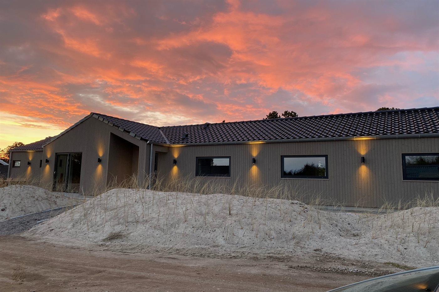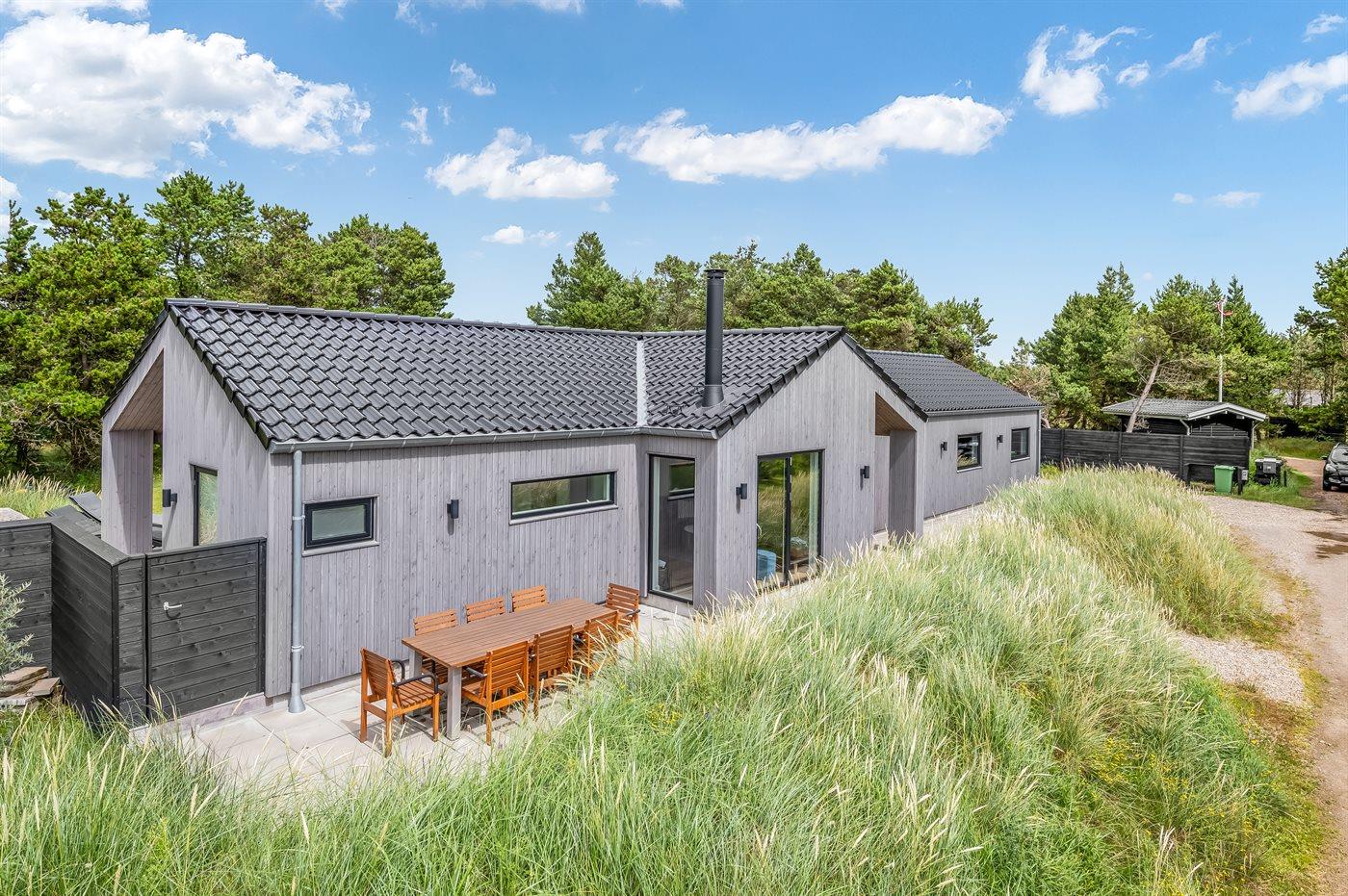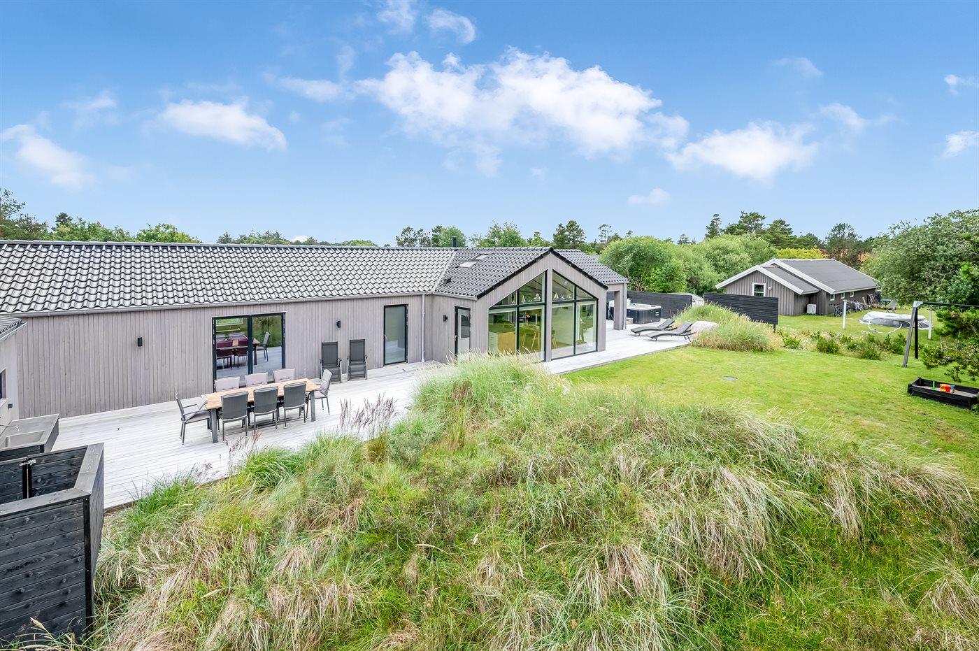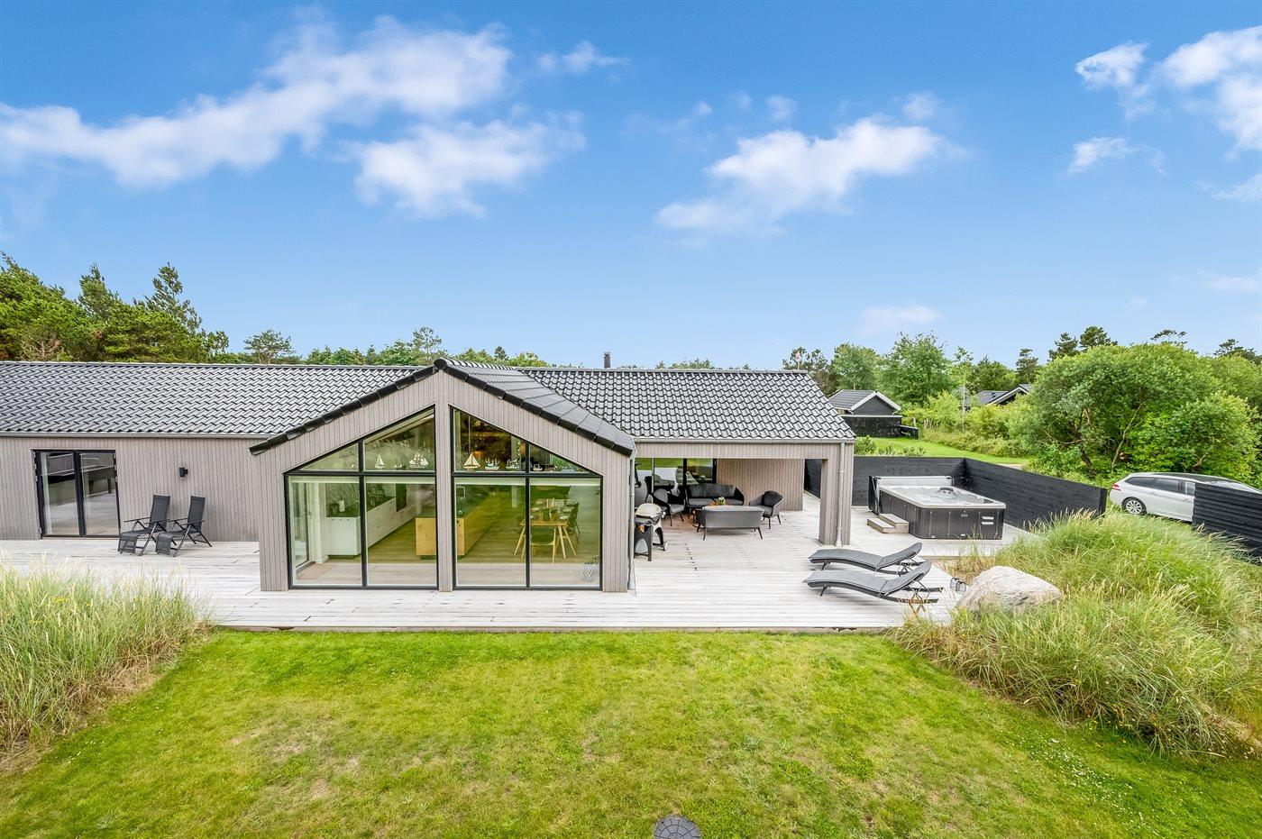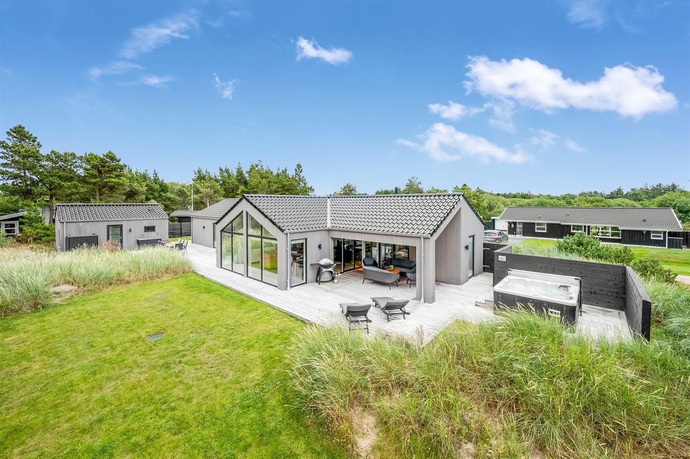 Flot lavenergi sommerhus i Blåvand med spa, sauna og aktivitetsrum på stor naturgrund.
