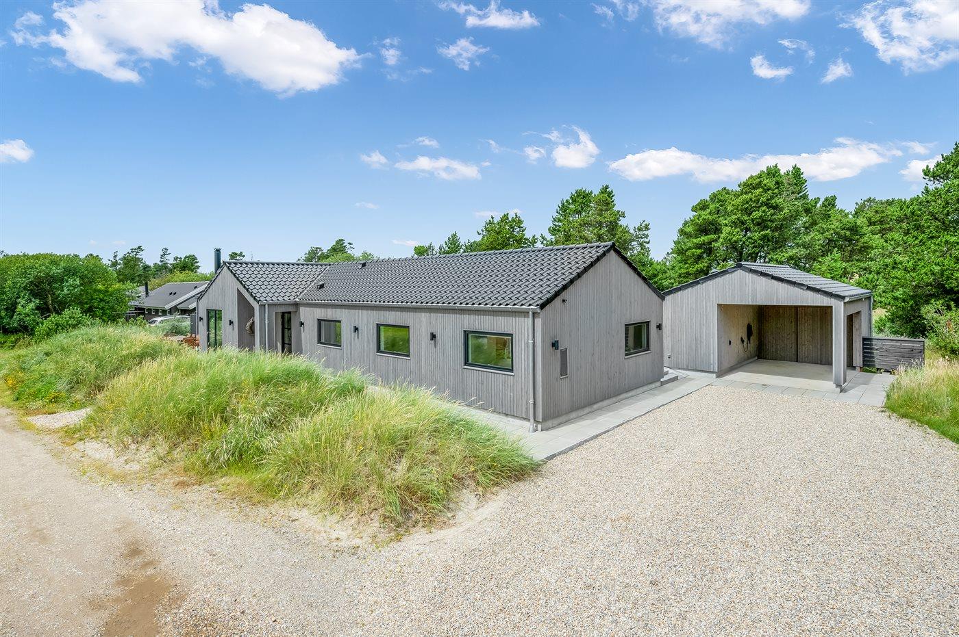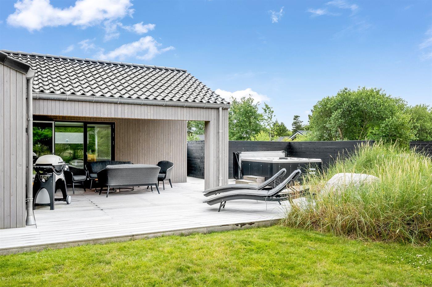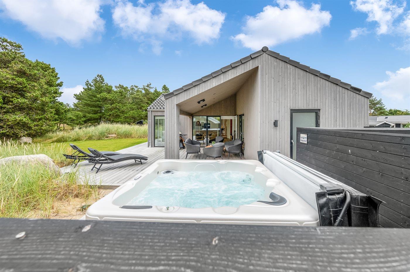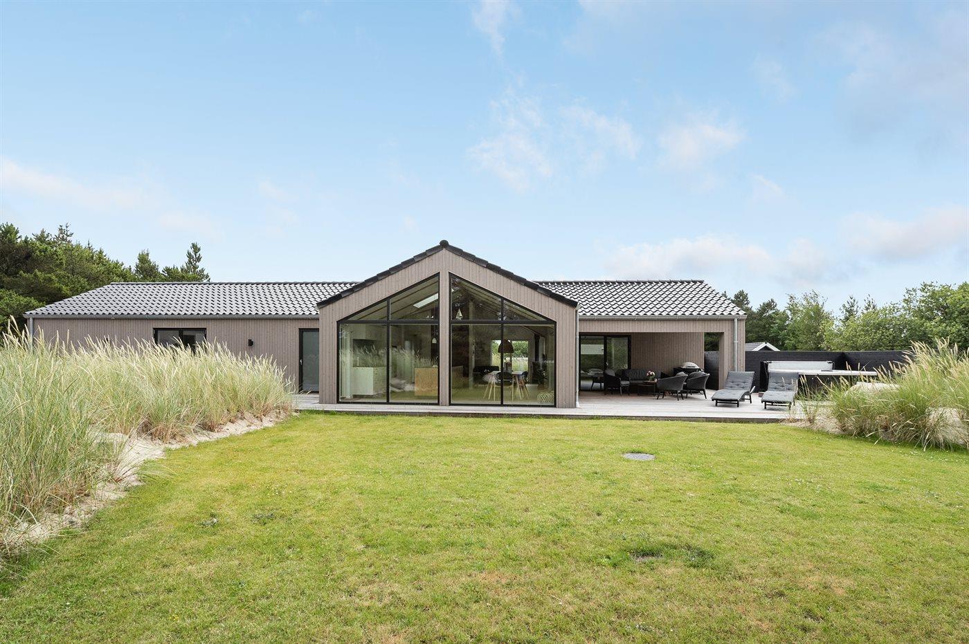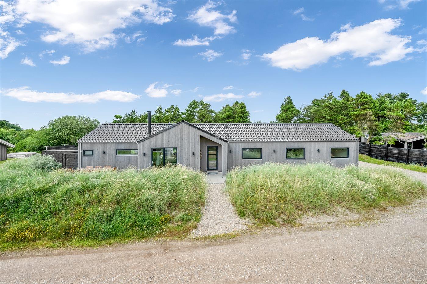 Flot lavenergi sommerhus i Blåvand med spa, sauna og aktivitetsrum på stor naturgrund.