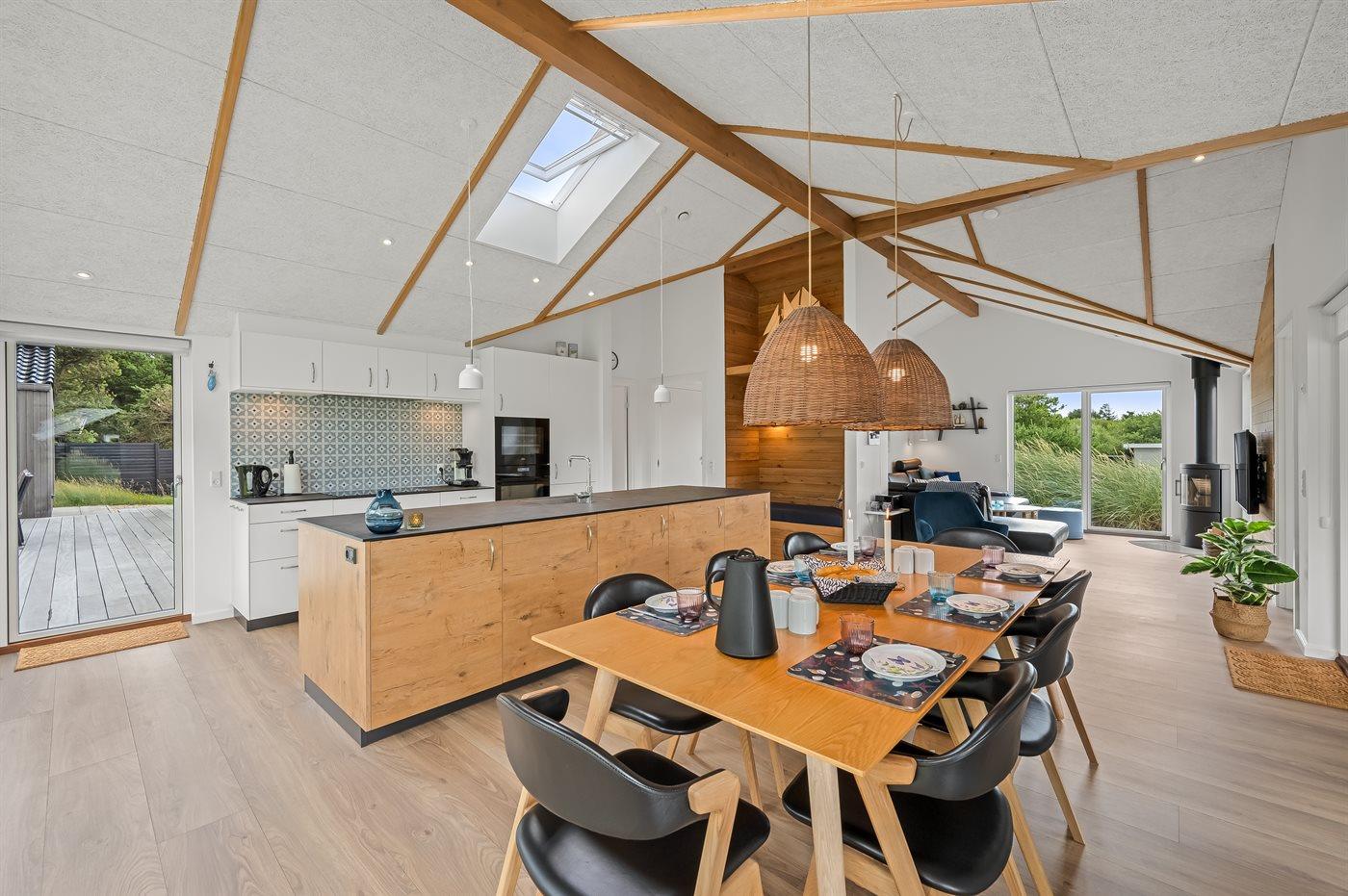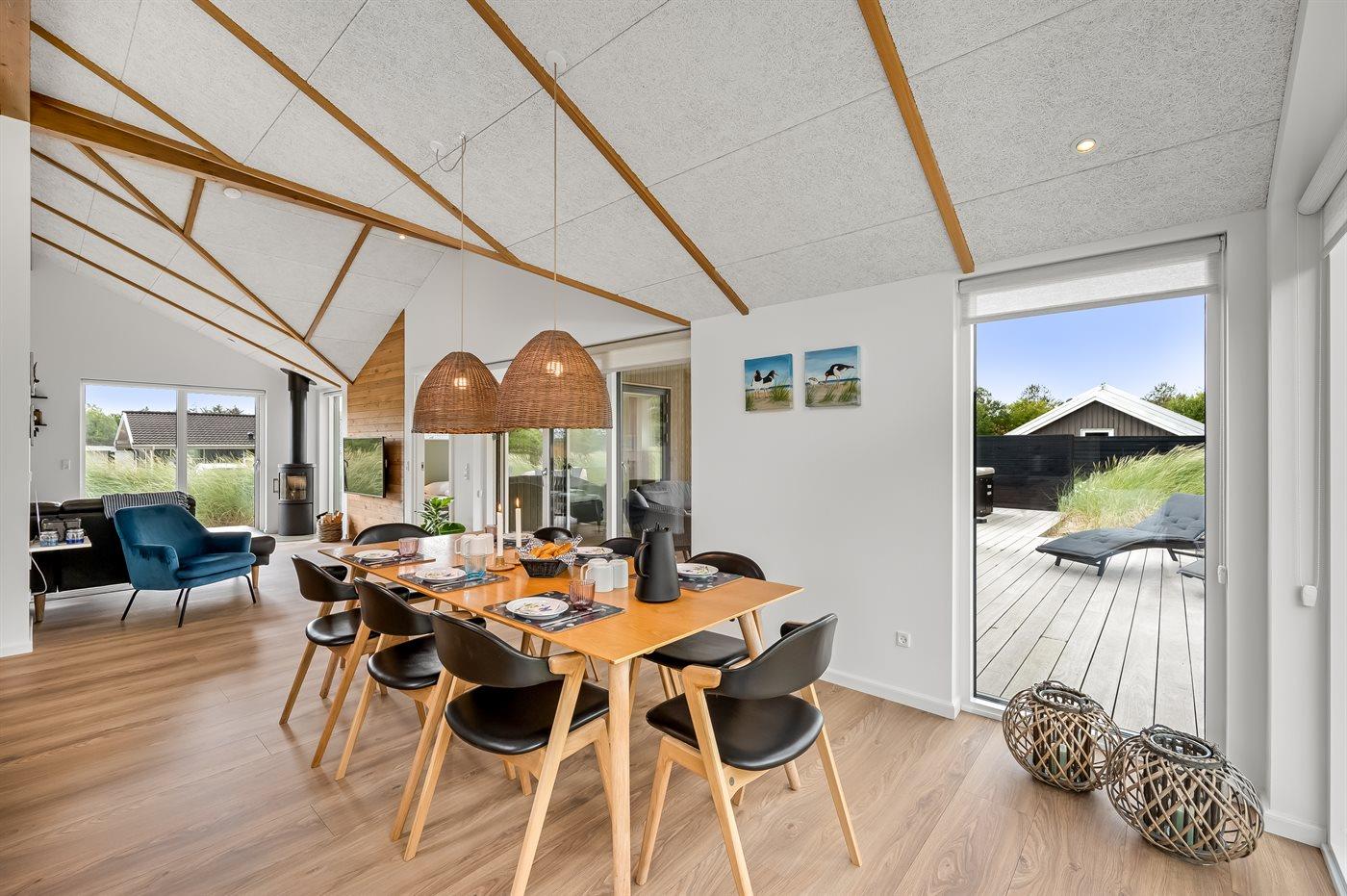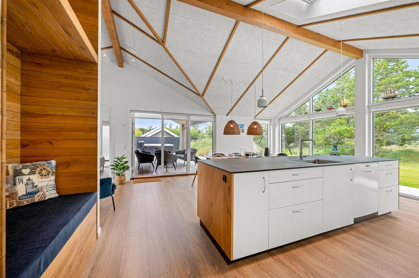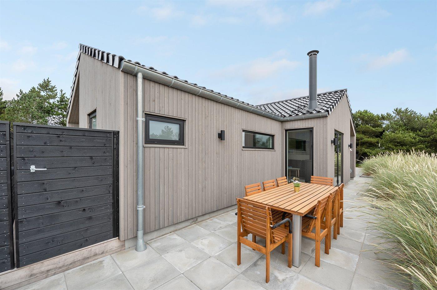 infrarøde terrassevarmer på den overdækkede træterrasse med et glas tempereret vin fra vinkøleren. Vælger man en tur i udespaen om aftenen, kan man året rundt nyde synet af det standhaftige fyrretræ, som kan oplyses på grunden om aftenen. Der er 1800 m til havet. Nærmeste forretning er beliggende i en gåafstand af 800 m. Sommerhuset egner sig til 8 personer samt 1 barn op til 3 år. Ferieboligen er på 170 m² og er bygget i 2021. Ferieboligen er udstyret med 1 energibesparende varmepumpe. Hele ferieboligen har gulvvarme. Køkkenet er udstyret med køleskab, induktionskogeplader, varmluftovn, mikrobølgeovn, vinkøler samt opvaskemaskine. Ferieboligen har særskilt vaskerum med vaskemaskine, tørretumbler og en fryser med en kapacitet på 50 liter. Der er desuden brændeovn. Til de små er der 1 stk. barnestol, gynge og sandkasse. I aktivitetsrummet er der: poolbord, bordtennis og shuffleboard. Der er i alt 4 soveværelser. Sovepladserne fordeler sig på: 6 sovepladser i