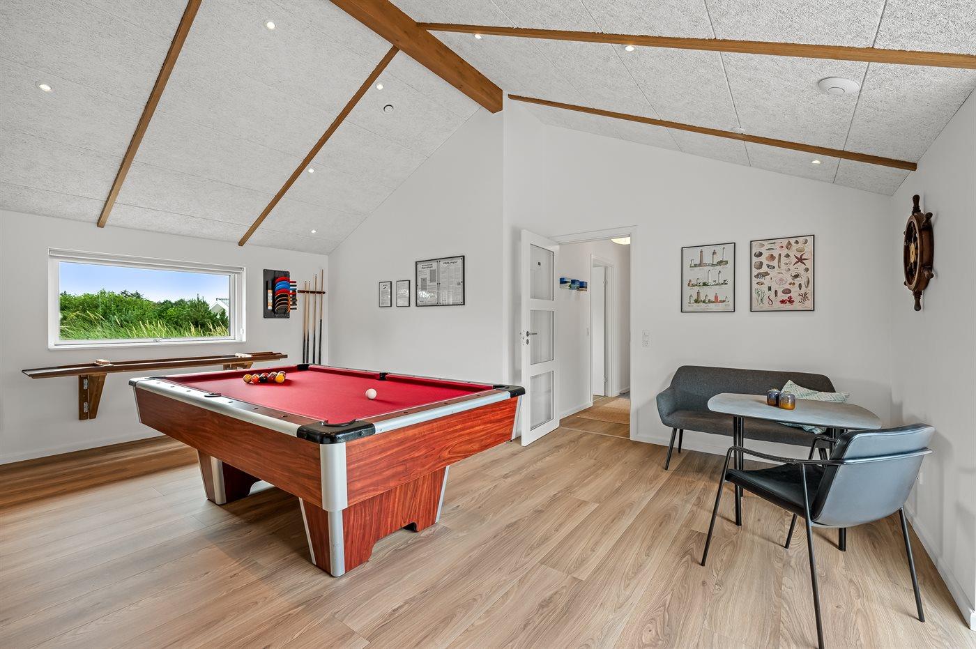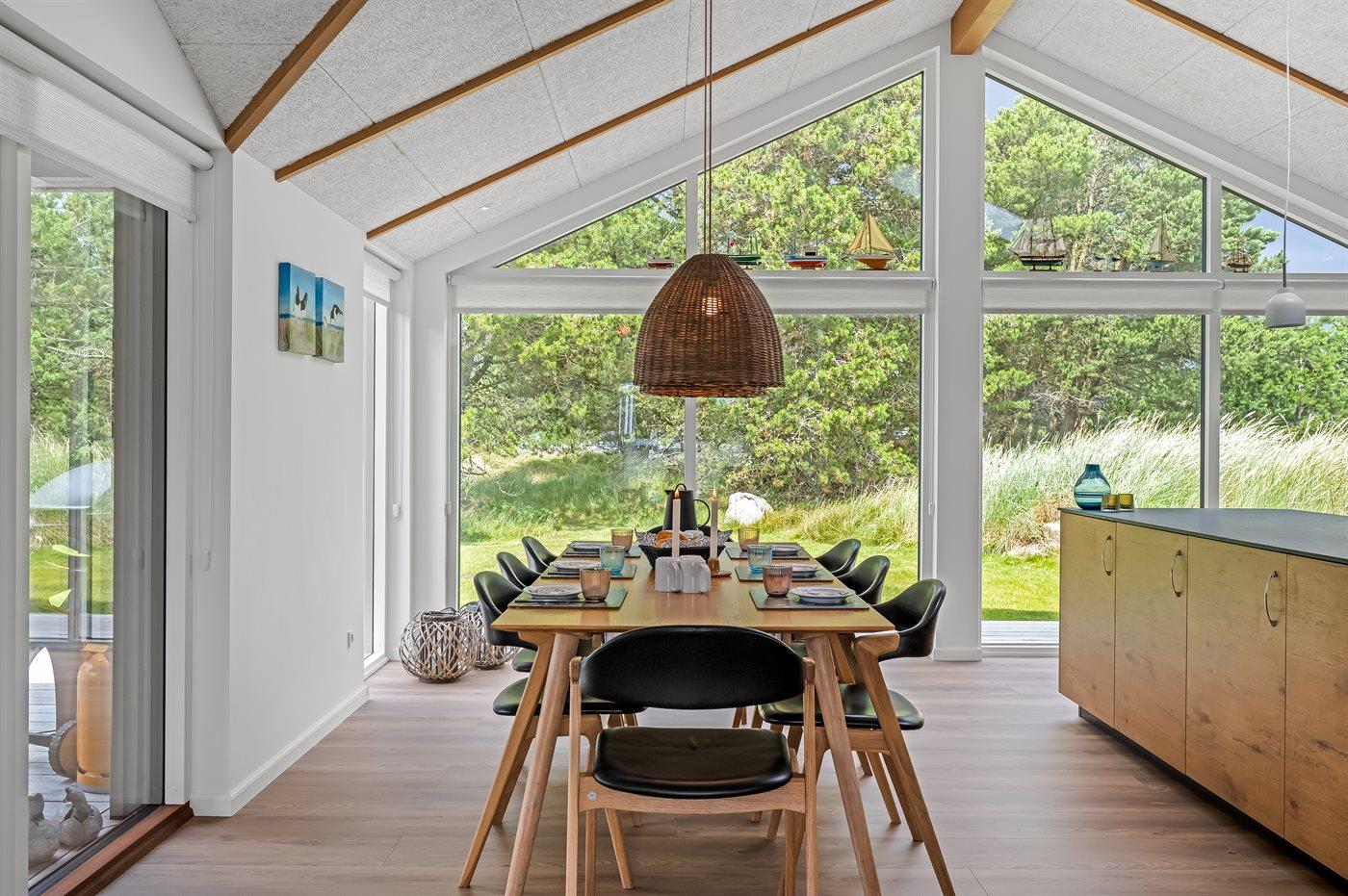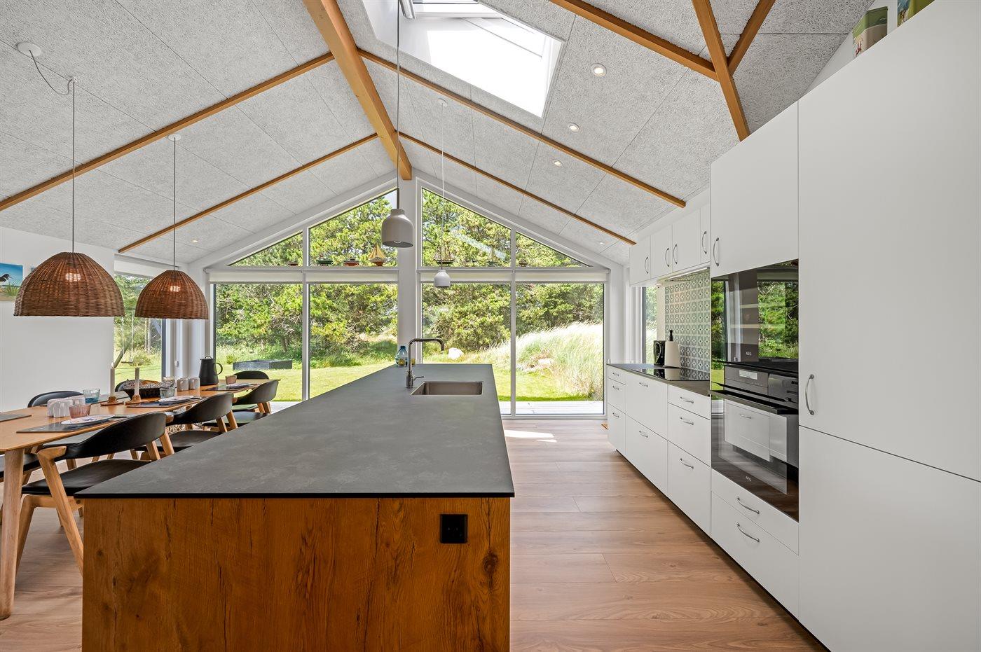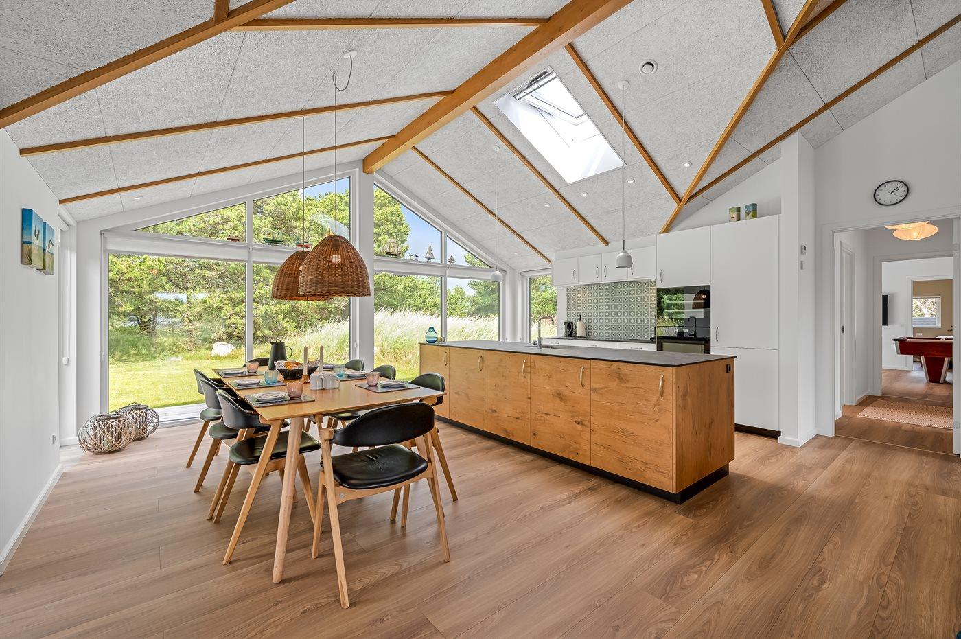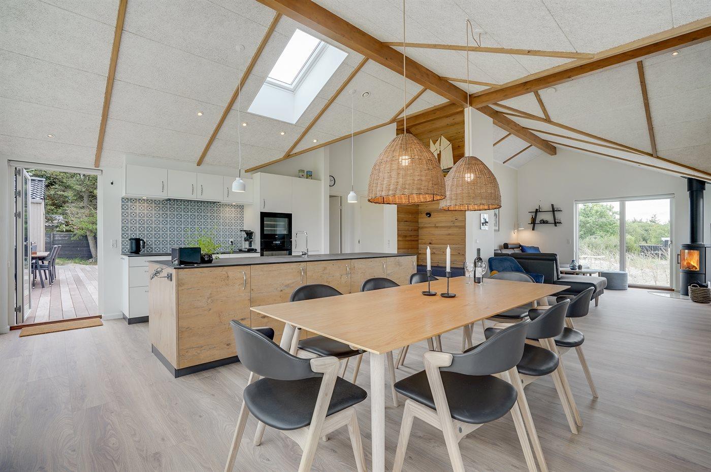 infrarøde terrassevarmer på den overdækkede træterrasse med et glas tempereret vin fra vinkøleren. Vælger man en tur i udespaen om aftenen, kan man året rundt nyde synet af det standhaftige fyrretræ, som kan oplyses på grunden om aftenen. Der er 1800 m til havet. Nærmeste forretning er beliggende i en gåafstand af 800 m. Sommerhuset egner sig til 8 personer samt 1 barn op til 3 år. Ferieboligen er på 170 m² og er bygget i 2021. Ferieboligen er udstyret med 1 energibesparende varmepumpe. Hele ferieboligen har gulvvarme. Køkkenet er udstyret med køleskab, induktionskogeplader, varmluftovn, mikrobølgeovn, vinkøler samt opvaskemaskine. Ferieboligen har særskilt vaskerum med vaskemaskine, tørretumbler og en fryser med en kapacitet på 50 liter. Der er desuden brændeovn. Til de små er der 1 stk. barnestol, gynge og sandkasse. I aktivitetsrummet er der: poolbord, bordtennis og shuffleboard. Der er i alt 4 soveværelser. Sovepladserne fordeler sig på: 6 sovepladser i