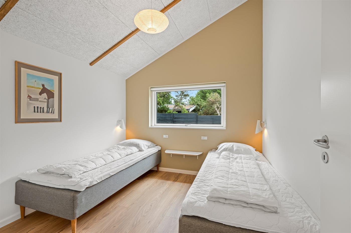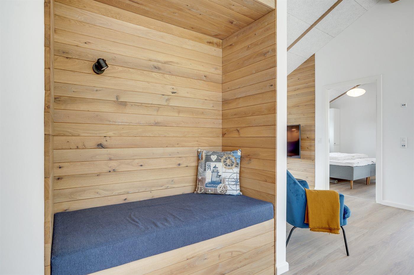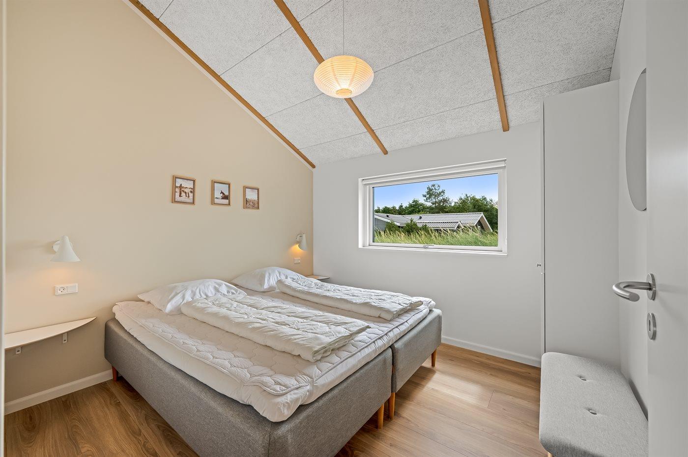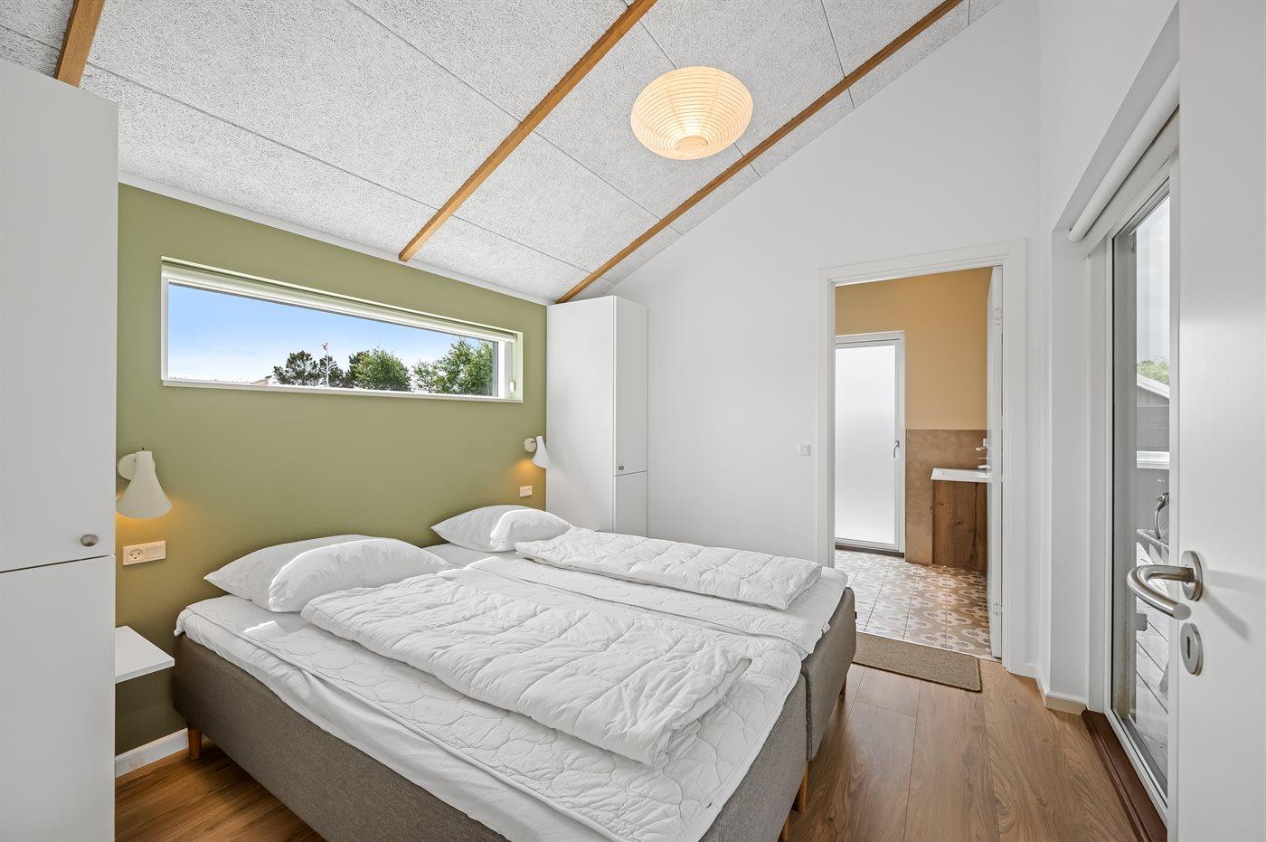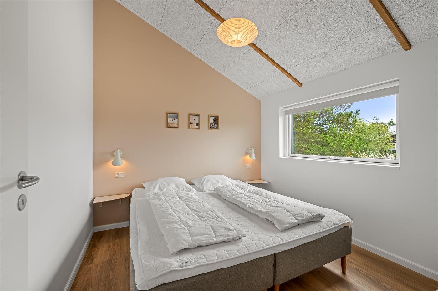 dobbeltsenge og 2 sovepladser i enkeltsenge. Derudover er der 1 stk. barneseng. Der er 2 badeværelser med bruseniche, gulvvarme, natbelysning og 2 toiletter. I ferieboligen er der 2 Smart-TV og 1 Bluetooth-højtaler. Der er mindst 4 danske kanaler. 1-3 svenske kanaler. 1-3 norske kanaler. Mindst 4 tyske kanaler. Der er trådløst internet til rådighed. Der er et redskabsrum og en carport med lader-stander til el-biler. Der er