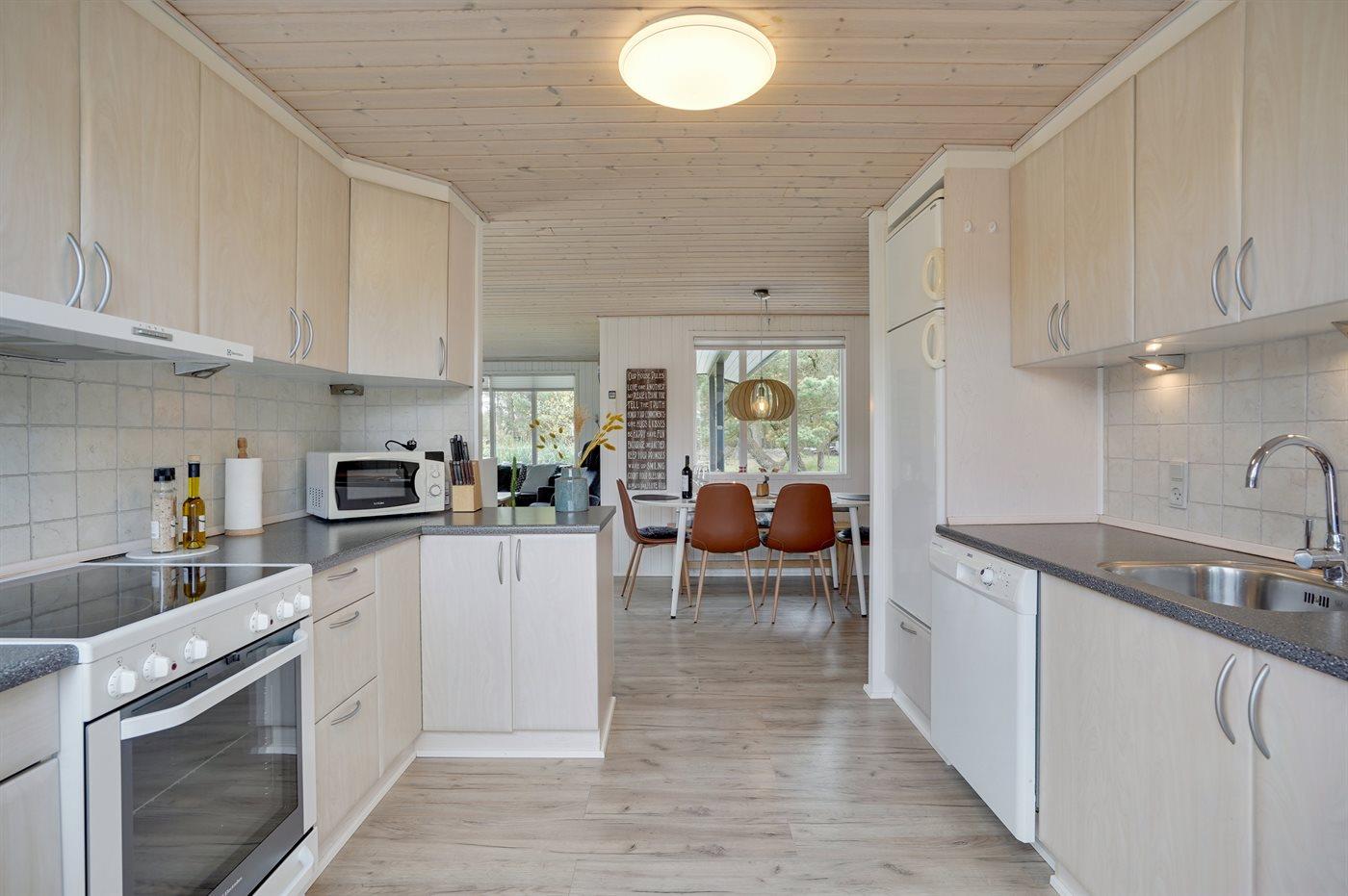 Køkkenet er udstyret med 1 køleskab. Der er 4 keramiske kogeplader, varmluftovn, mikrobølgeovn samt opvaskemaskine.
