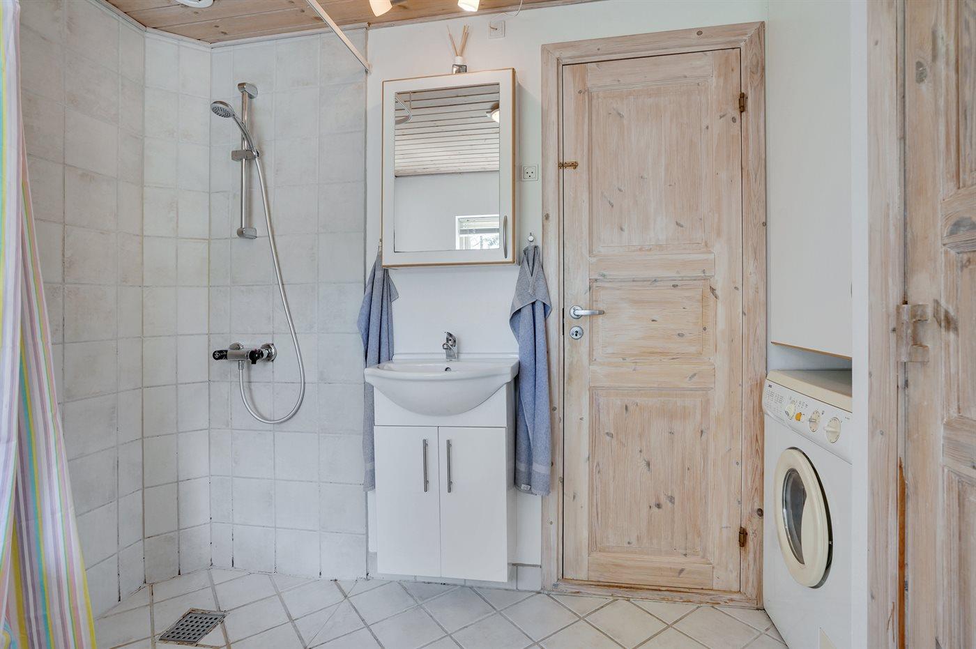 Der er 1 badeværelse med bruseniche og toilet. Der er gulvvarme på badeværelset. Der er mulighed for afslapning i saunaen og i den indendørs spa til 2 personer.