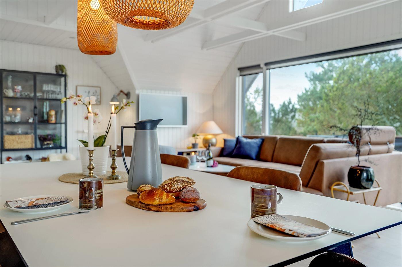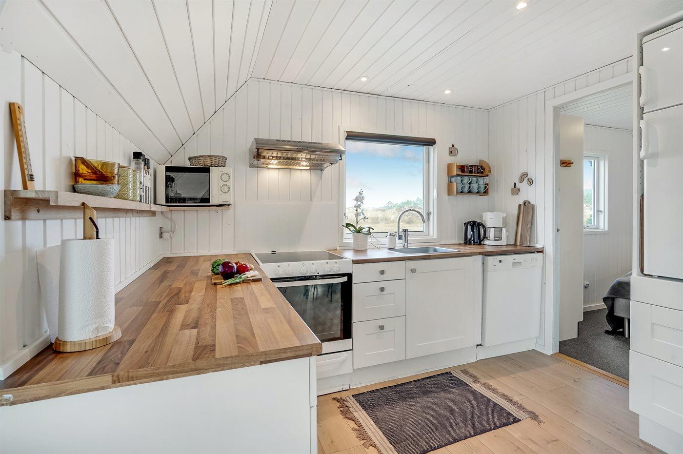 Køkkenet er udstyret med 1 køleskab. Der er 4 elkogeplader, varmluftovn, mikrobølgeovn samt opvaskemaskine.