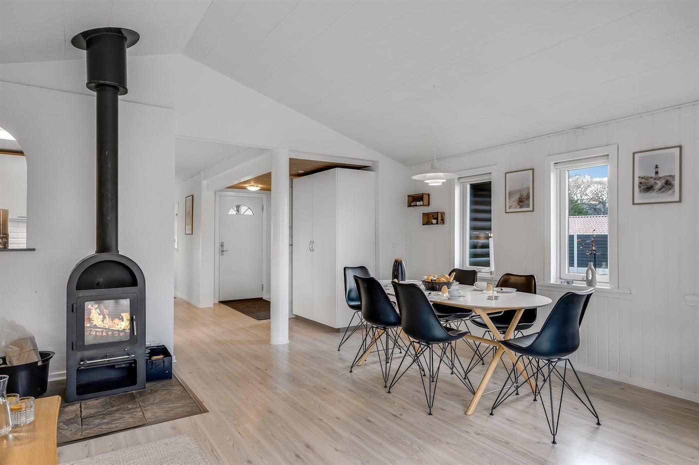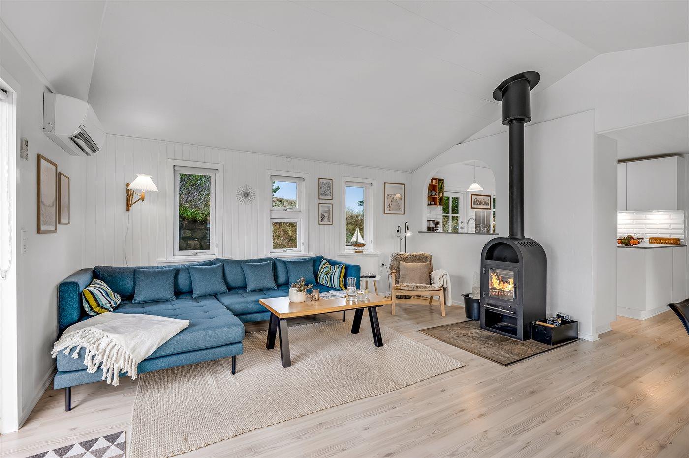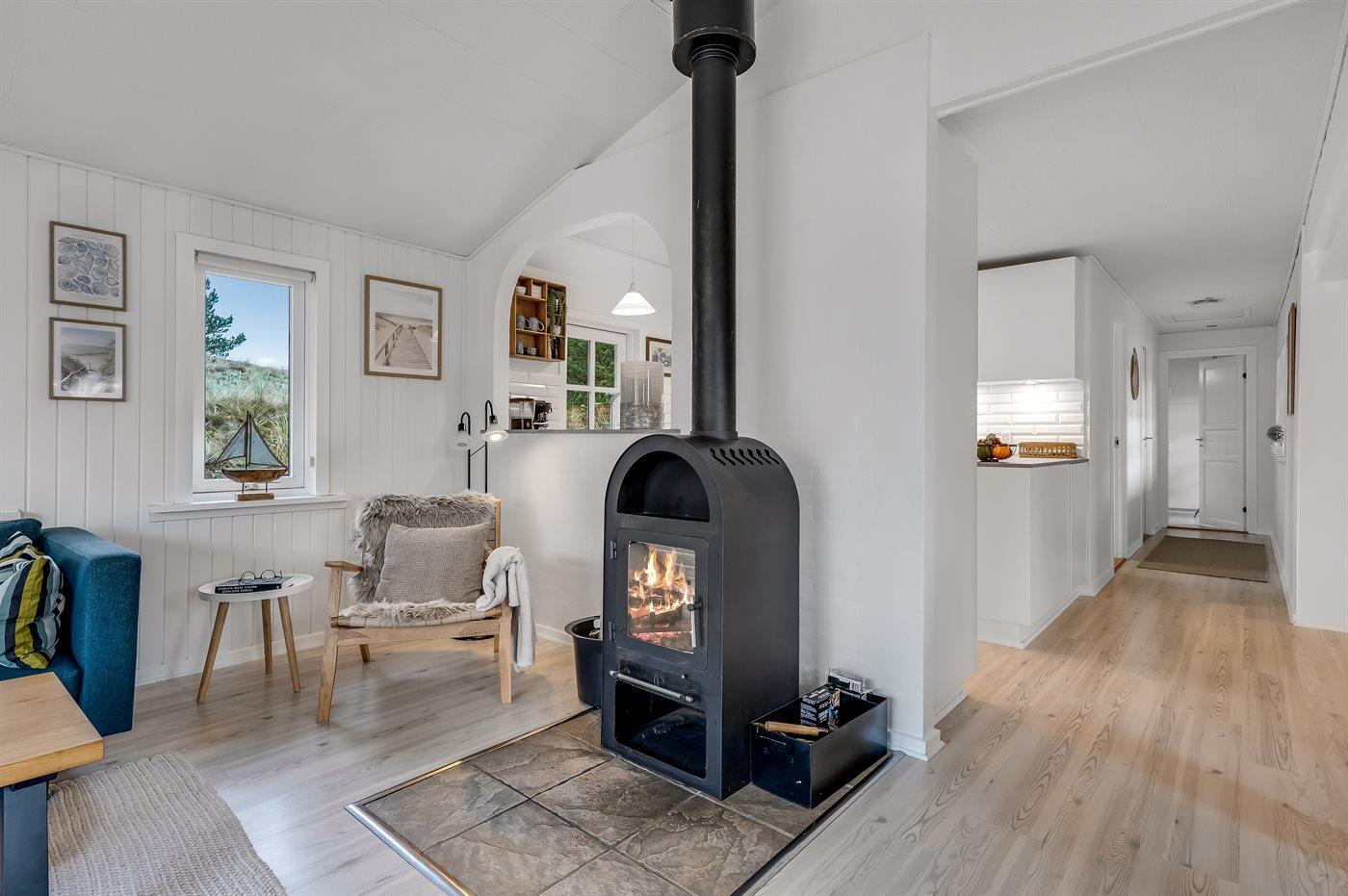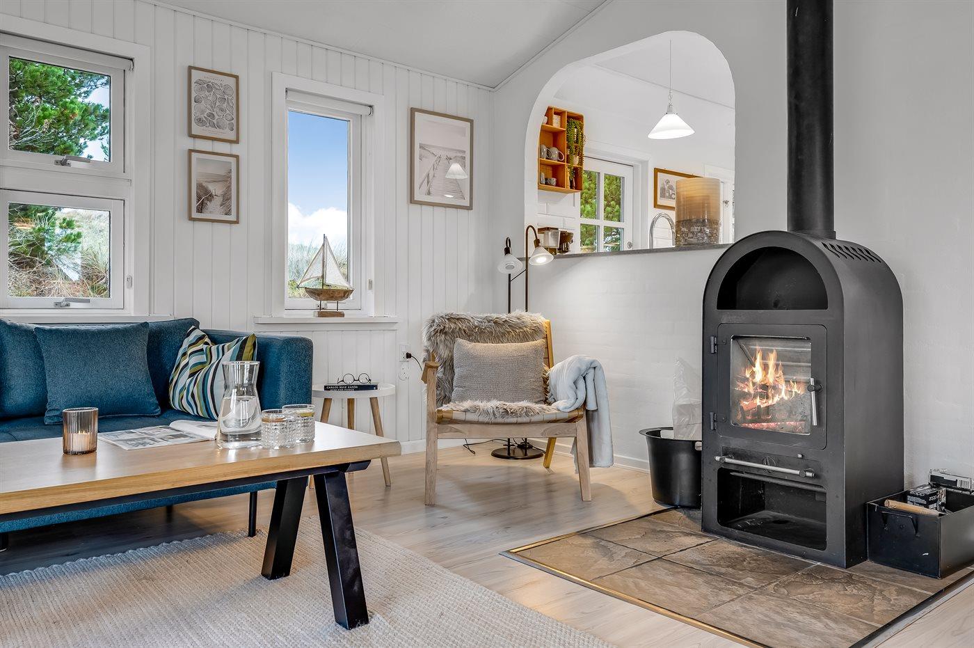 Lyst sommerhus i Blåvand med terrasse, brændeovn og nær centrum i rolige omgivelser.