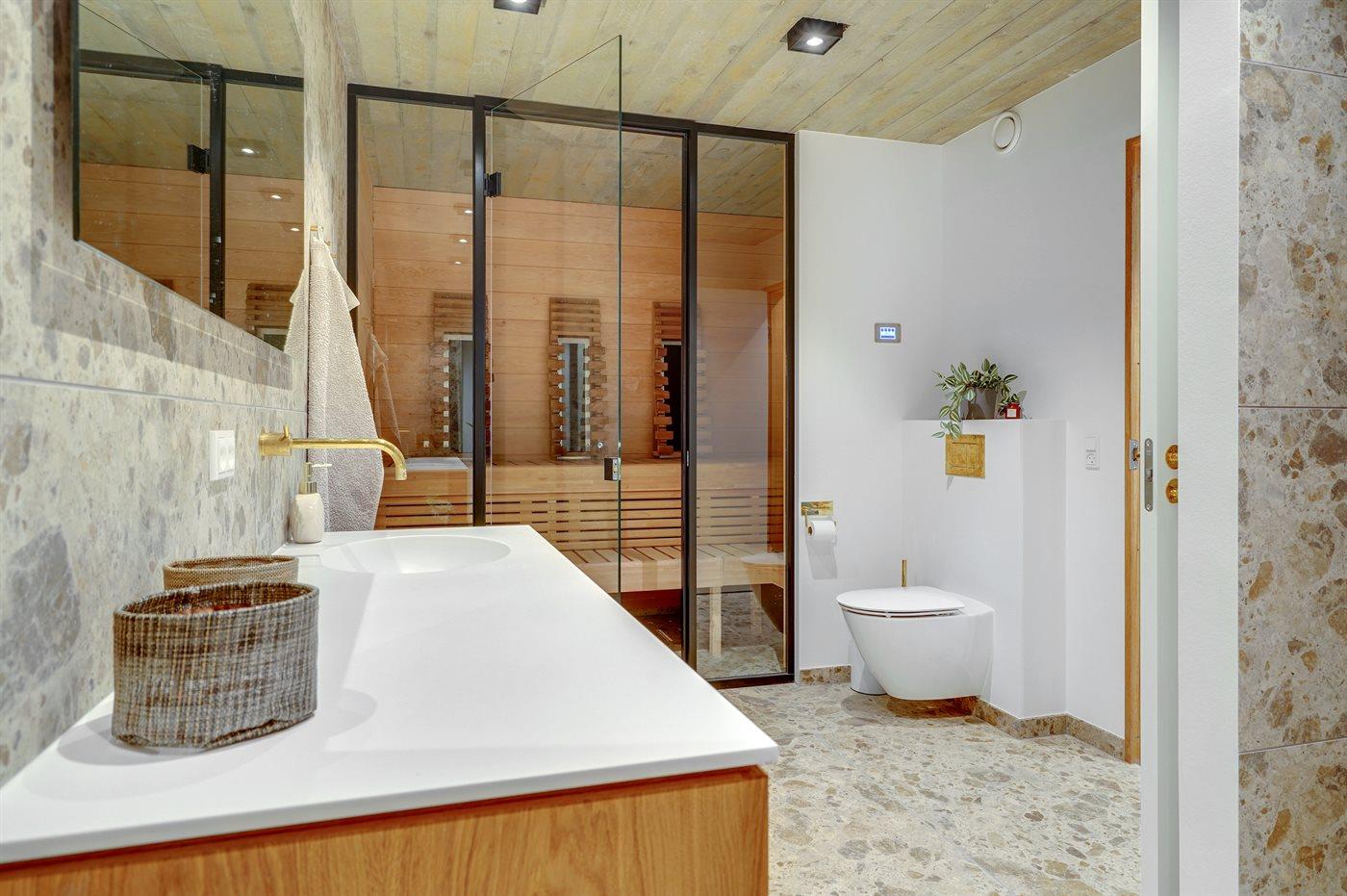 Kælderetagen er indrettet med 2 værelser med dobbeltsenge, stort badeværelse med dobbeltbruser, der ligger i forbindelse og har adgang til infrarød sauna. Desuden er der opholdsrum med poolbord og teknikrum med vaskemaskine, tørretumbler og 250 liter fryser. I kælderen har I mulighed for at få adgang til husets vinrum, gå på opdagelse for smagssanserne.