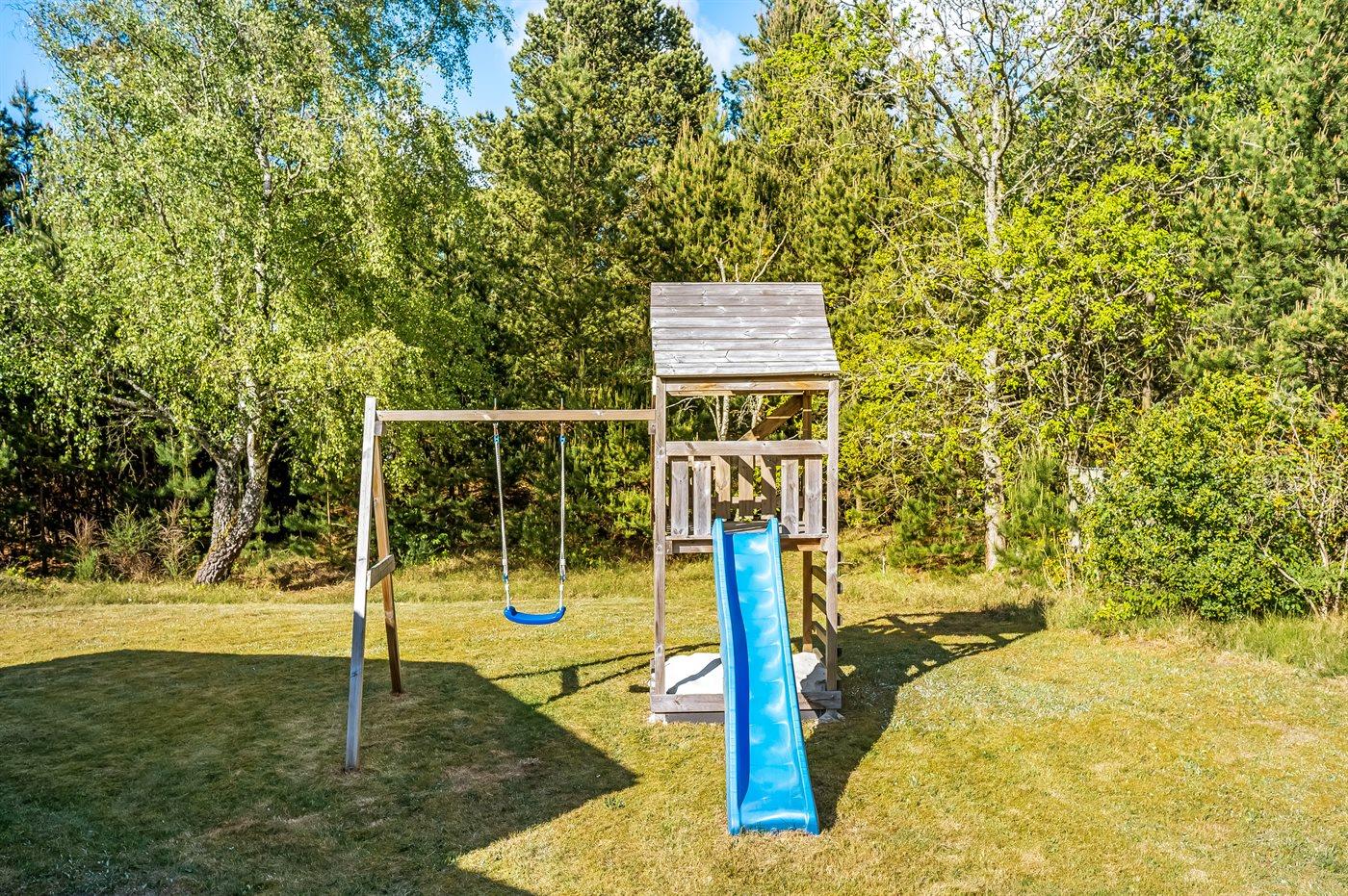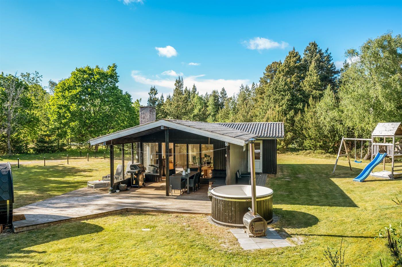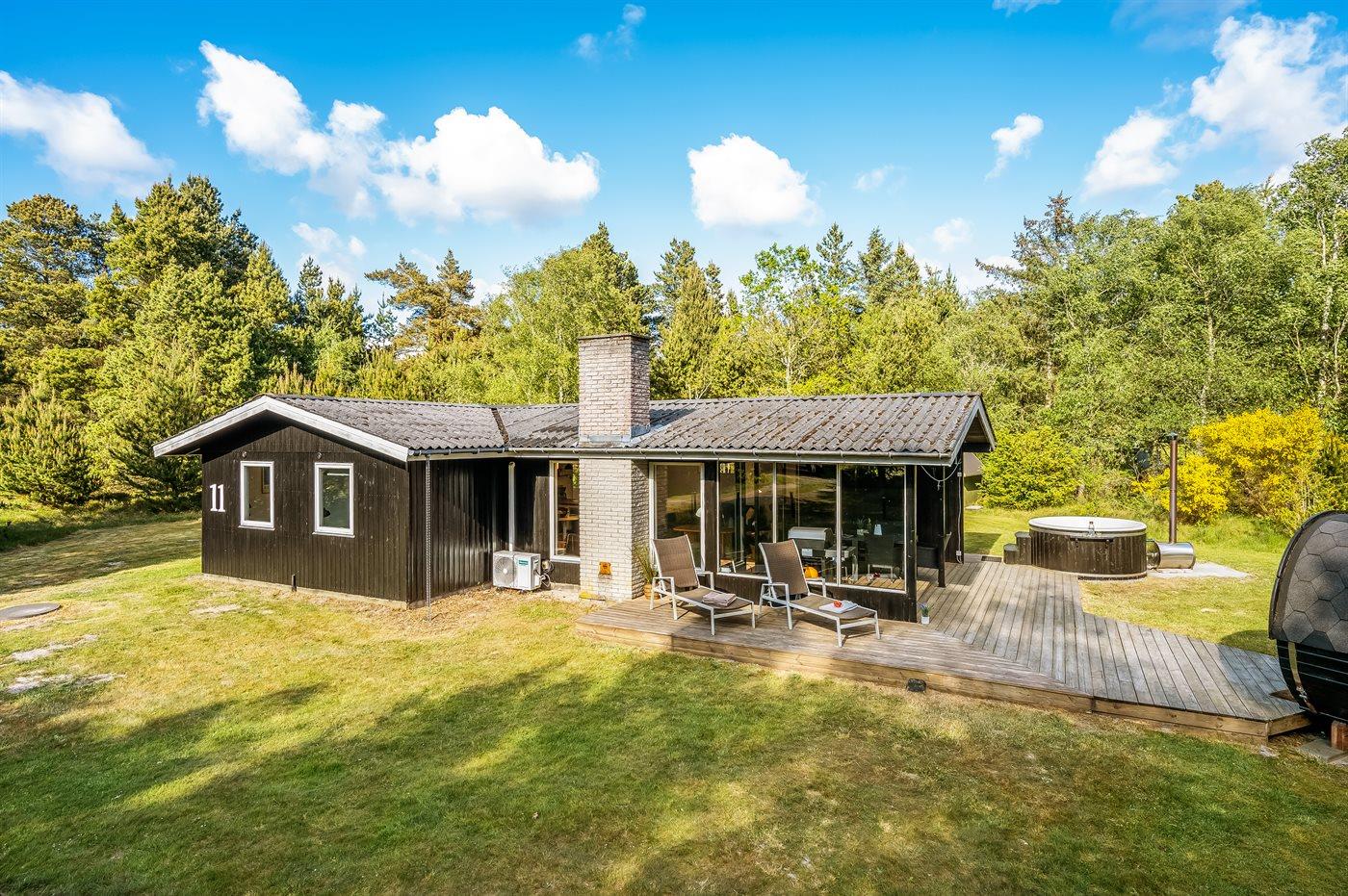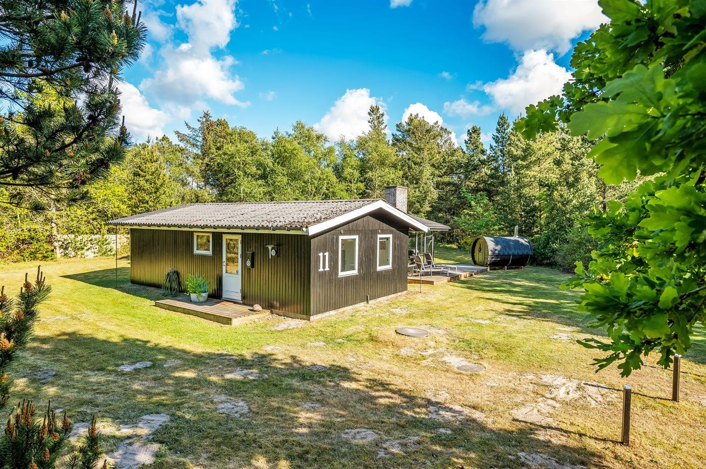 Sommerhuset ligger på en mere end 2.800 kvadratmeter stor naturgrund for enden af en blind vej, med høje træer, der giver en fornemmelse af, at man er alene i naturen samt skærmer grunden og sørger for læ og privatliv. Her midt i den vestjyske natur, kan I forkæle jer selv med en tur i saunaen eller ved at tænde op i vildmarksbadet og tilbringe en aften i det varme vand under stjernehimlen. Rundt om sommerhuset er der flere terrasser og hyggelige siddekroge – blandt andet en overdækket. Til de yngste findes der sandkasse, gyngestativ og legetårn.