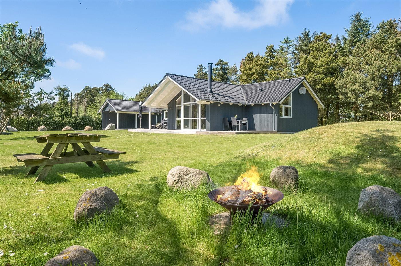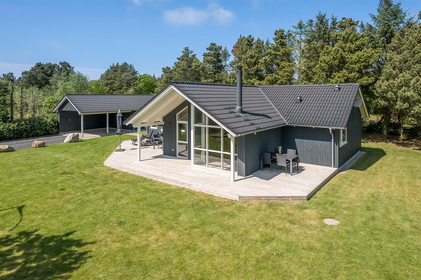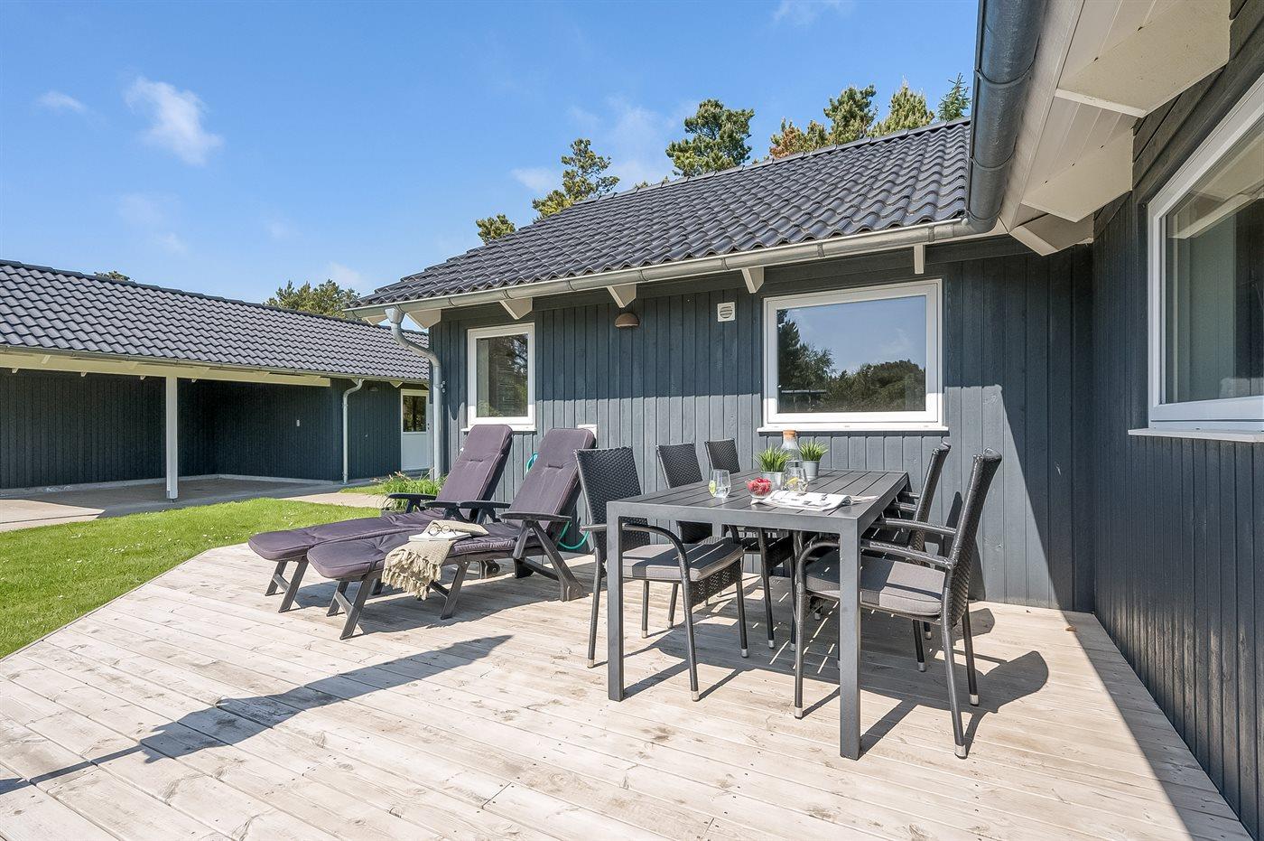 Ferieboligen er beliggende på en 1500 m² stor naturgrund. Der er 600 m til havet. Nærmeste forretning er beliggende i en afstand af 600 m. Til ferieboligen hører åbent terrasseareal. Desuden er der overdækket terrasse. Der er redskabsrum. Gynge. Sandkasse. Der er carport til rådighed. Parkering ved ferieboligen.
