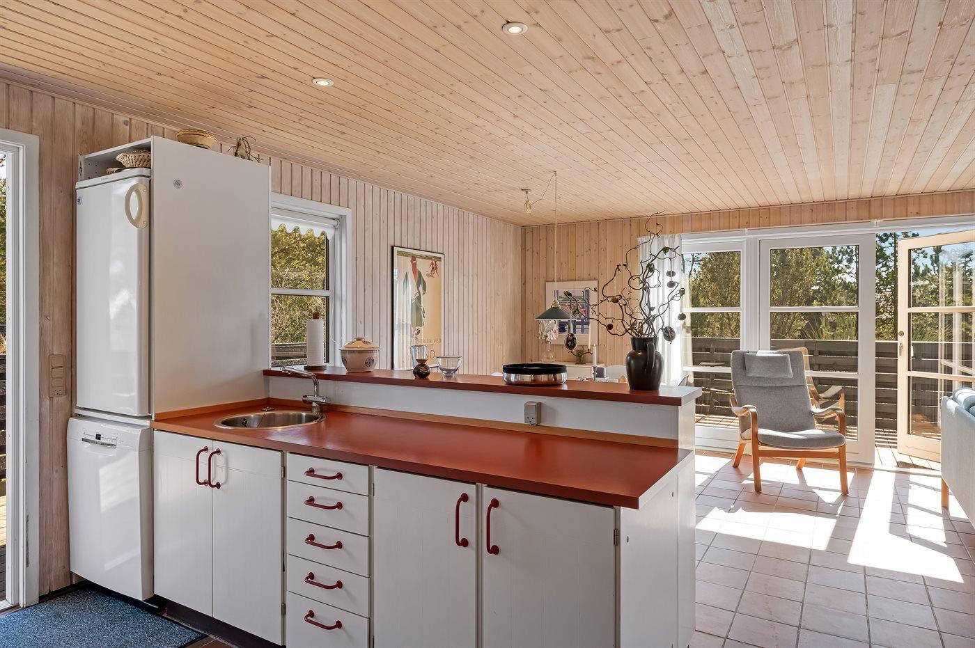 Køkkenet er udstyret med 1 køleskab. Der er 4 keramiske kogeplader, varmluftovn, mikrobølgeovn samt opvaskemaskine.