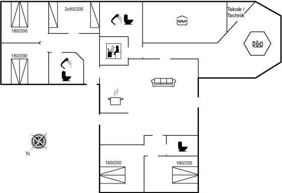 Der er i alt 5 soveværelser. Sovepladserne fordeler sig på: 8 sovepladser i dobbeltsenge. 2 sovepladser i enkeltsenge.